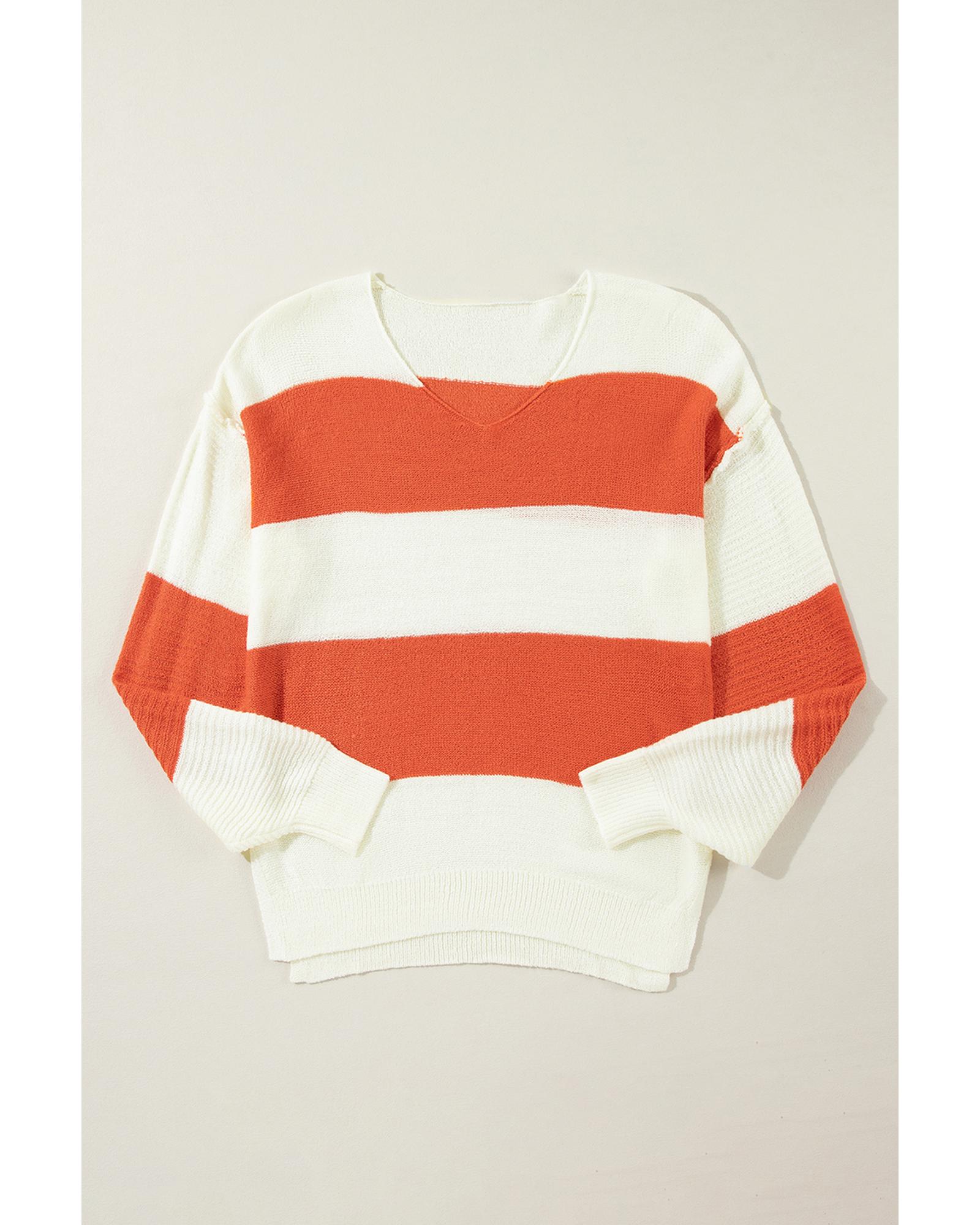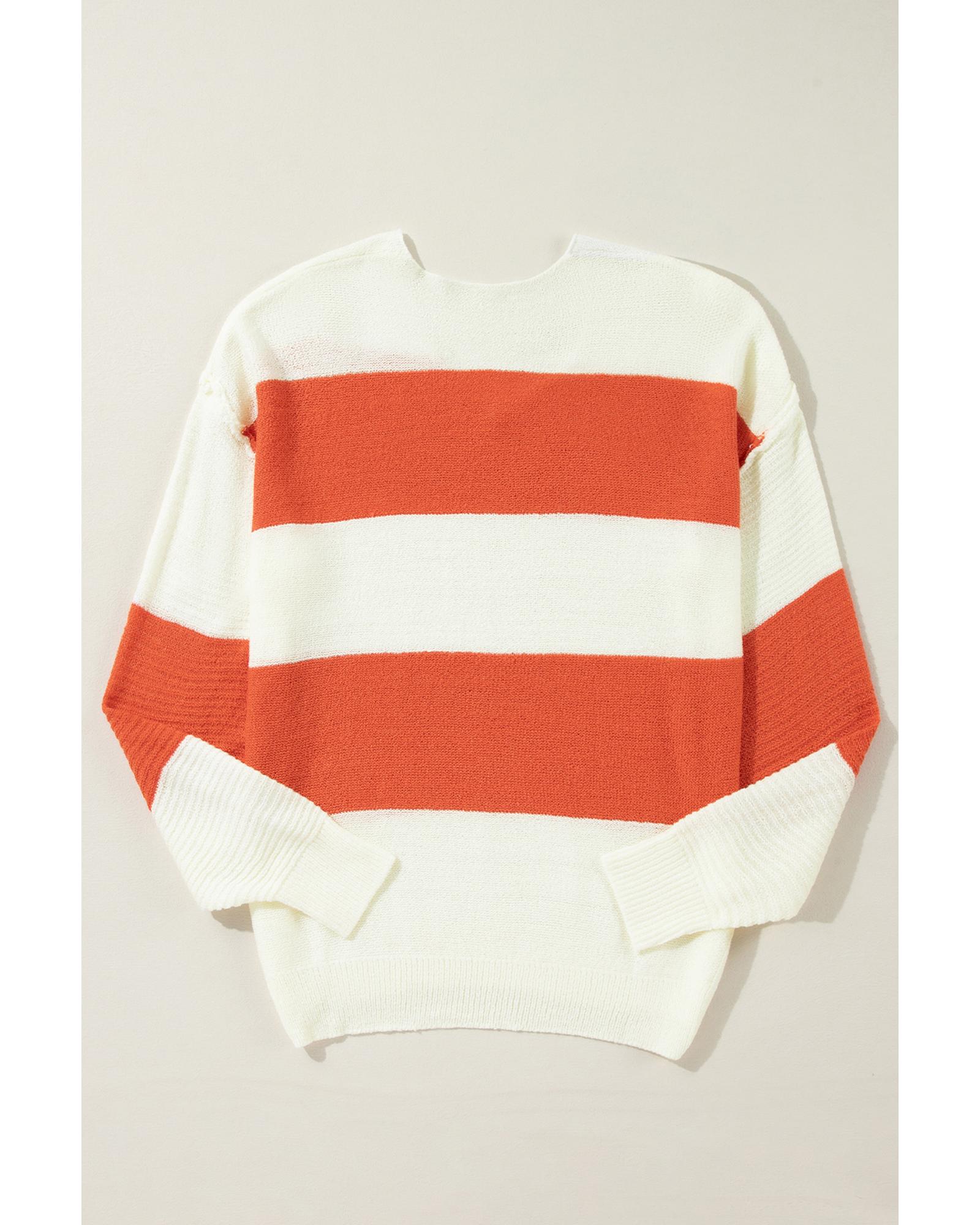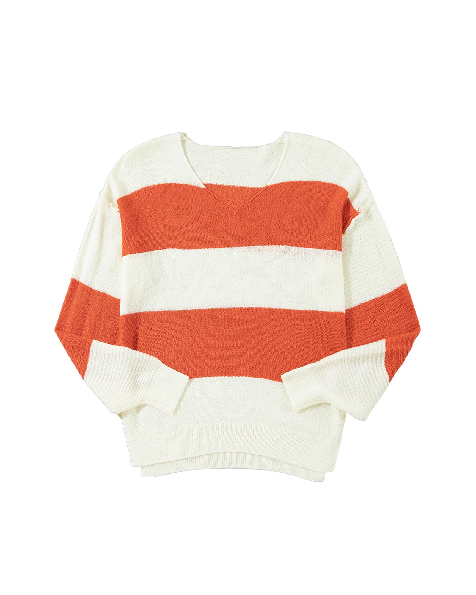 Orange Stripe Loose Color Block Drop Shoulder Bubble Sleeve Sweater – L