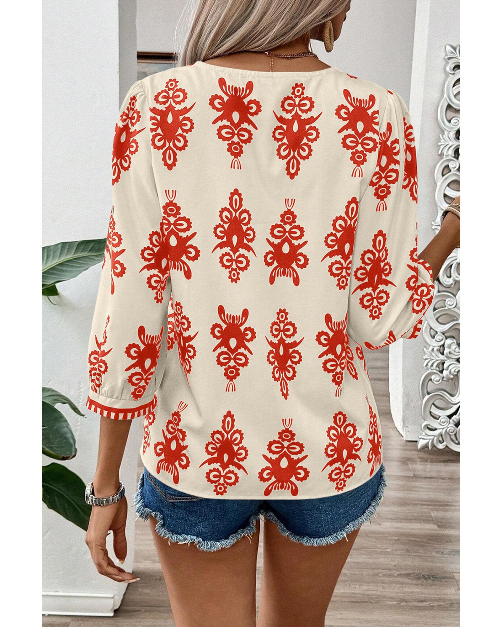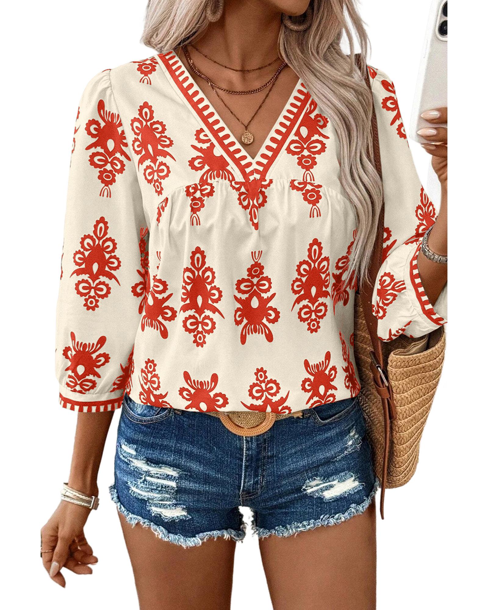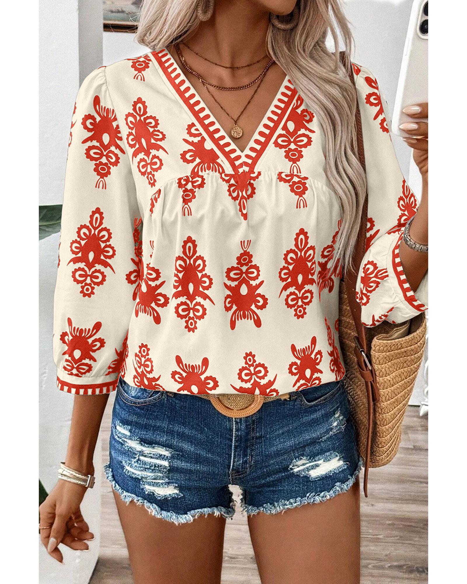 Orange Vintage Geometric Printed 3/4 Sleeve V Neck Blouse – M