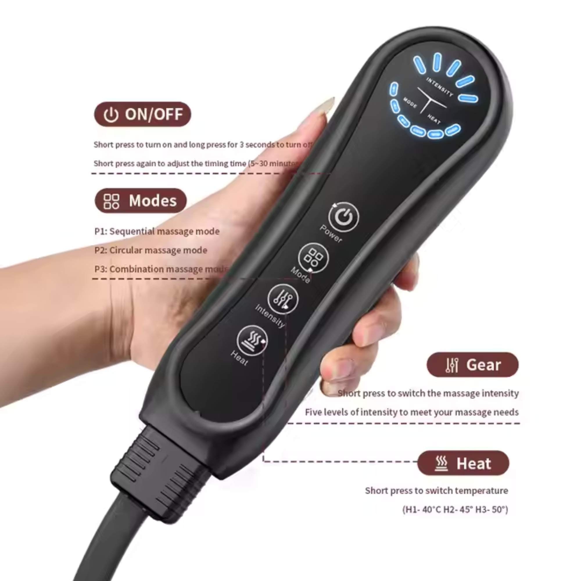 • Massage Modes: 3 Modes (Sequential, Circular, Full Coverage)
