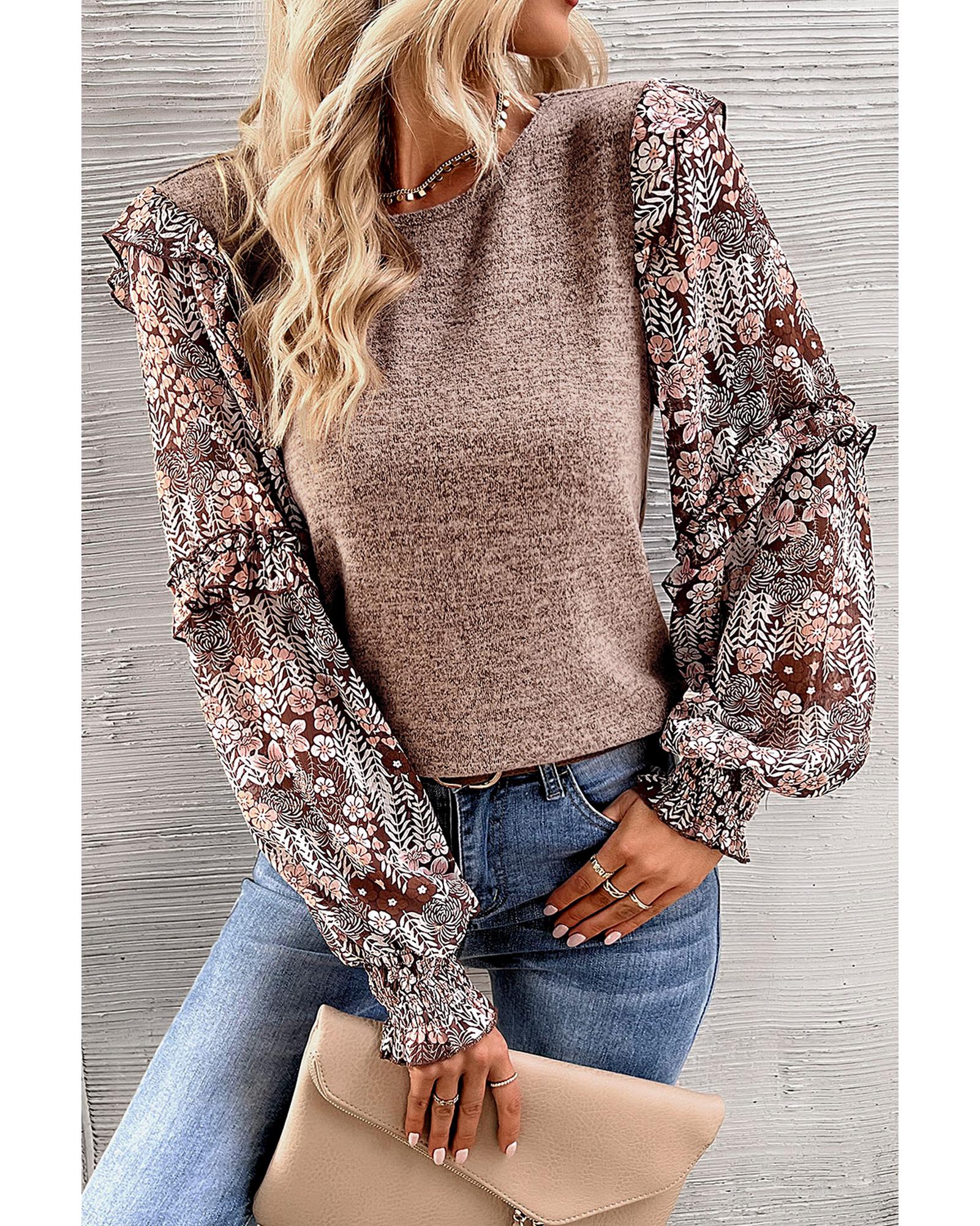 Pale Chestnut Ruffle Tiered Floral Sleeve Crew Neck Blouse – L