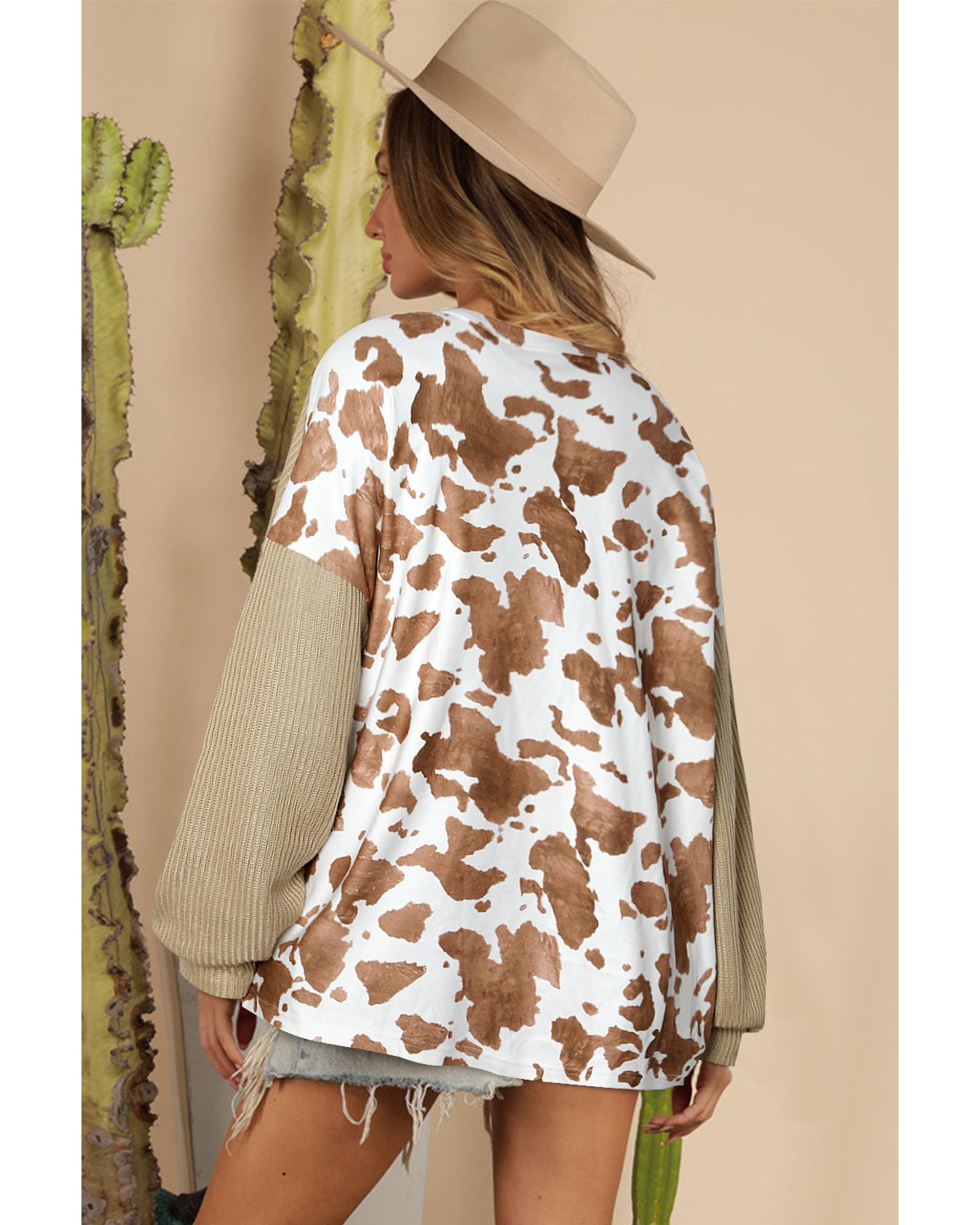 Pale Khaki Animal Print Textured Patch Lantern Sleeve Henley Blouse – M