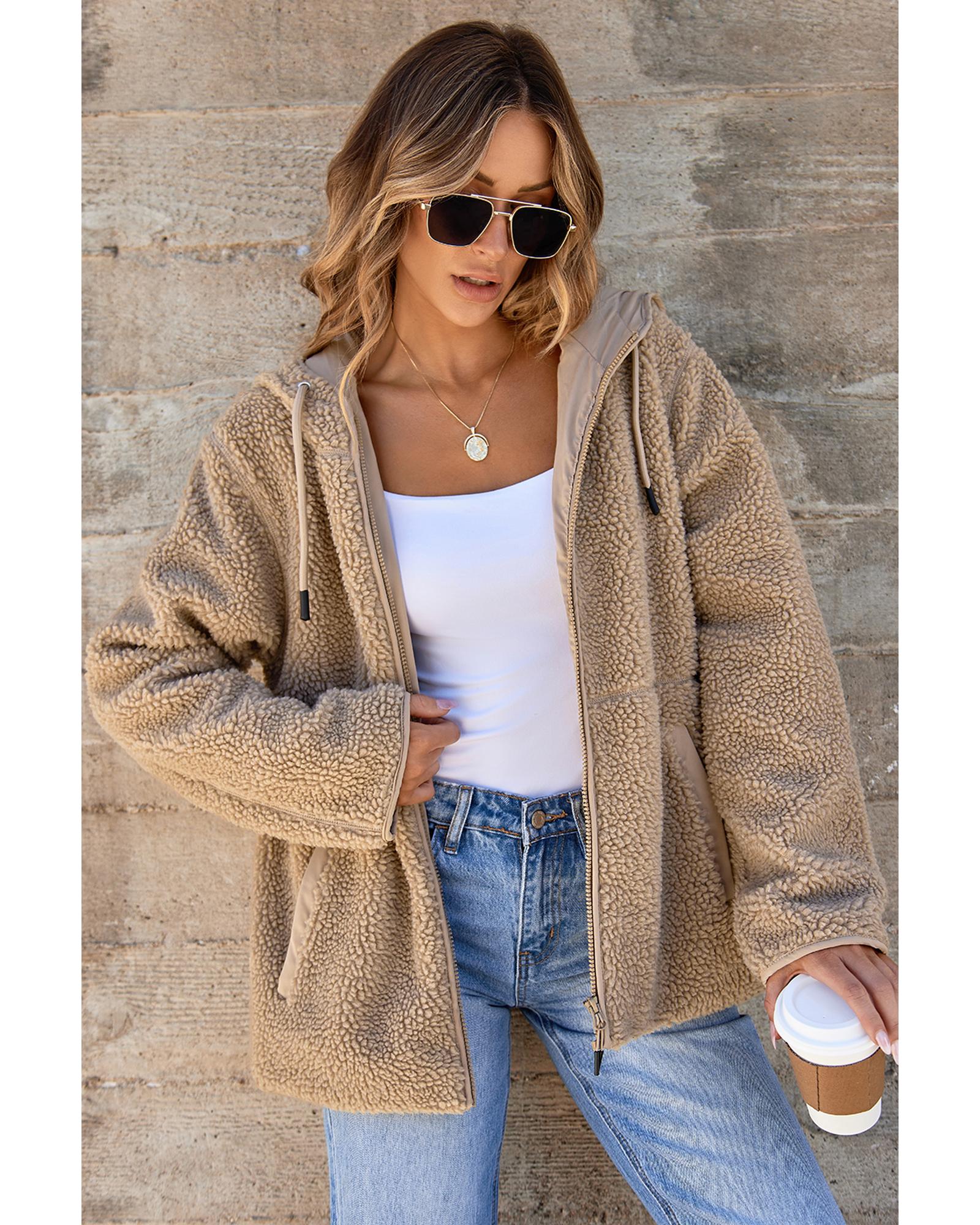 - Pale Khaki Fleece Zip Up Drawstring Hooded Pocketed Jacket