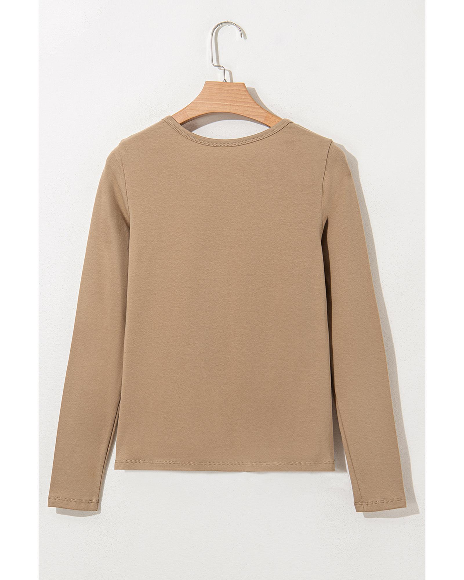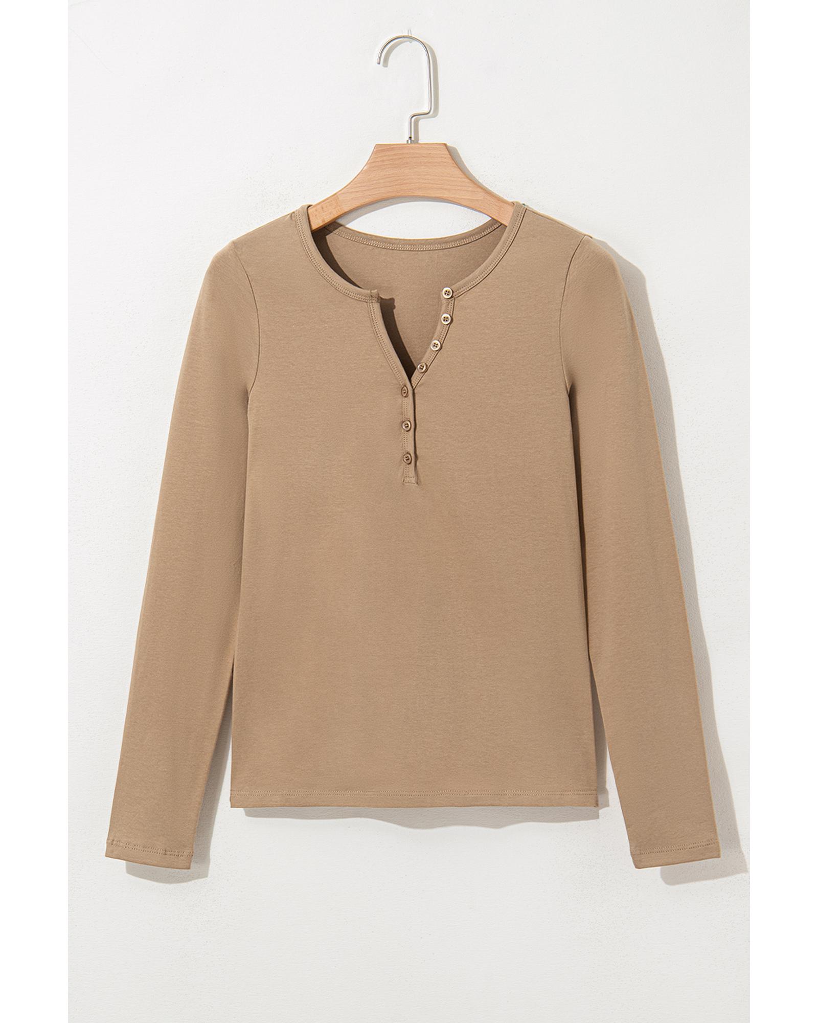 Pale Khaki Long Sleeve Buttons V Neck Slim Fit Top – M