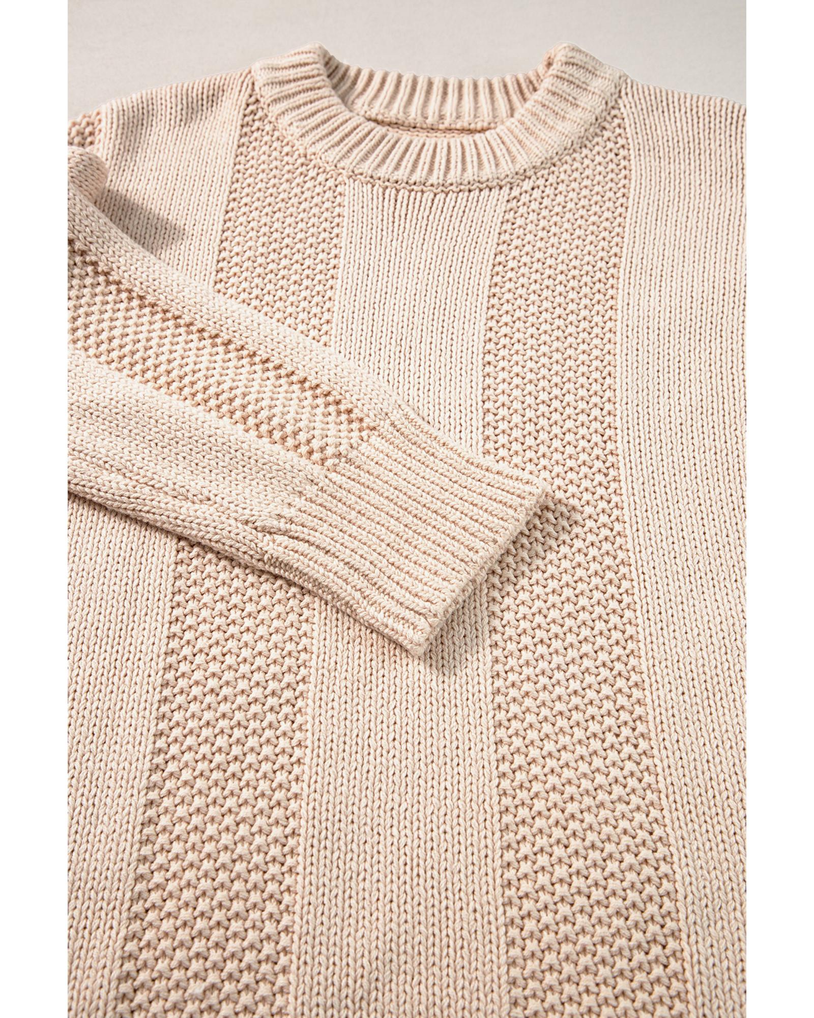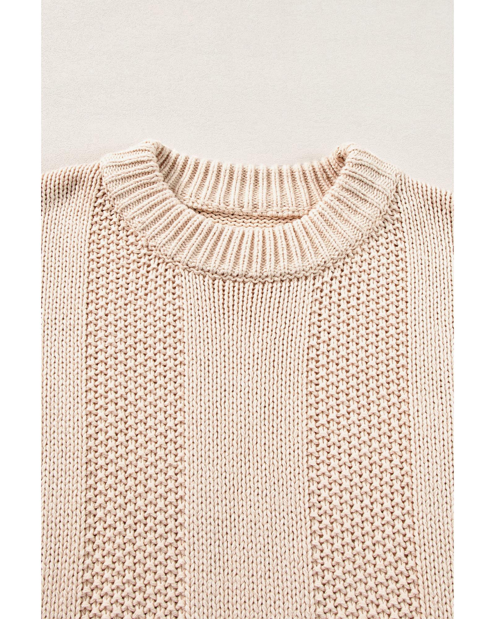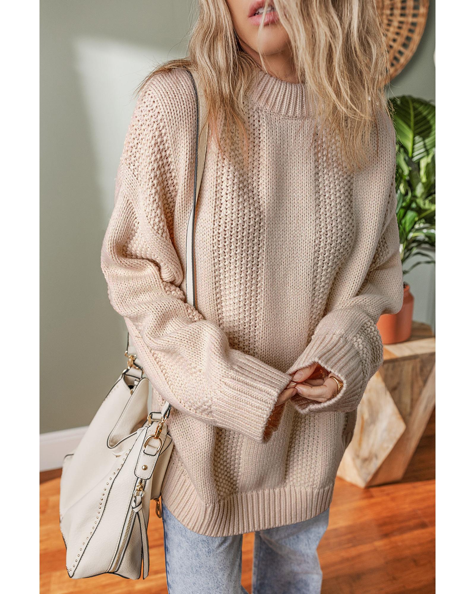 Pale Khaki Solid Color Cable Knit Ribbed Loose Sweater - L