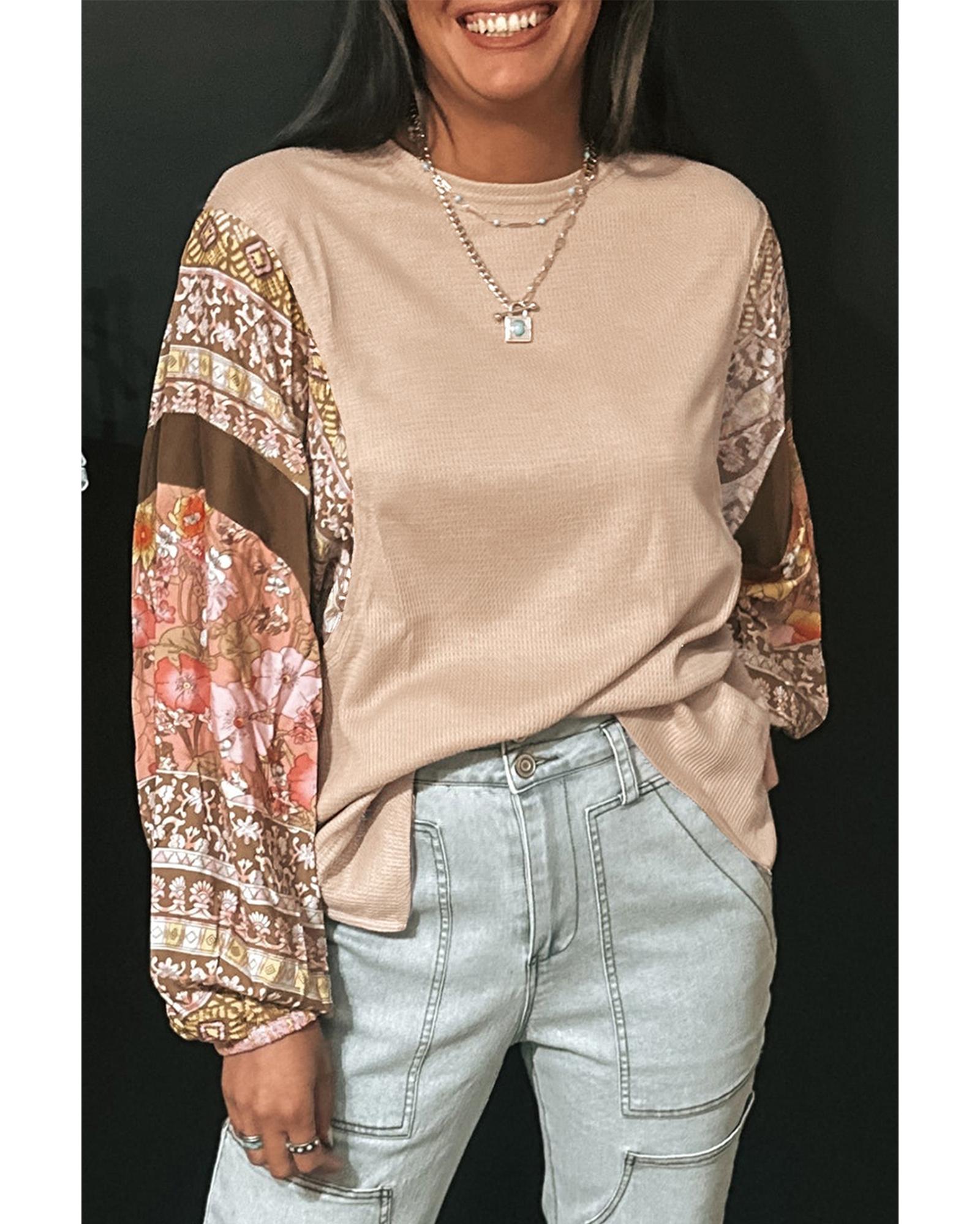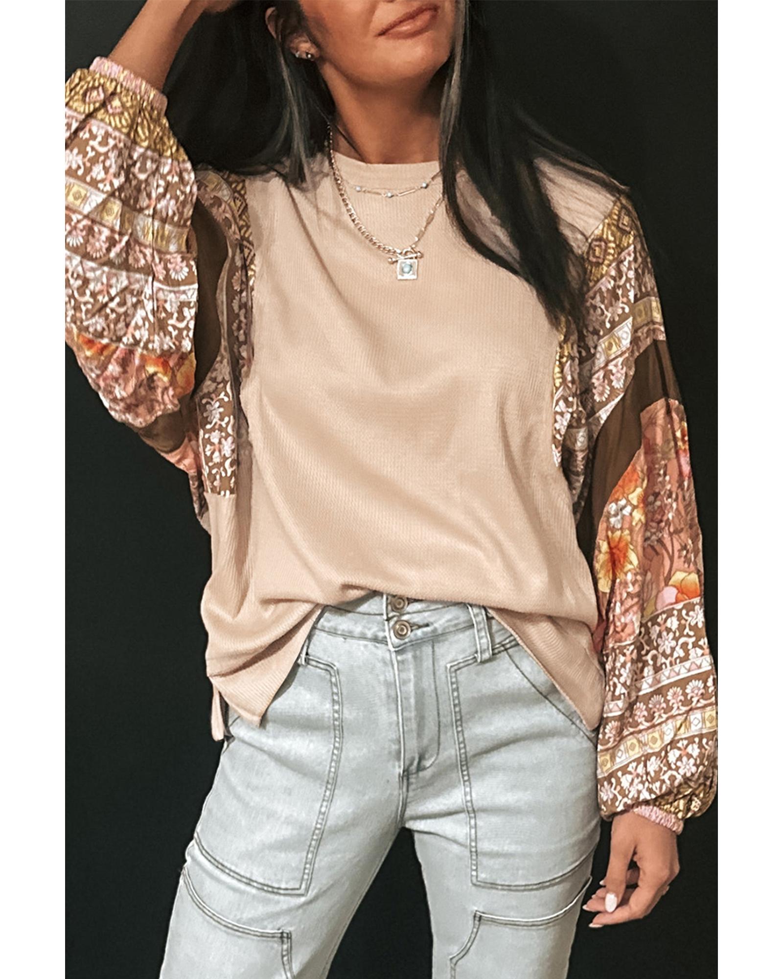 Parchment Contrast Floral Patchwork Puff Sleeve Waffle Knit Top – M