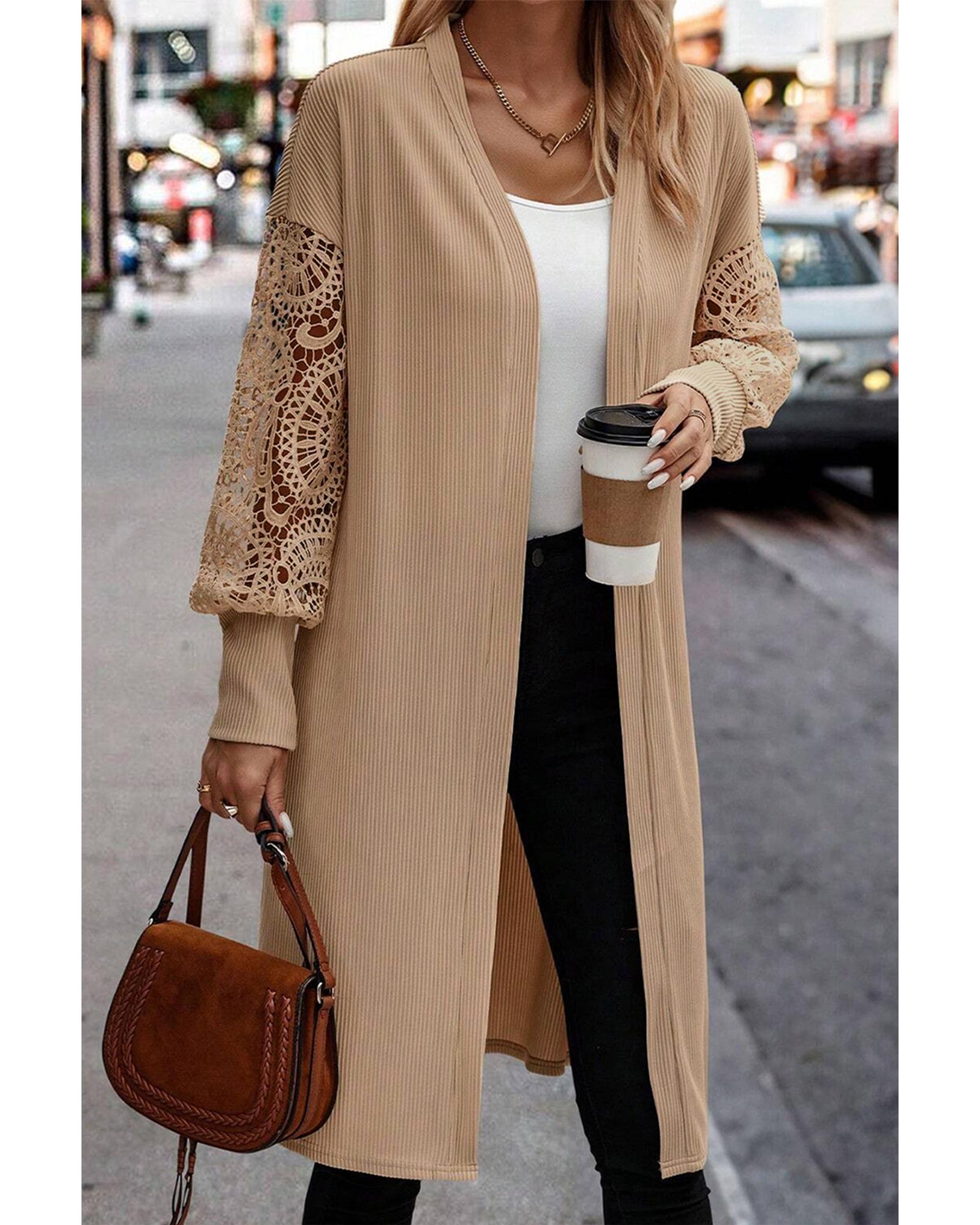 Parchment Lace Patchwork Ribbed Knit Open Front Duster Cardigan – S