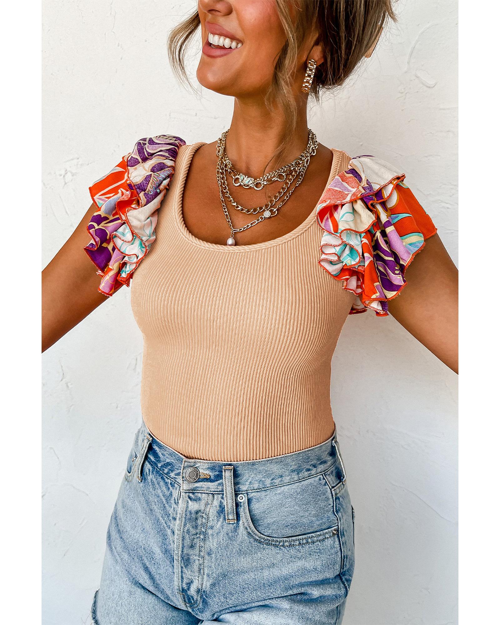 Parchment Ribbed Knit Tiered Ruffled Sleeve Bodysuit – L