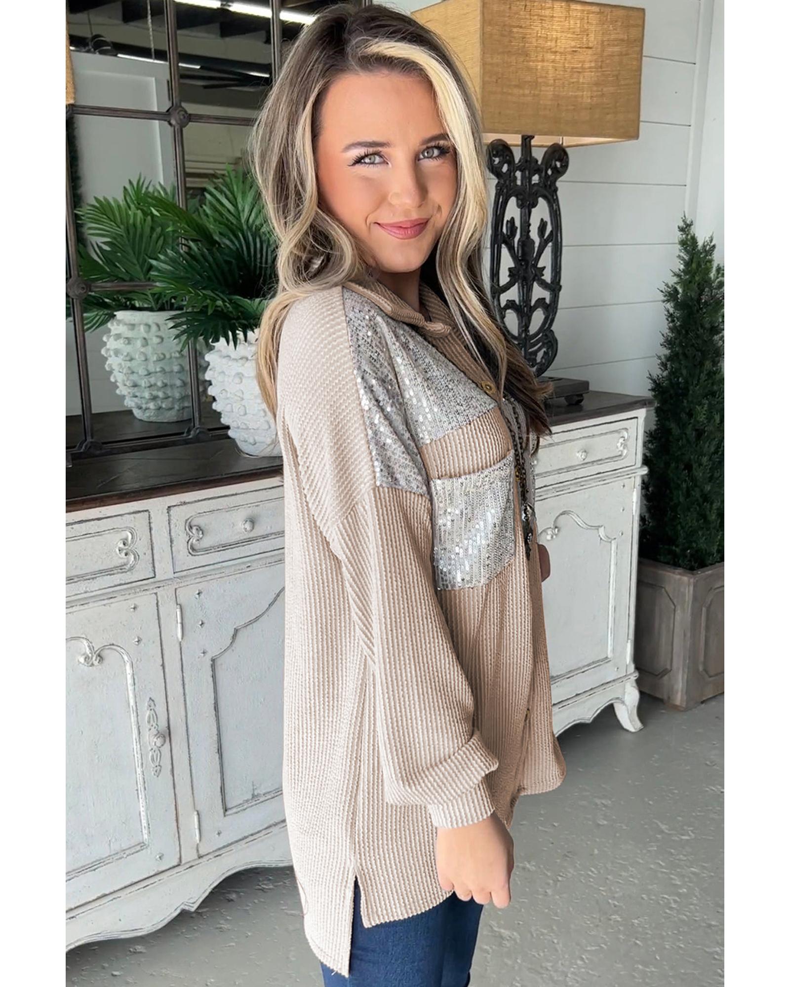 Parchment Sequin Patch Chest Pocket Corded Shacket – M