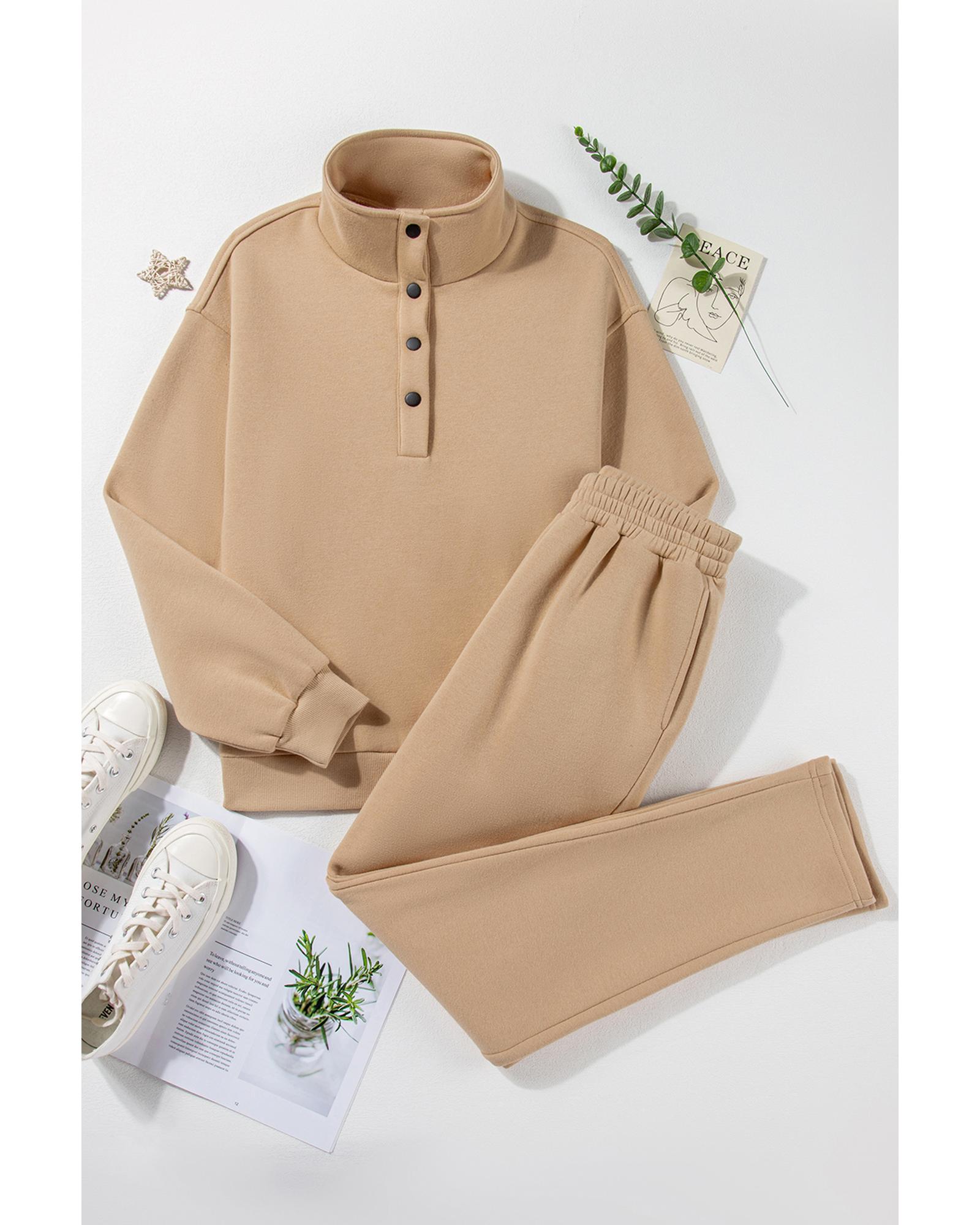 - Chic Parchment Solid Half Button Sweatshirt and High Waist Sweatpants Set