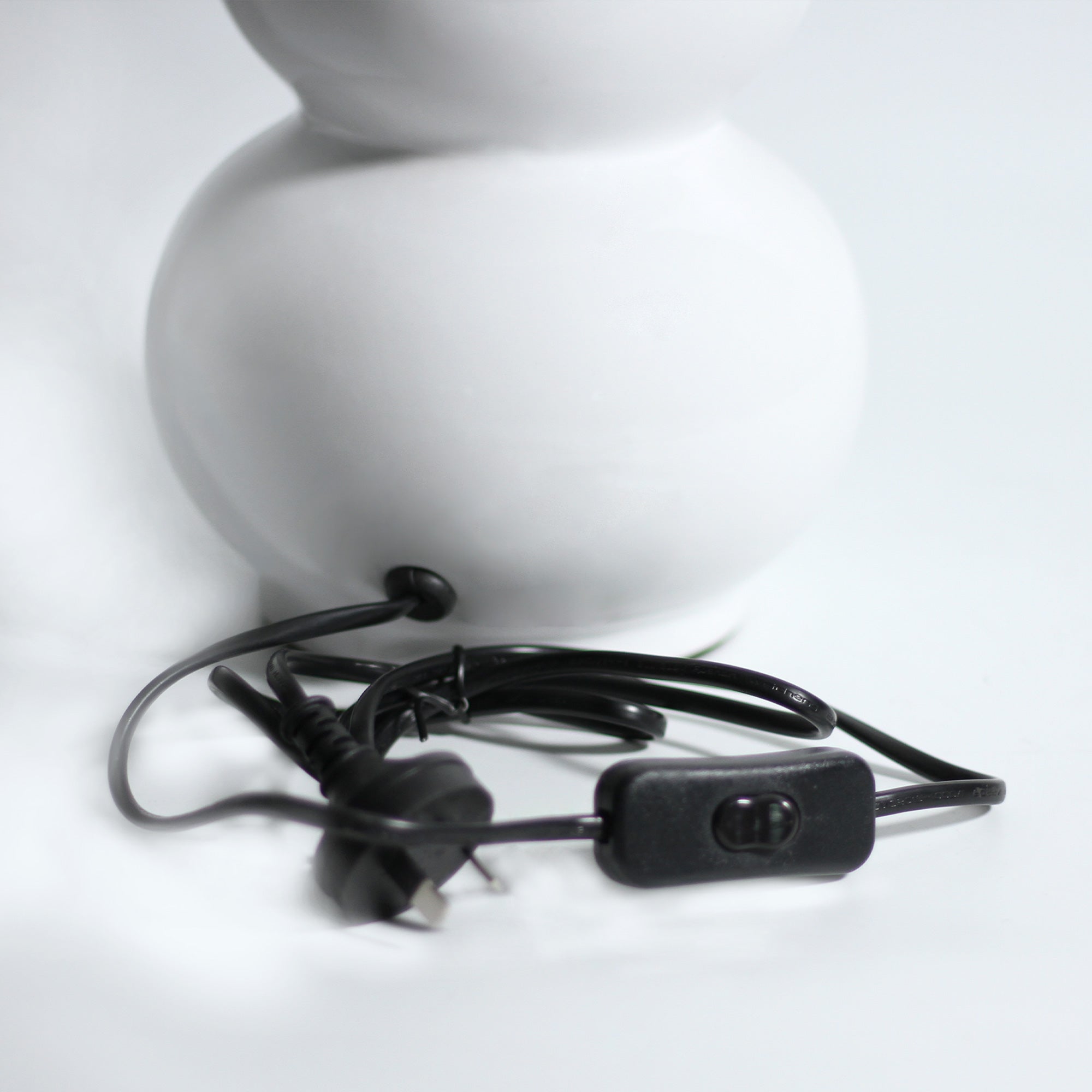 The Pattery Barn Table Lamp utilises a classic pottery wheel inspired ceramic base design with two spherical features and a spindle-shaped neck. The cylindric white fabric lampshade is supported on a short chrome stem.