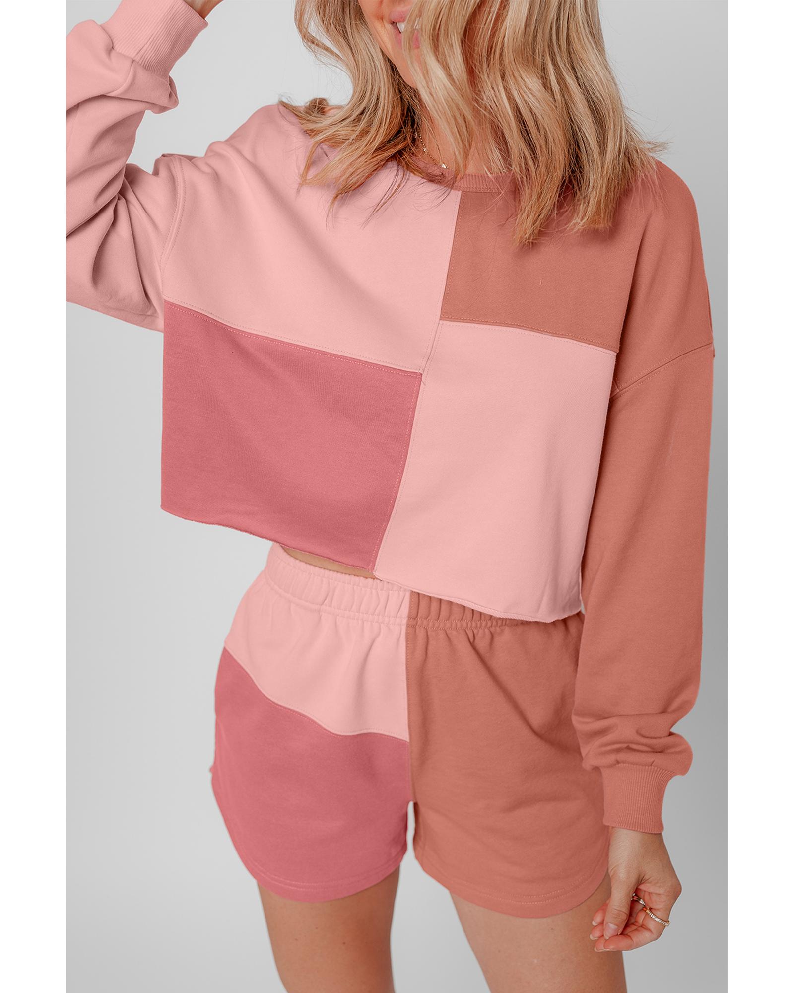Peach Blossom Colorblock Patchwork Long Sleeve Shorts Outfit – S
