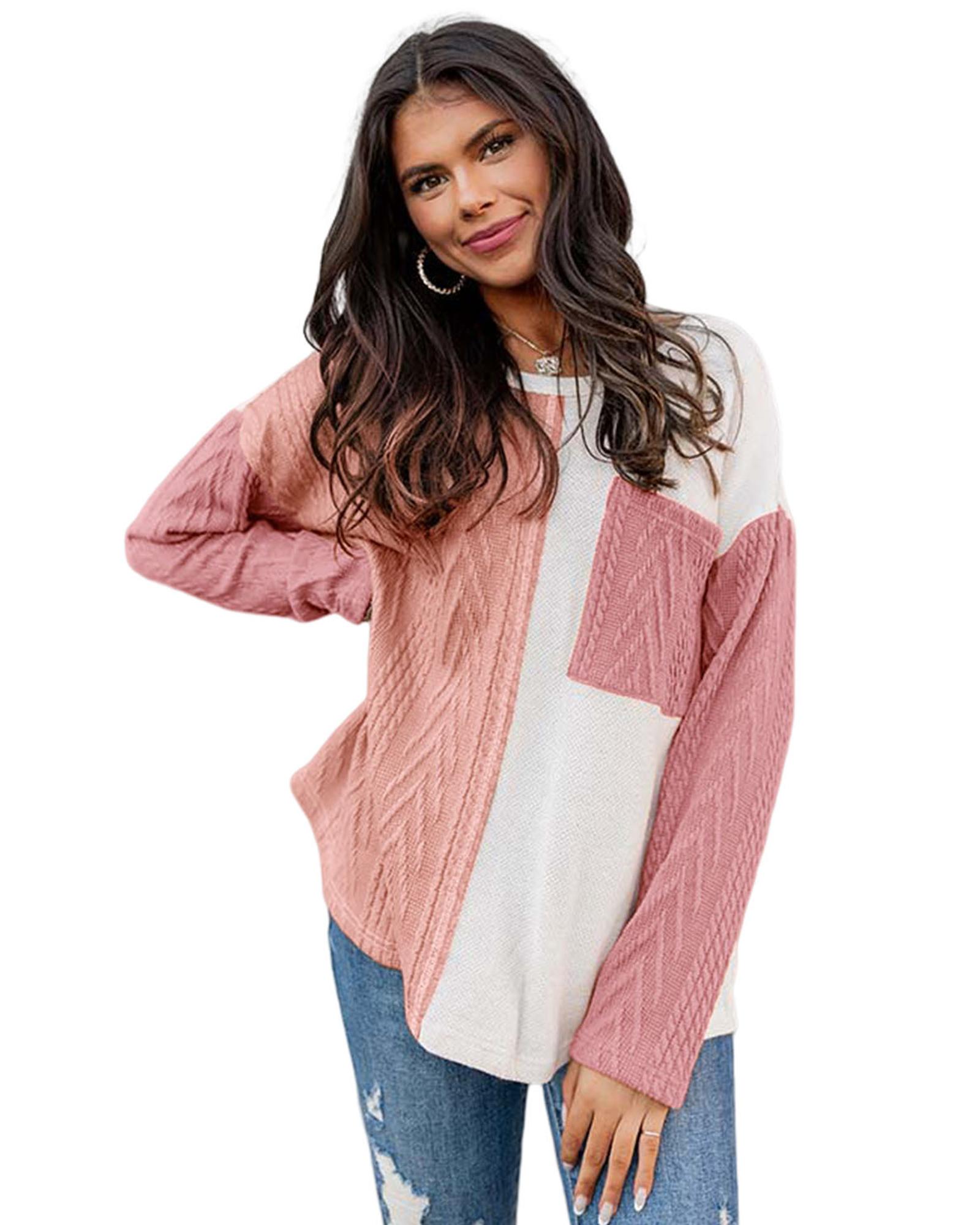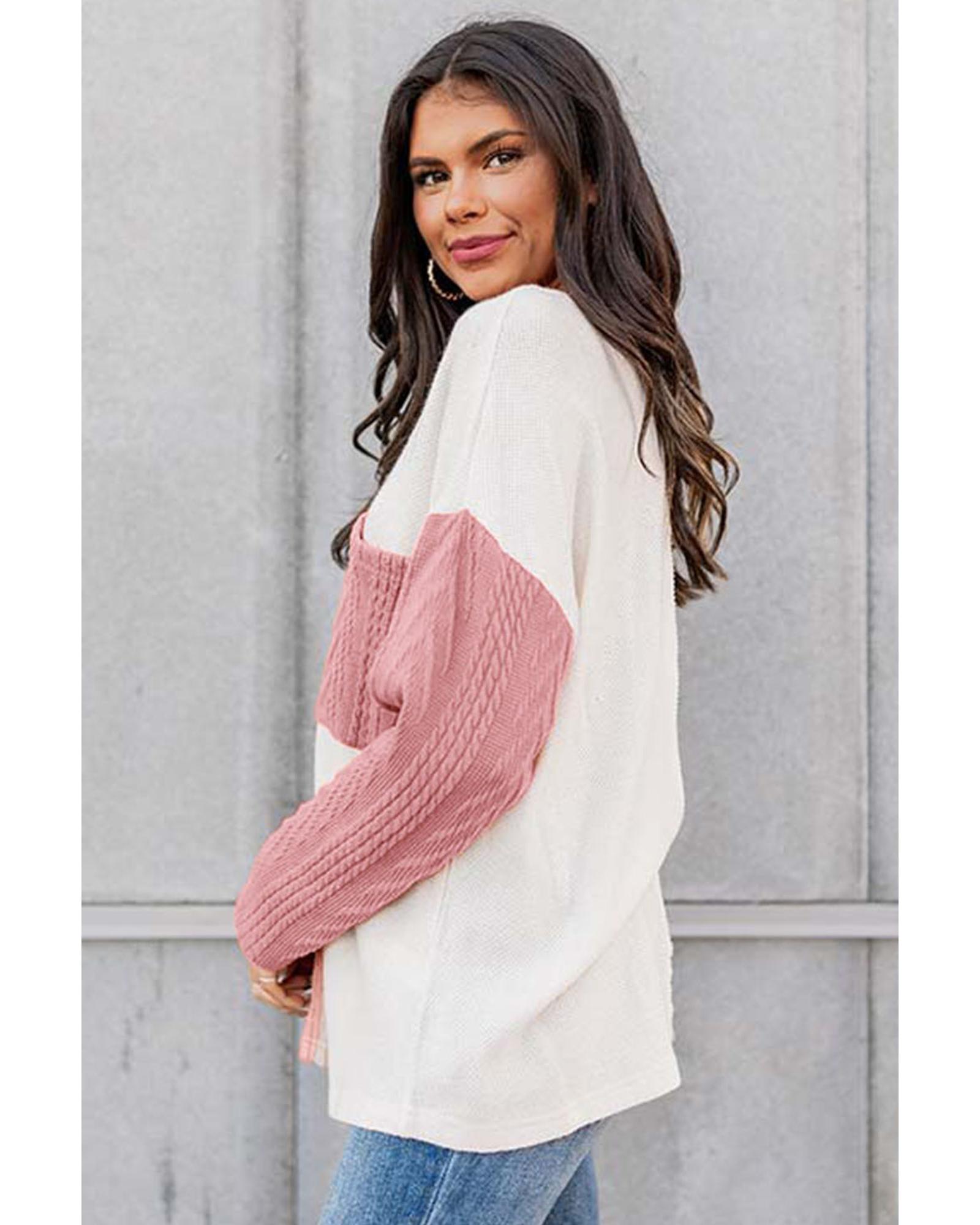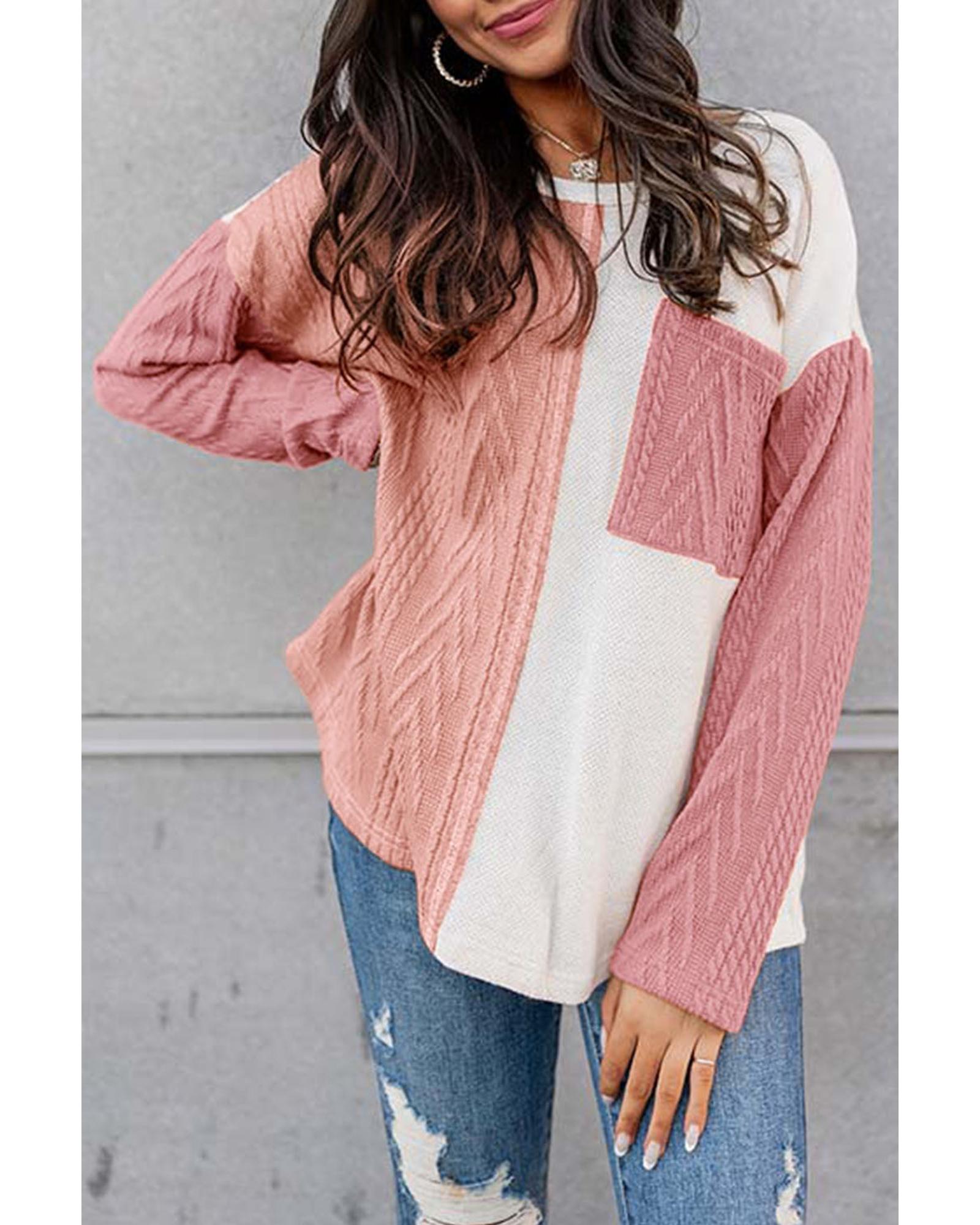 • Peach Blossom Long Sleeve Colorblock Chest Pocket Textured Knit Top