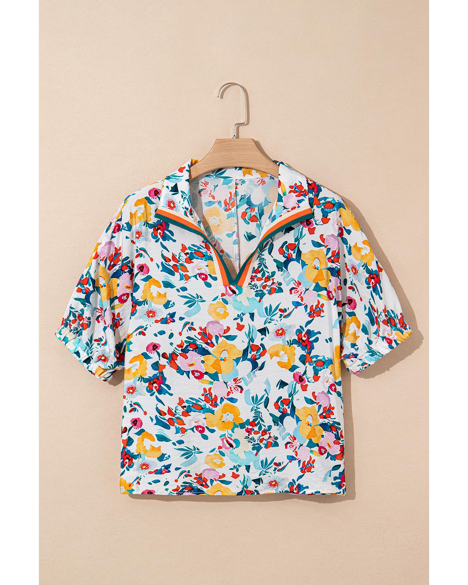 Peacock Blue Floral Print Slit V Neck Short Sleeve Blouse – M