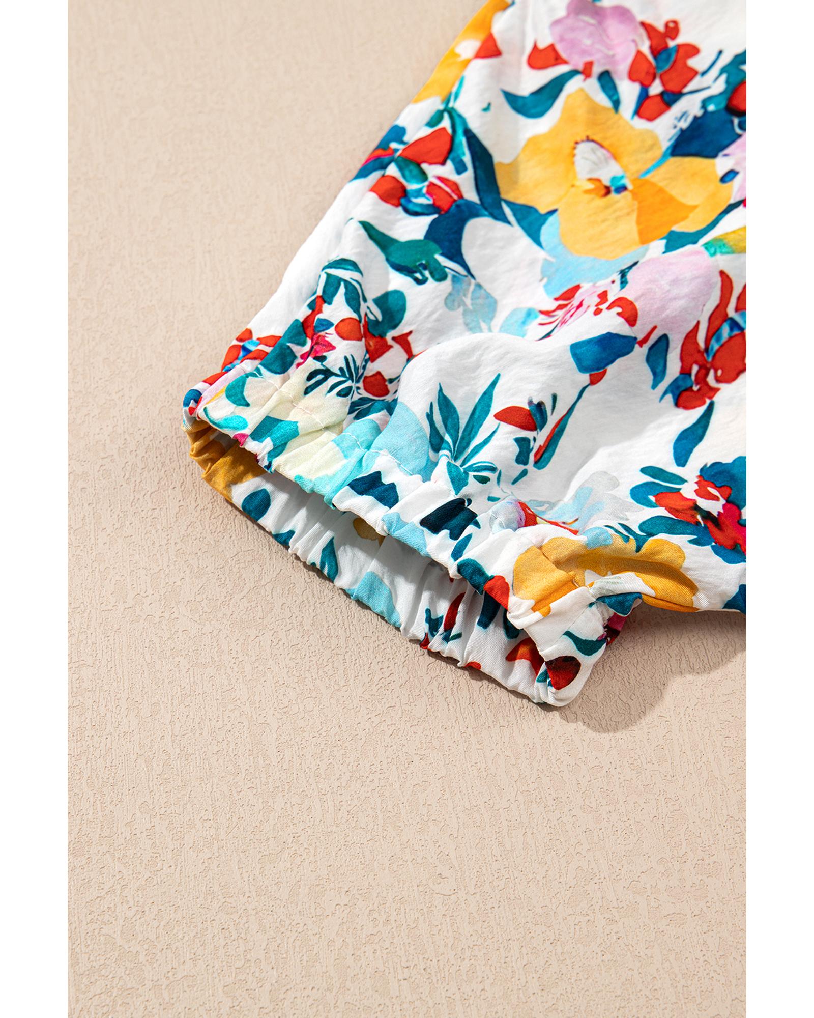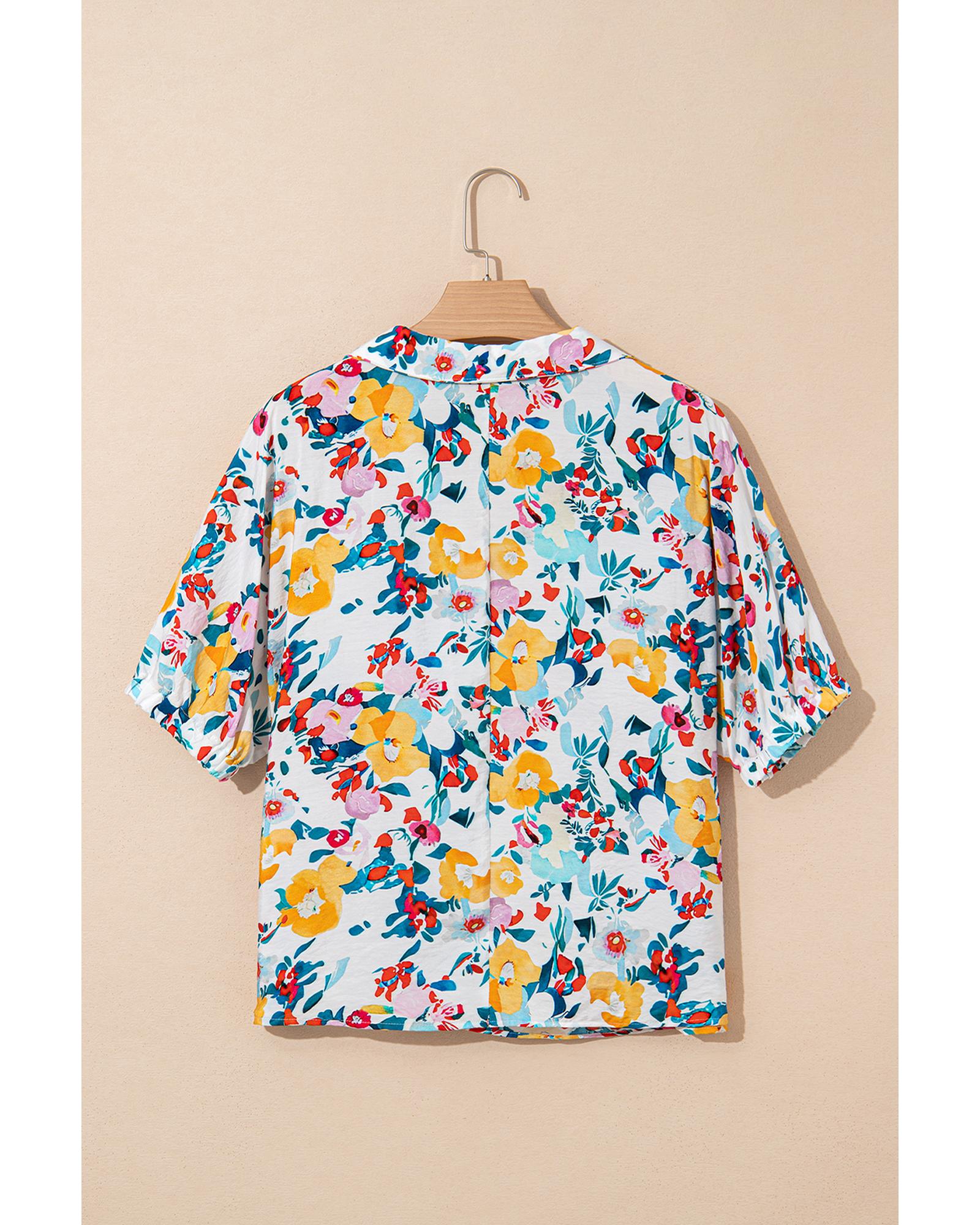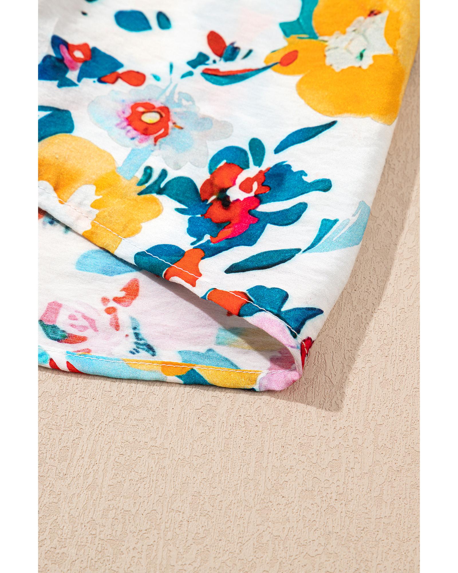 Peacock Blue Floral Print Slit V Neck Short Sleeve Blouse – XL