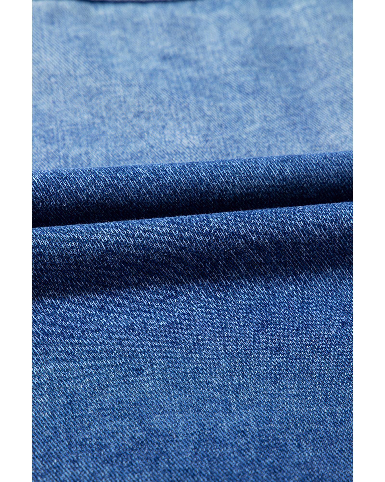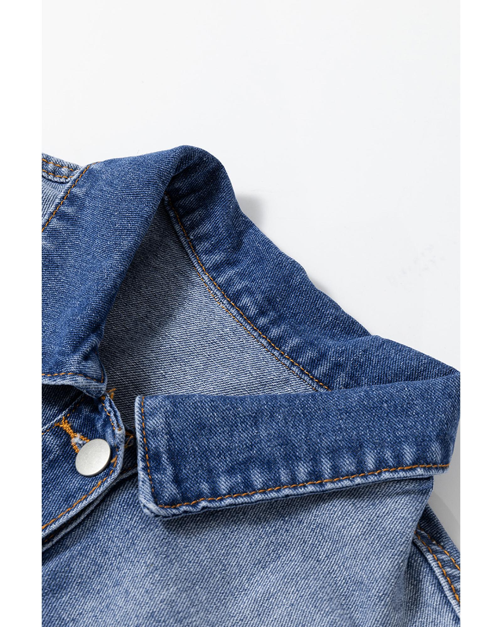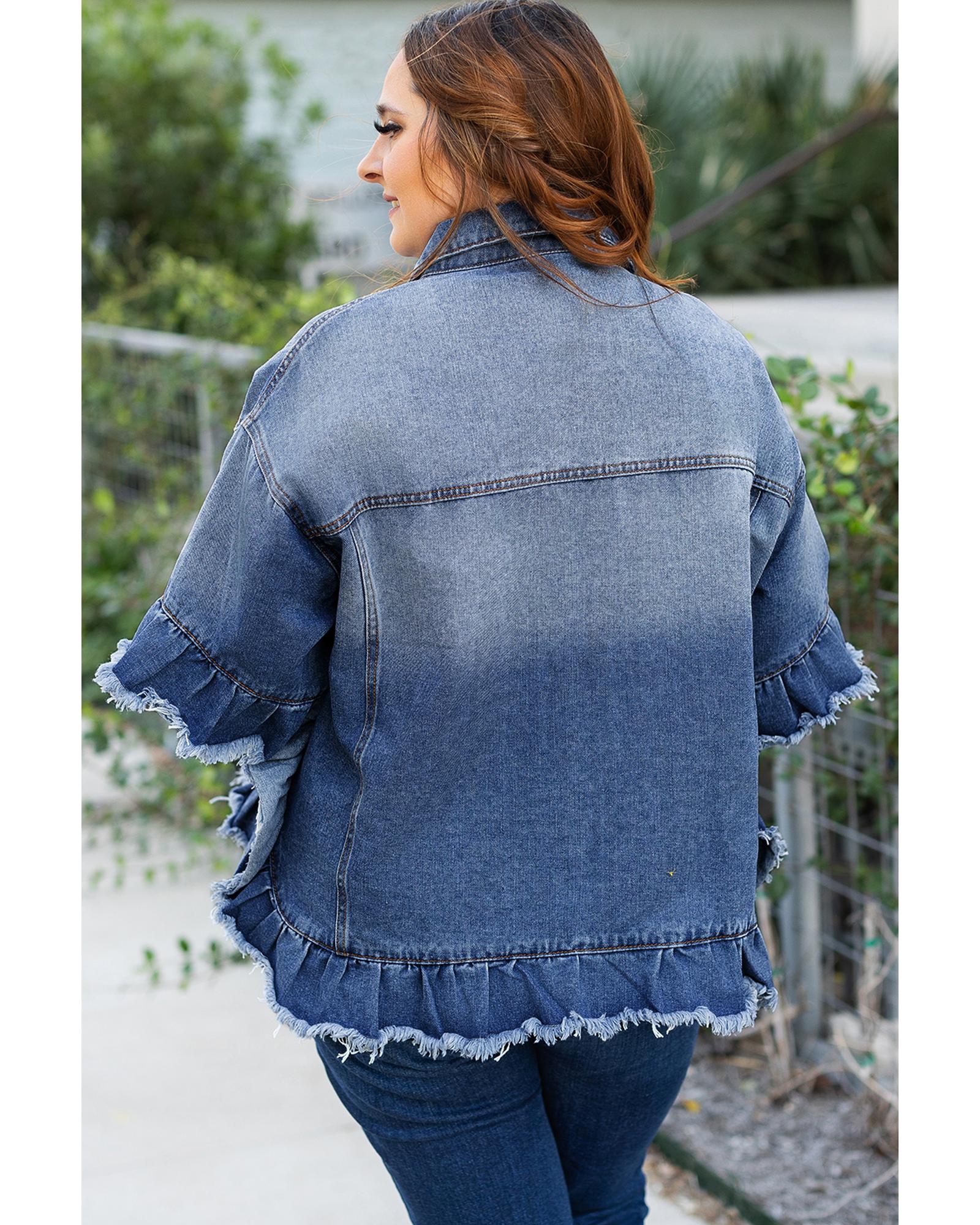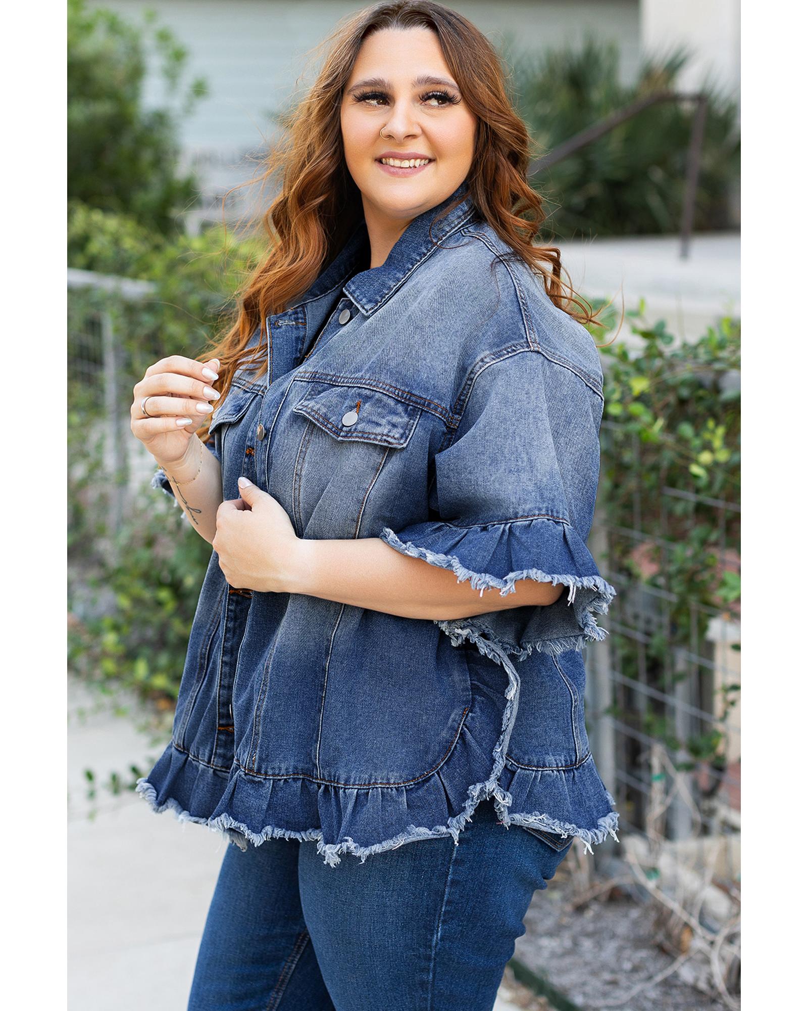 Peacock Blue Ruffled Frayed Short Sleeve Plus Size Denim Jacket – 4X
