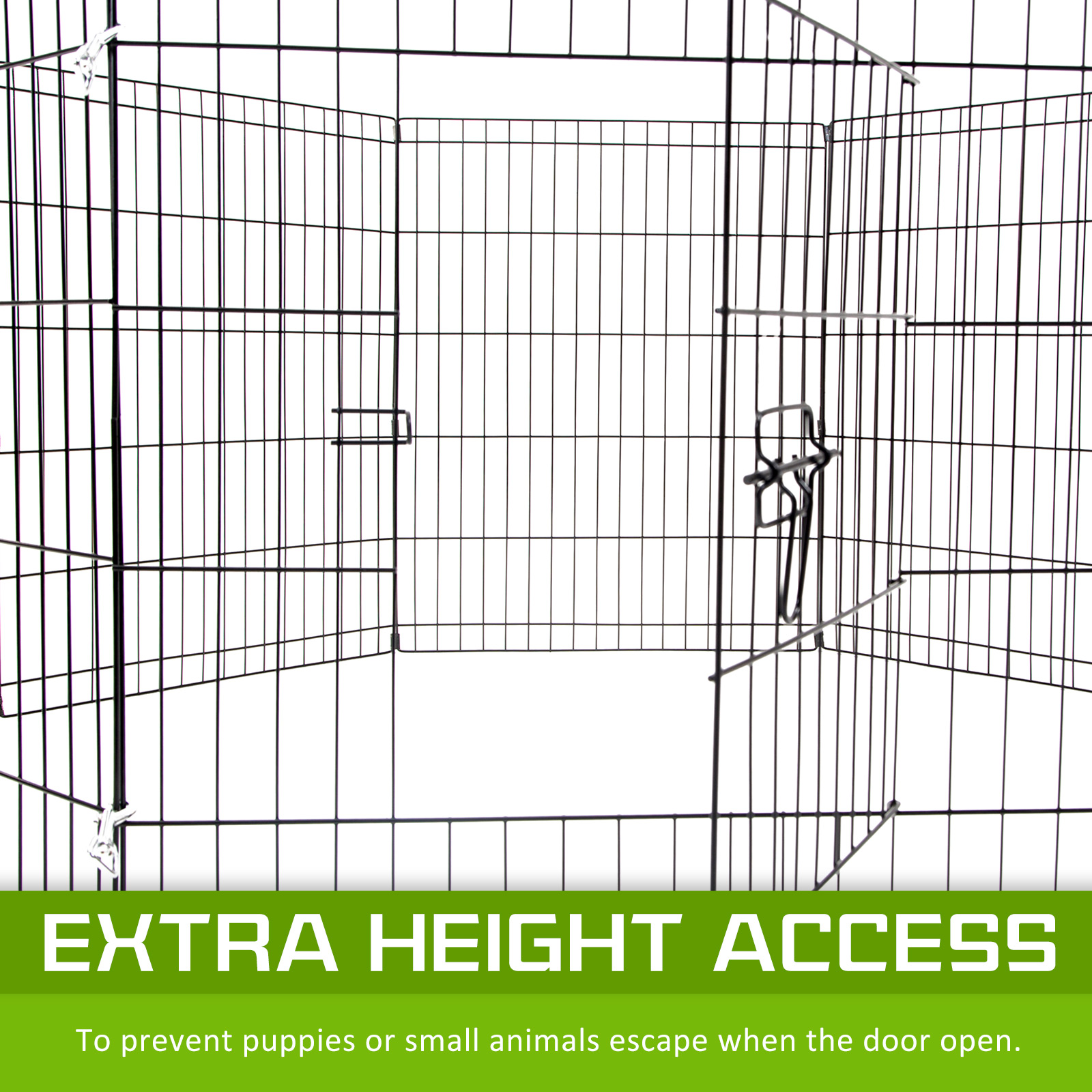It features as 8 panels for multi-configuration which allows you to turn your playpen into different shapes. Made of durable steel frames construction with black powder coat finish provides Long Lasting Protection and weather resistance. The access door with bolt latches you can be sure that your pet doesn’t have the opportunity to run away and the round edges ensure pet safety.