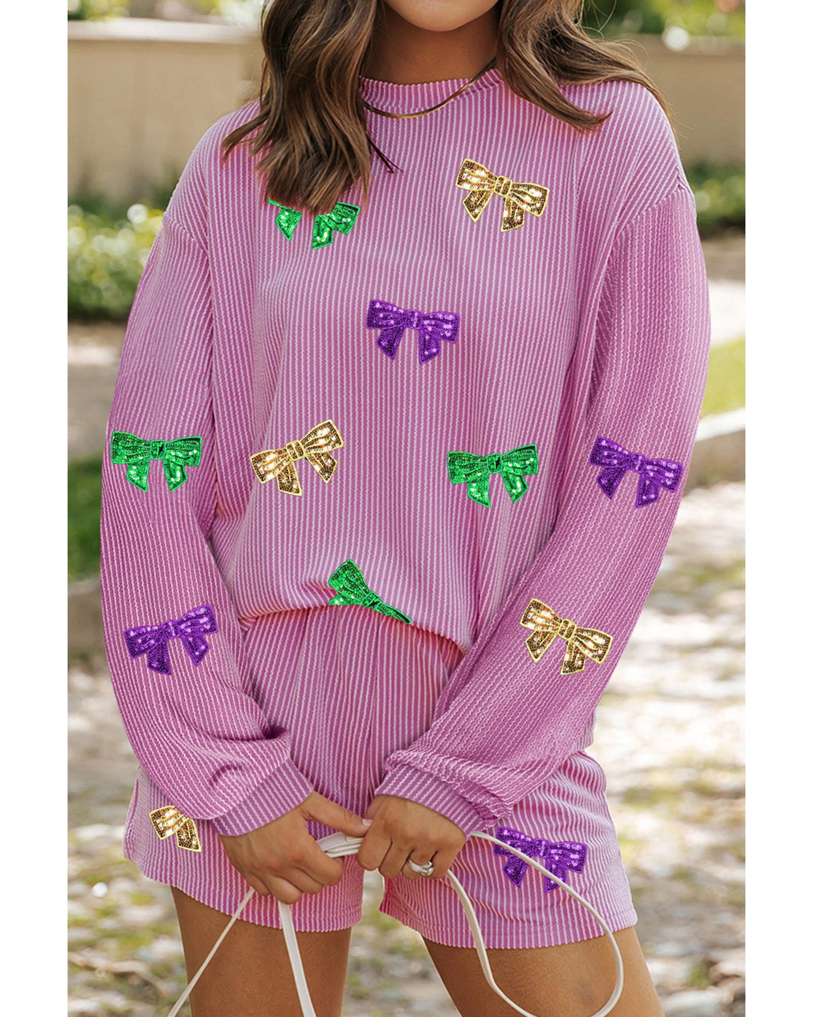 Phalaenopsis Bowknot Patched Pattern Corded Long Sleeve Top and Shorts Outfit - L