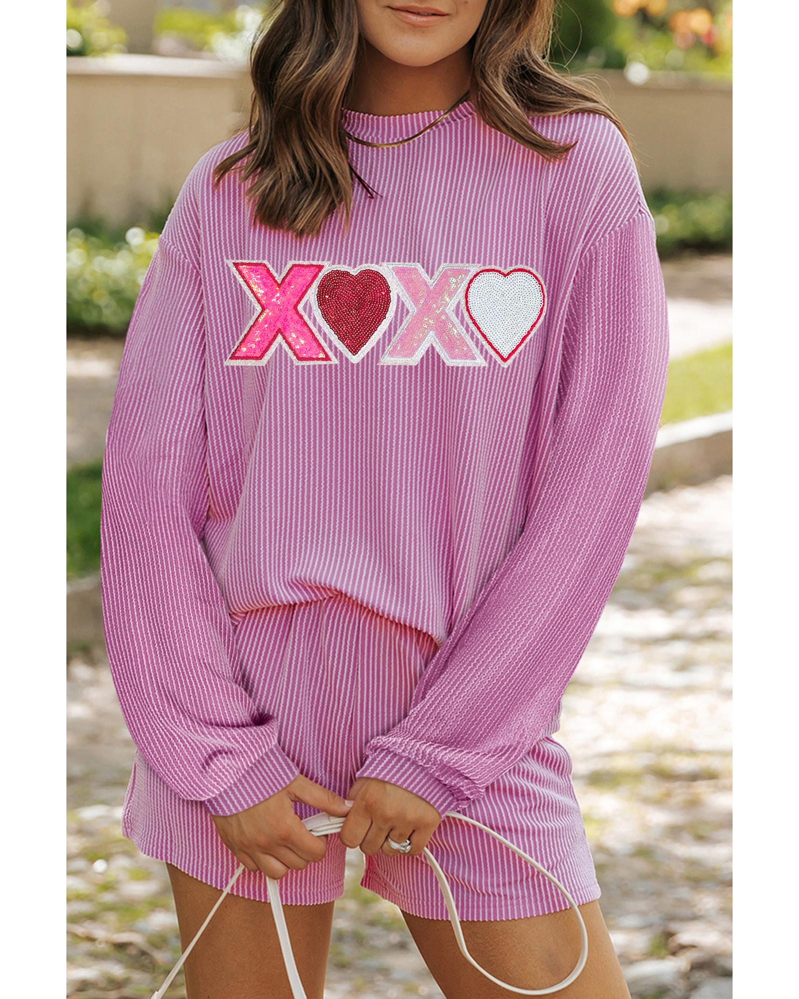 Phalaenopsis Corded Sequined XOXO Heart Valentines Long Sleeve Shorts Set – L