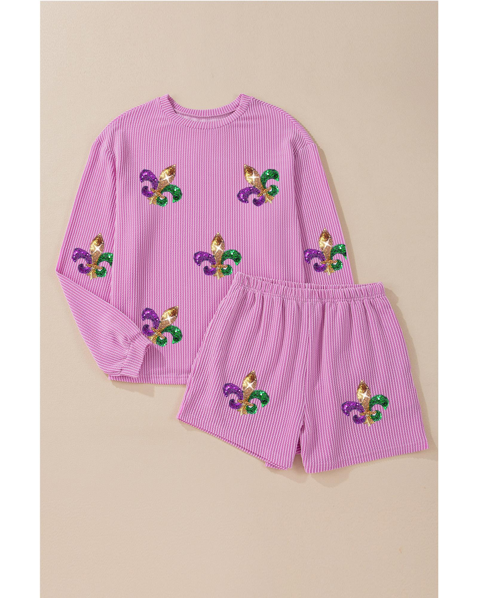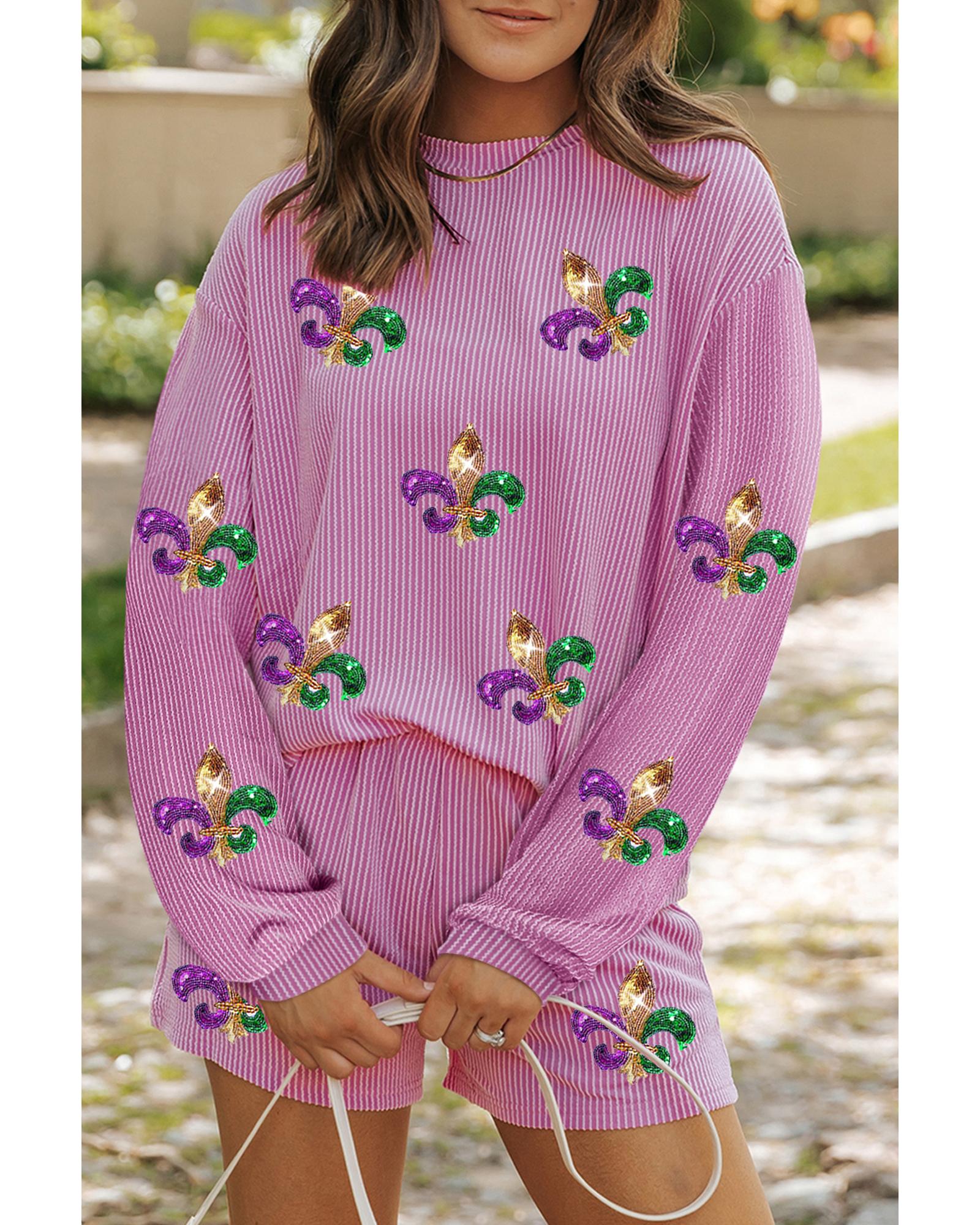 Phalaenopsis Mardi Gras Fleur de Lis Patched Corded Long Sleeve Top and Shorts – XL