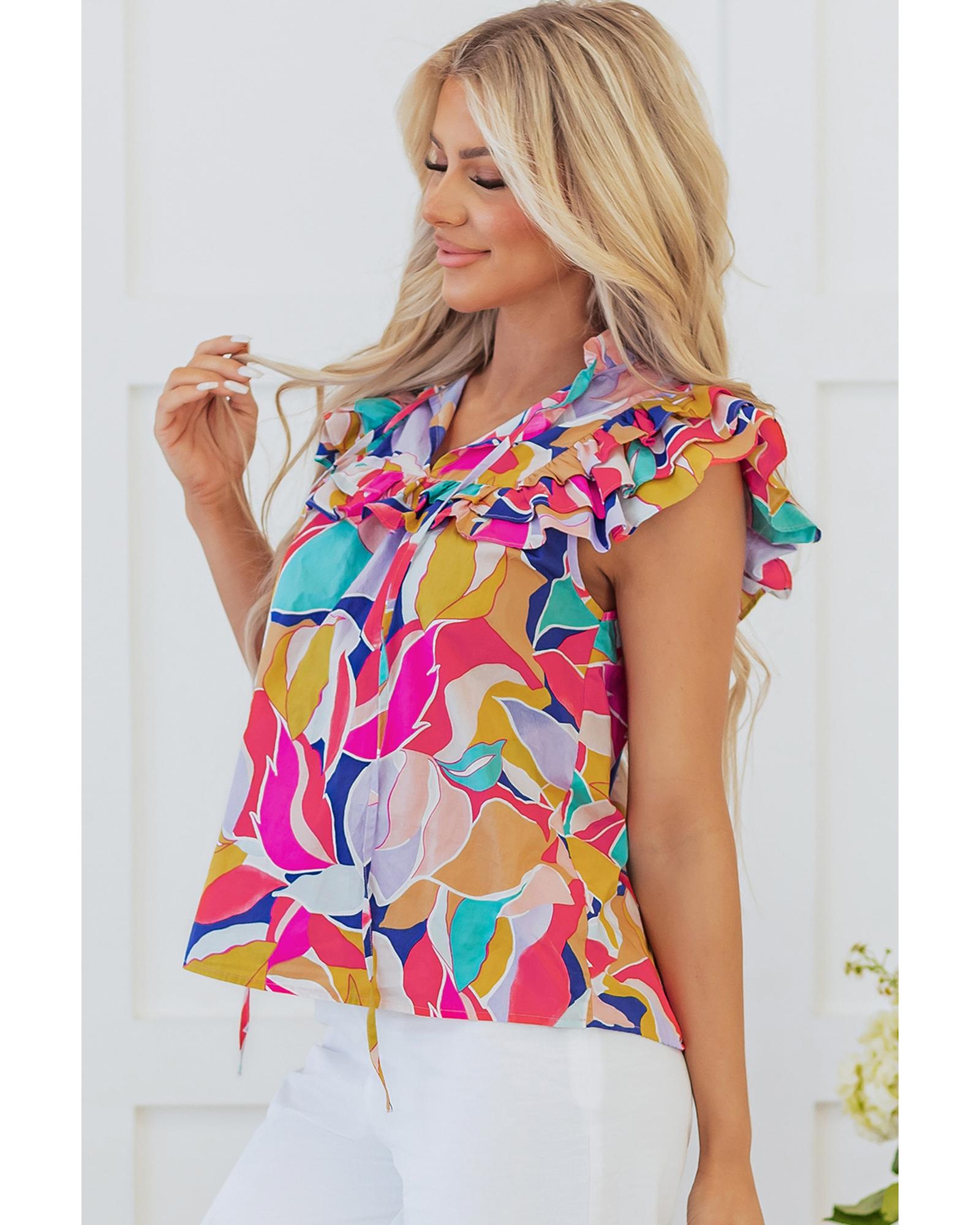 Pink Abstract Printed Ruffled Flutter Sleeve Tied Split V Neck Blouse – XL