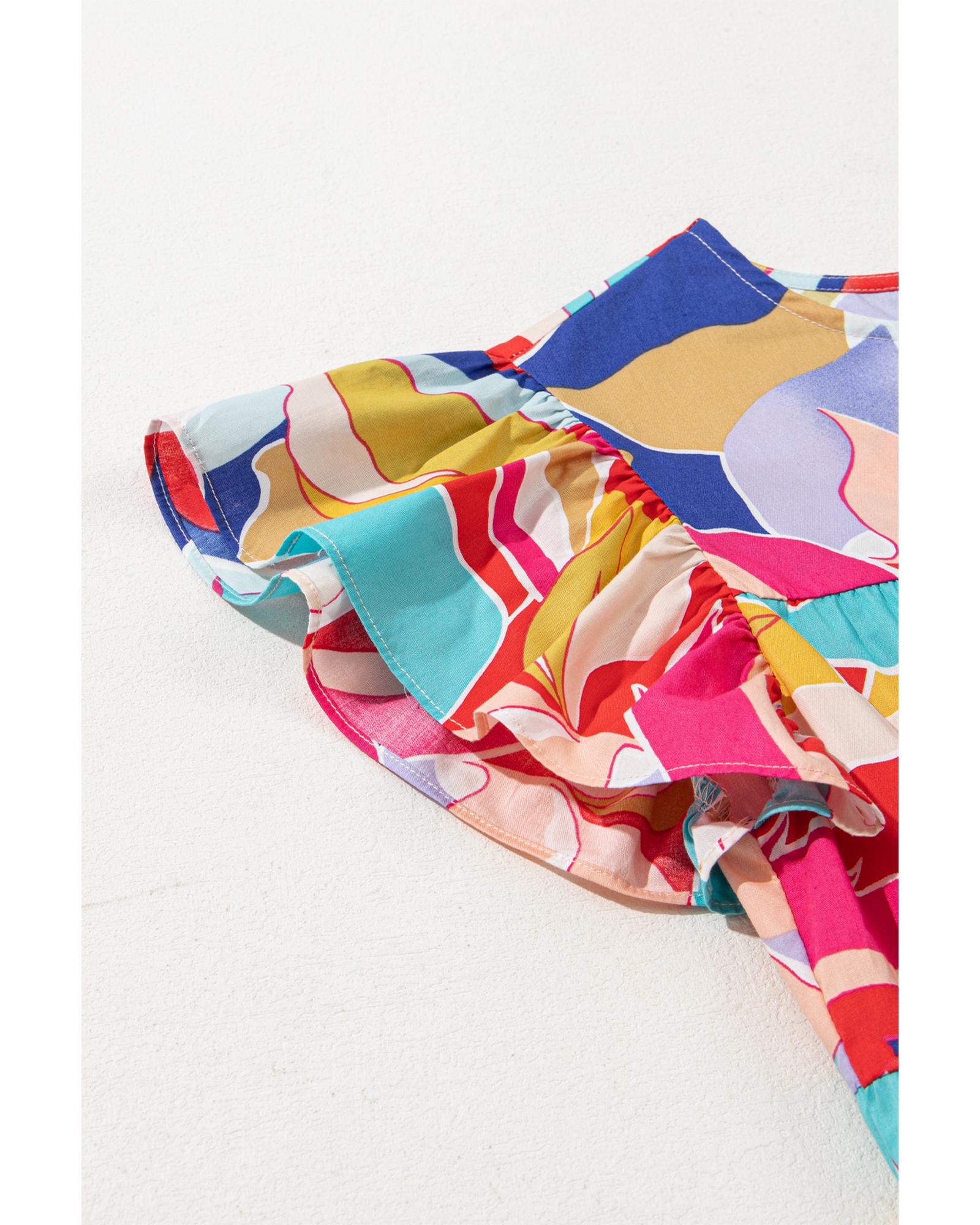 Pink Abstract Printed Ruffled Flutter Sleeve Tiered Mini Dress – L