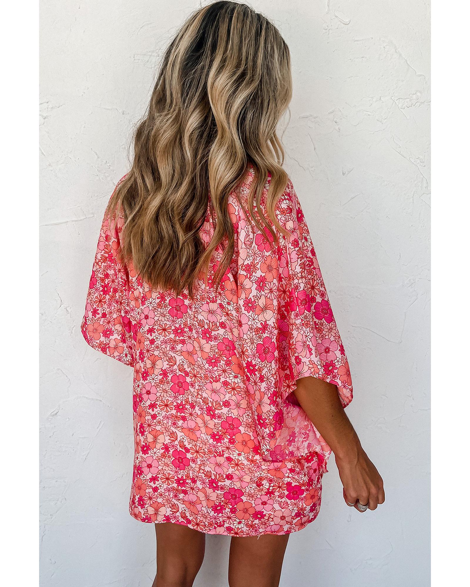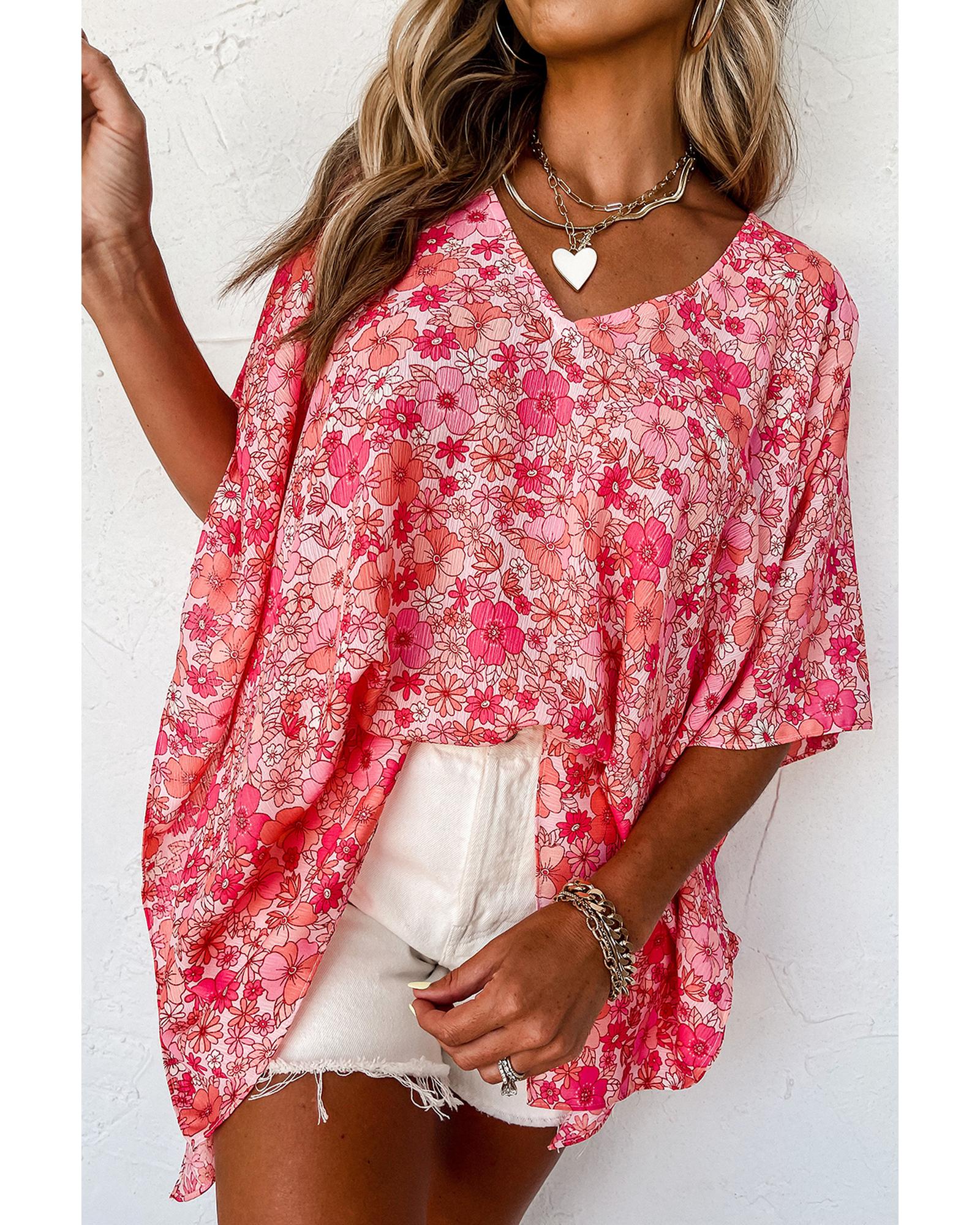 - Oversized Pink Boho Floral V Neck Kimono Style Blouse