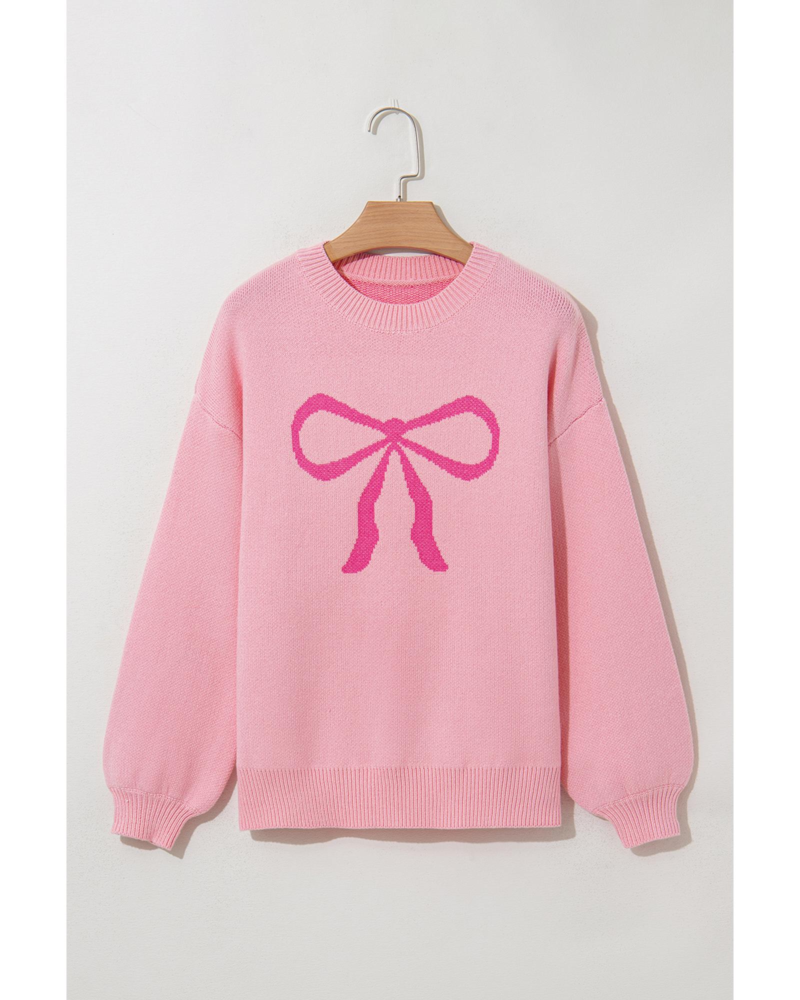 Pink Bow Graphic Drop Shoulder Round Neck Sweater – M