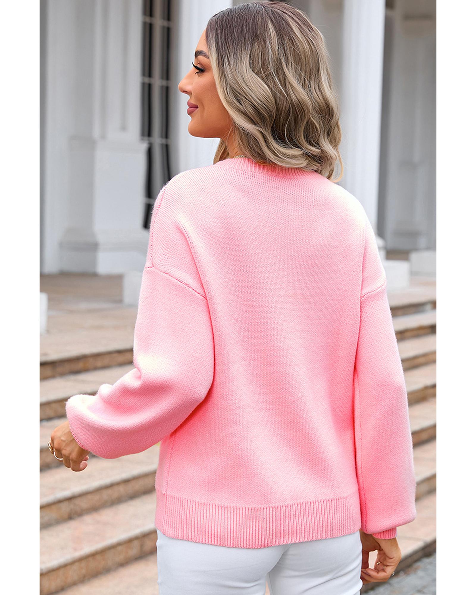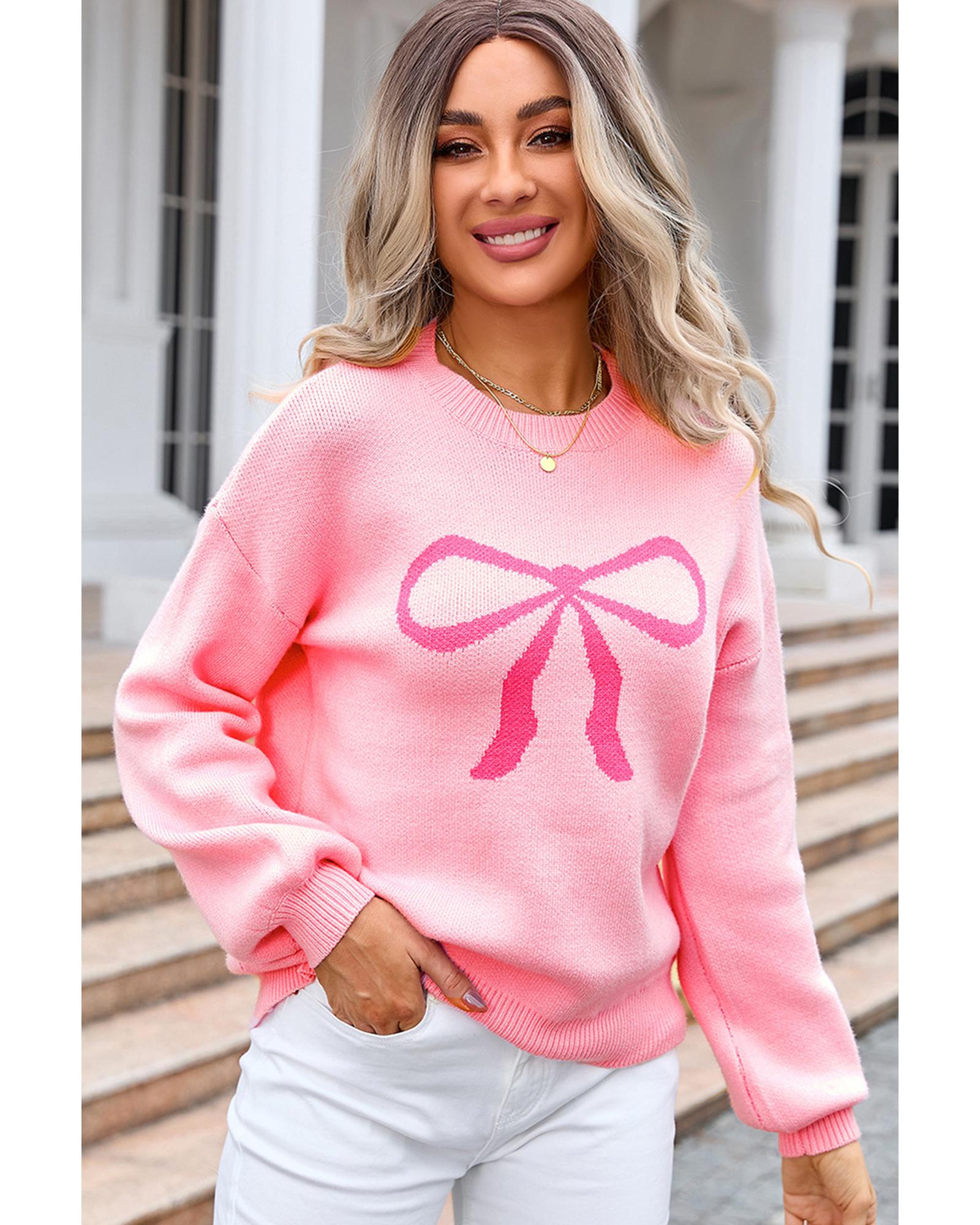 Pink Bow Graphic Drop Shoulder Round Neck Sweater – S