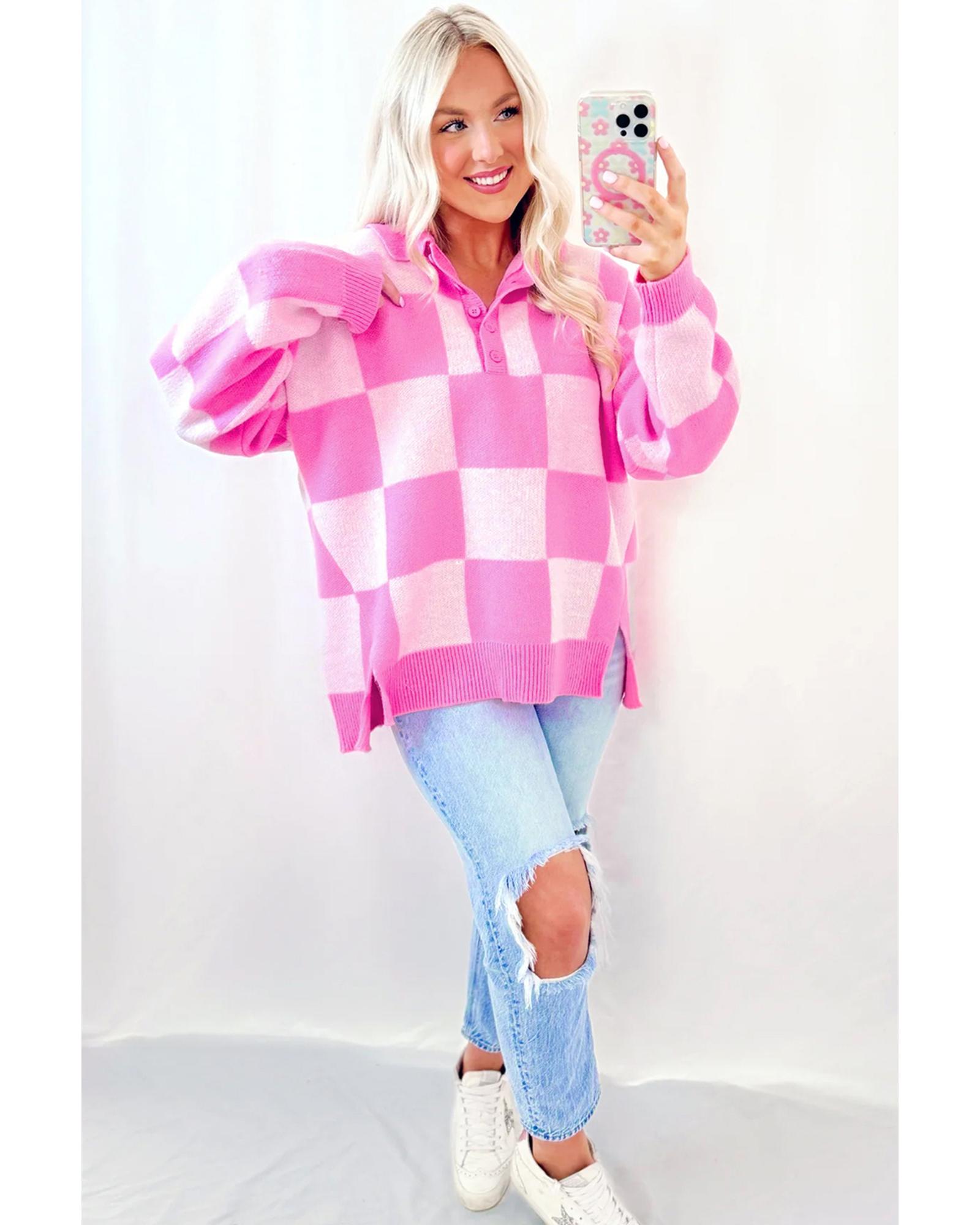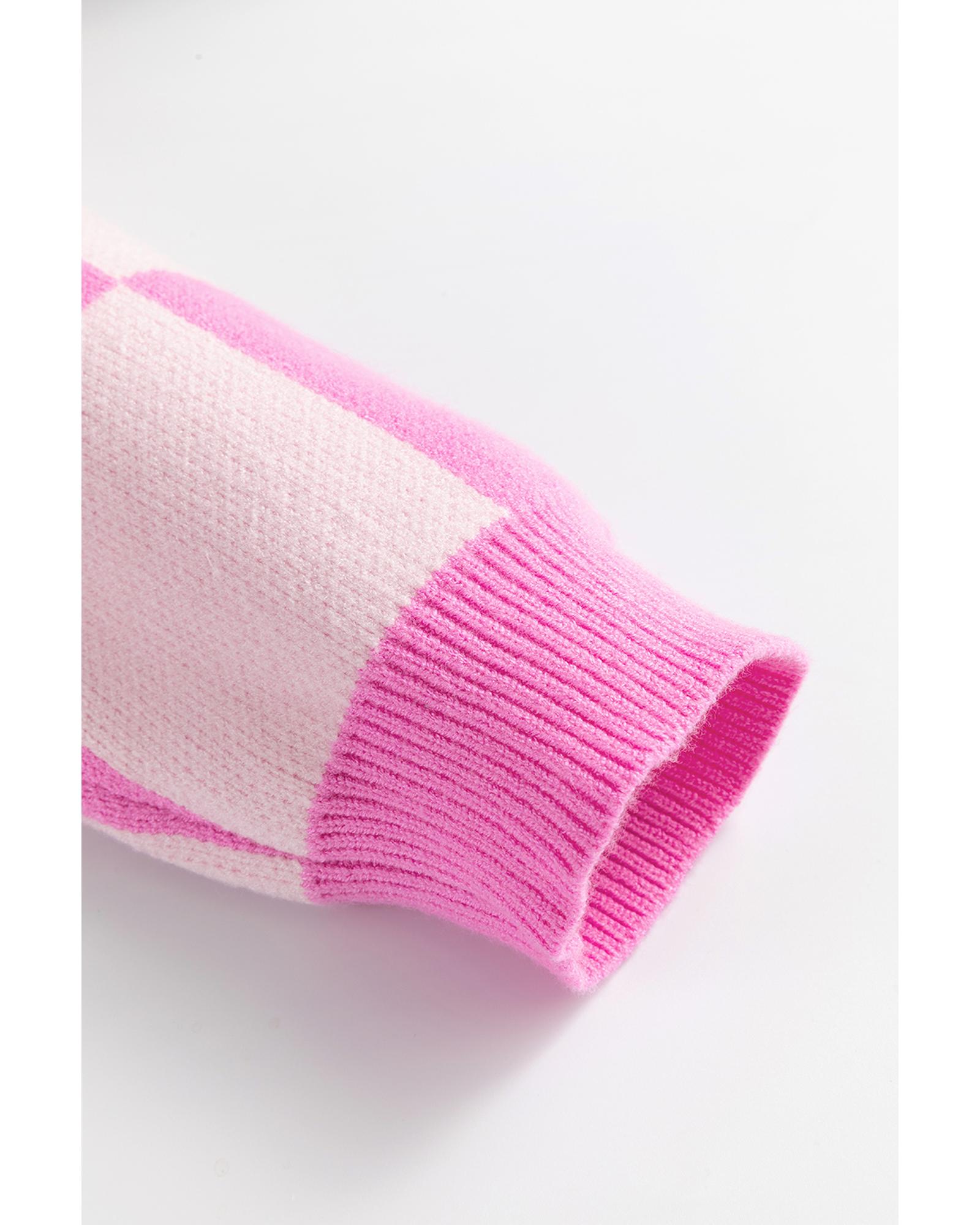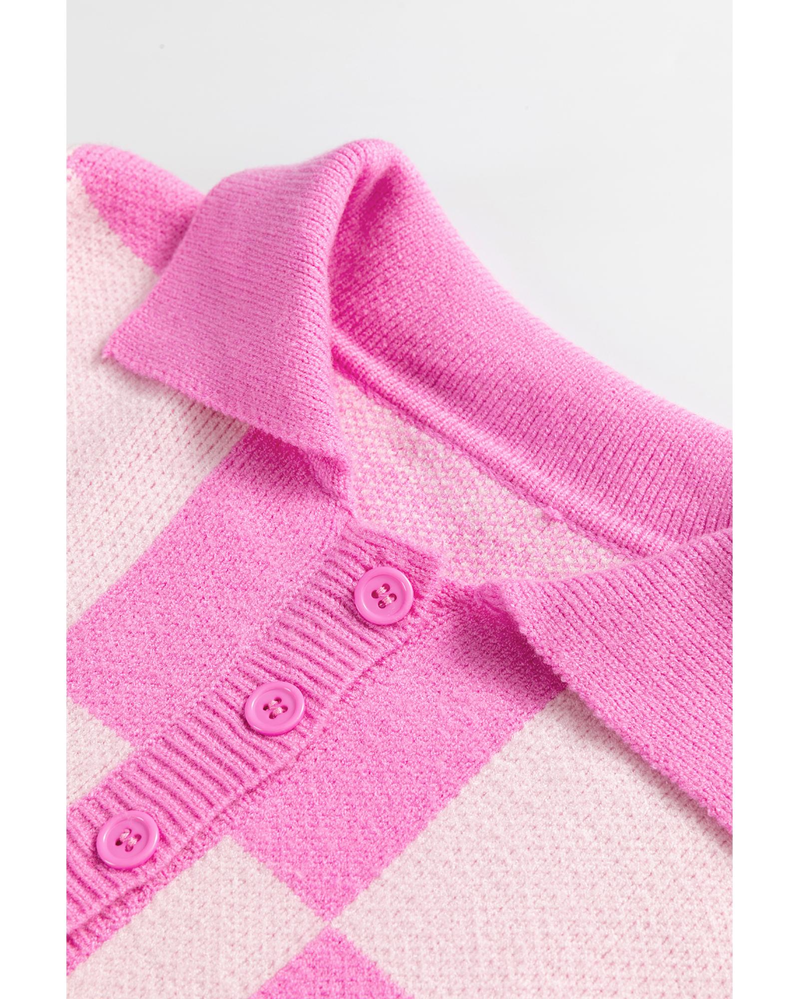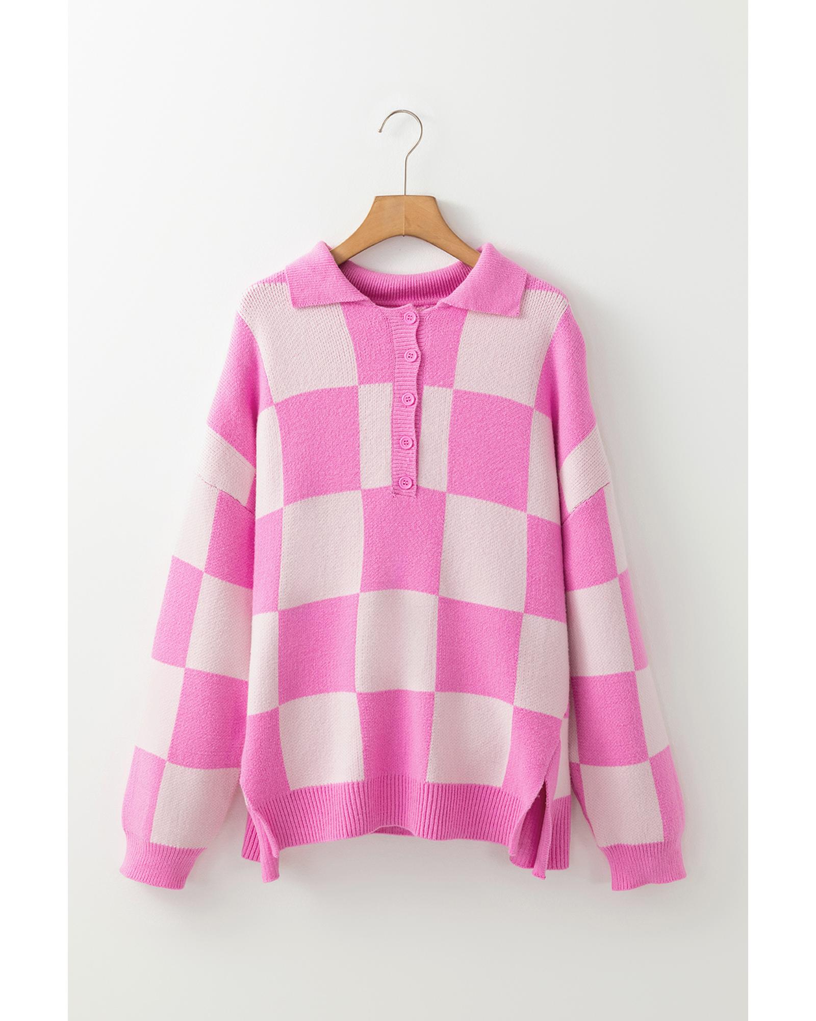 Pink Checkerboard Half Button Collared Drop Shoulder Sweater – M
