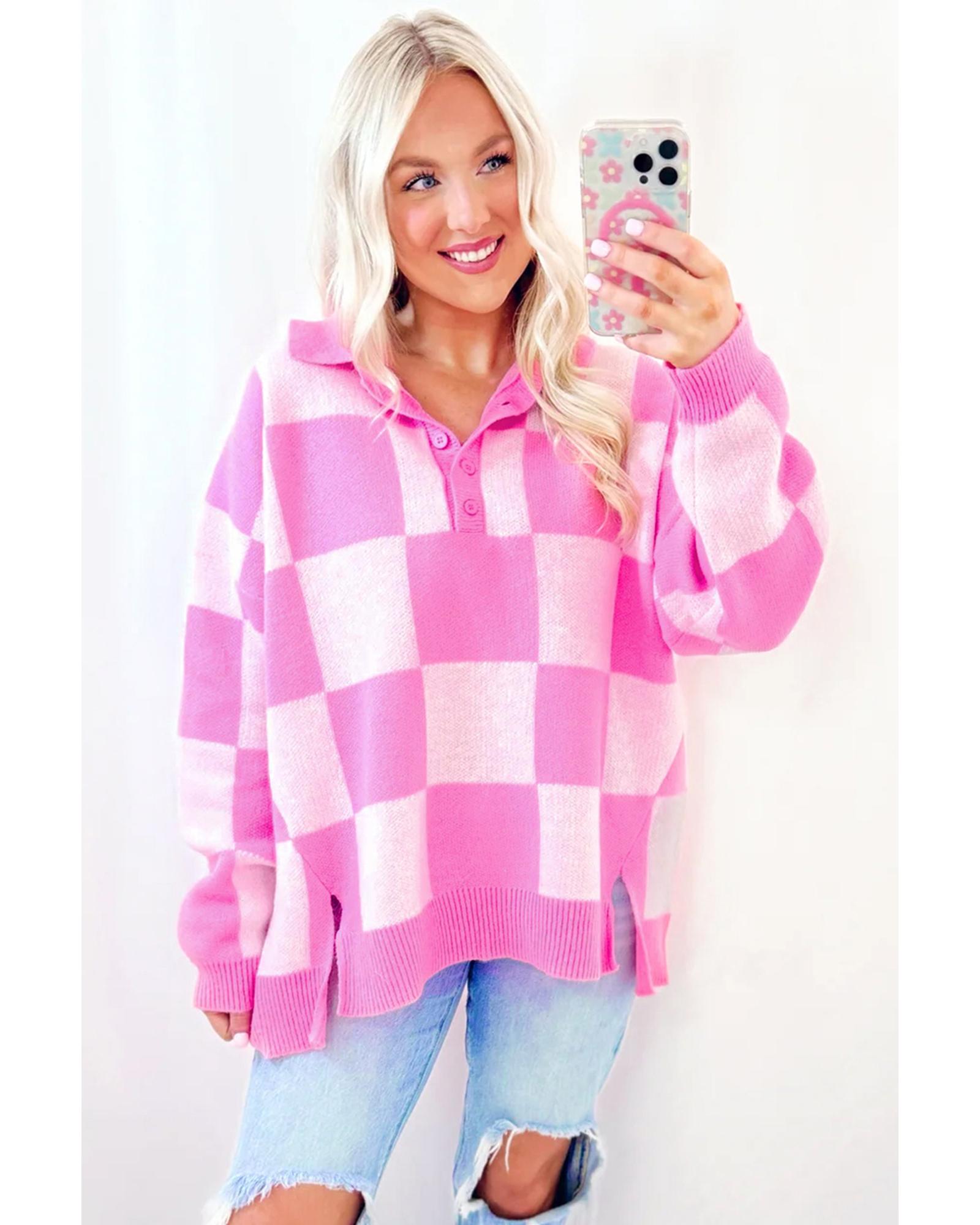 Pink Checkerboard Half Button Collared Drop Shoulder Sweater – S