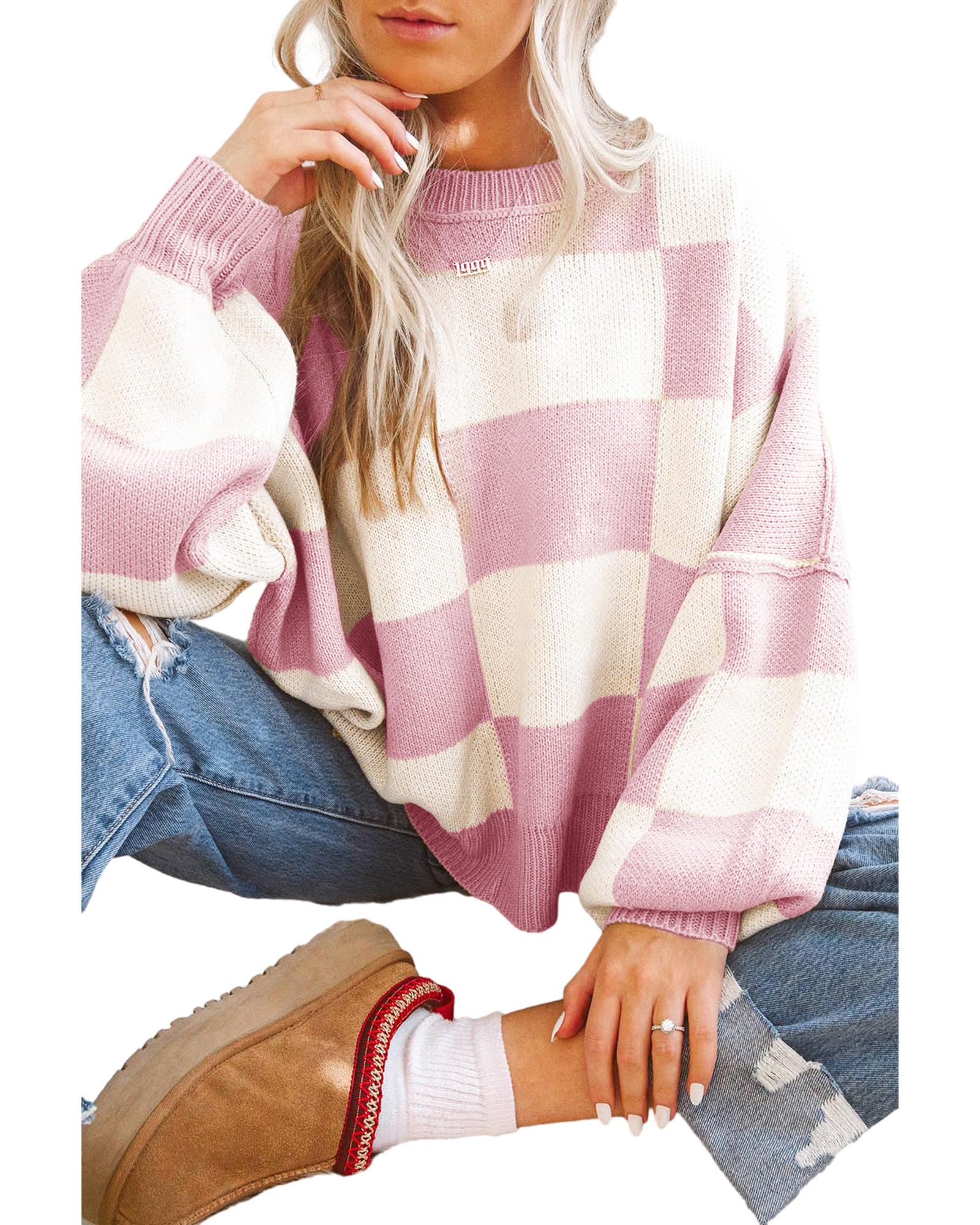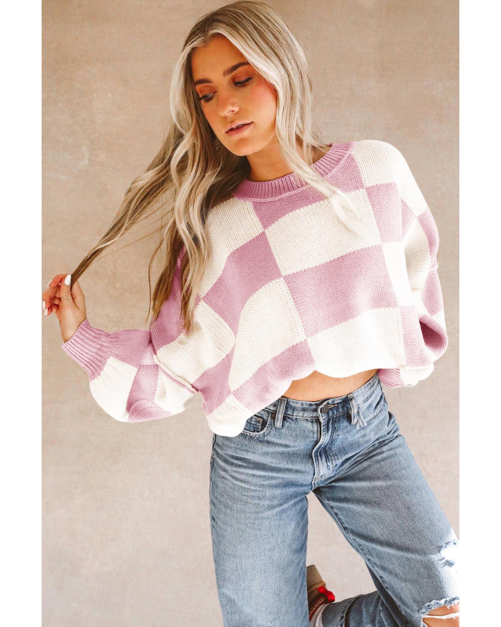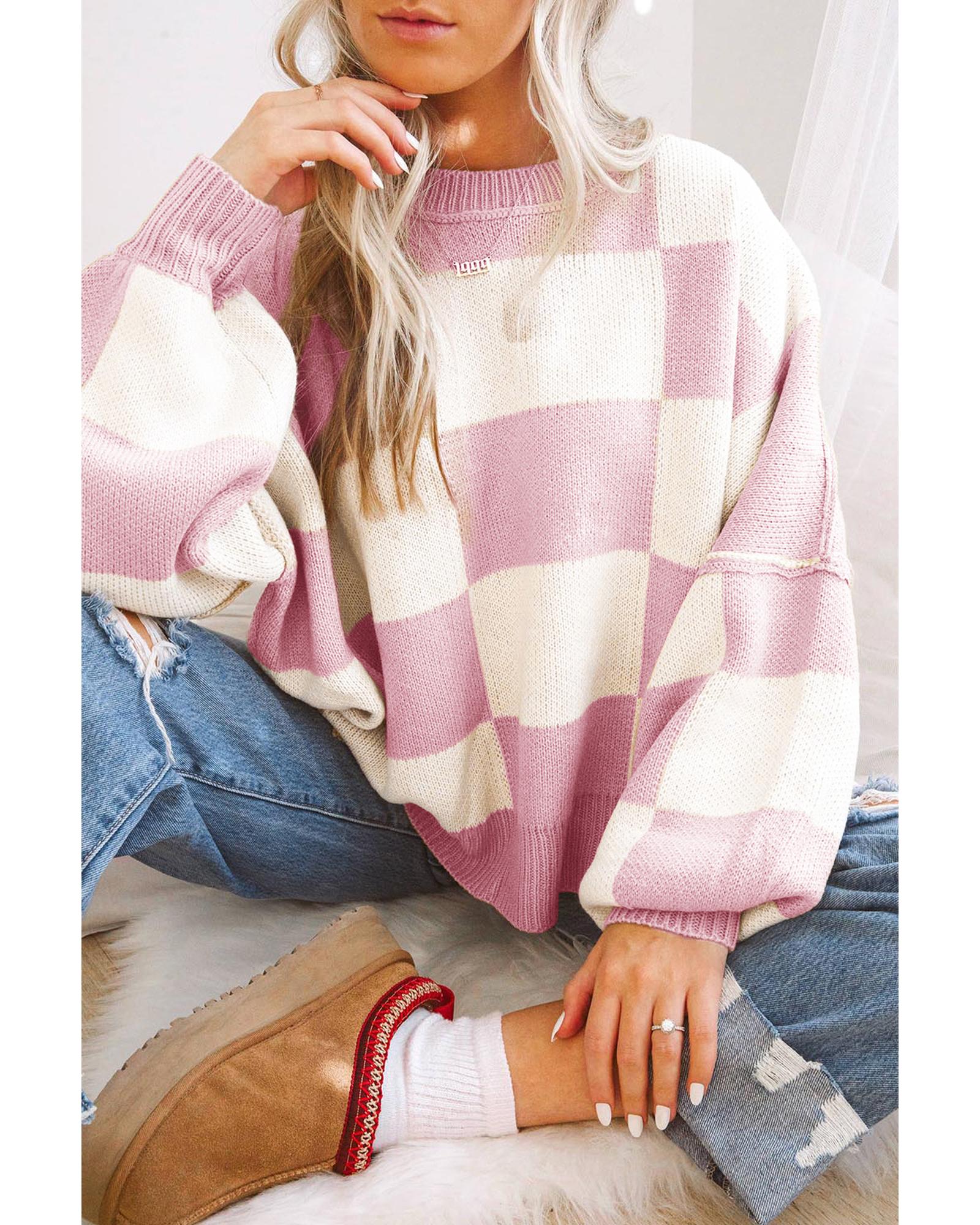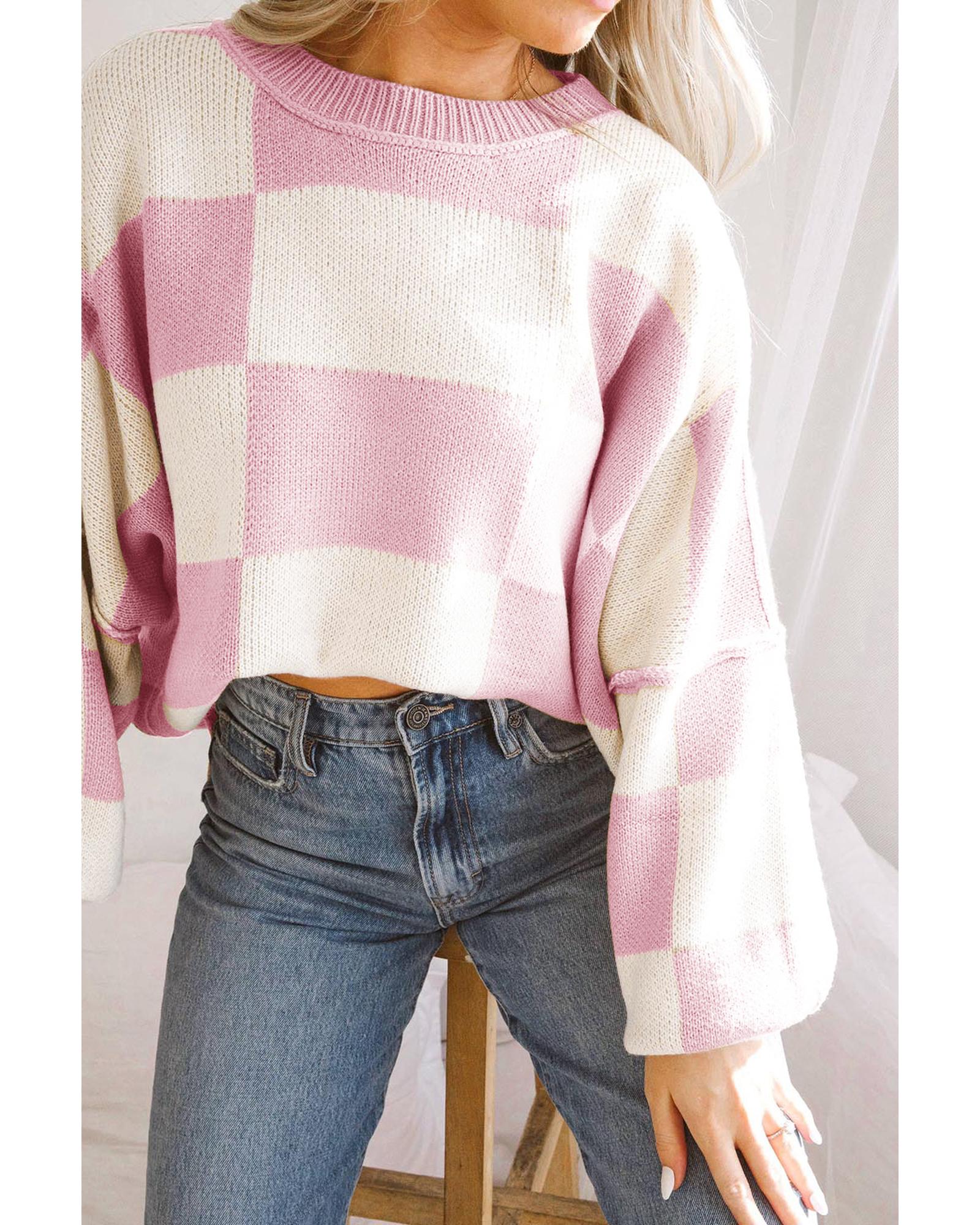 • Luxurious Pink Checkered Bishop Sleeve Sweater