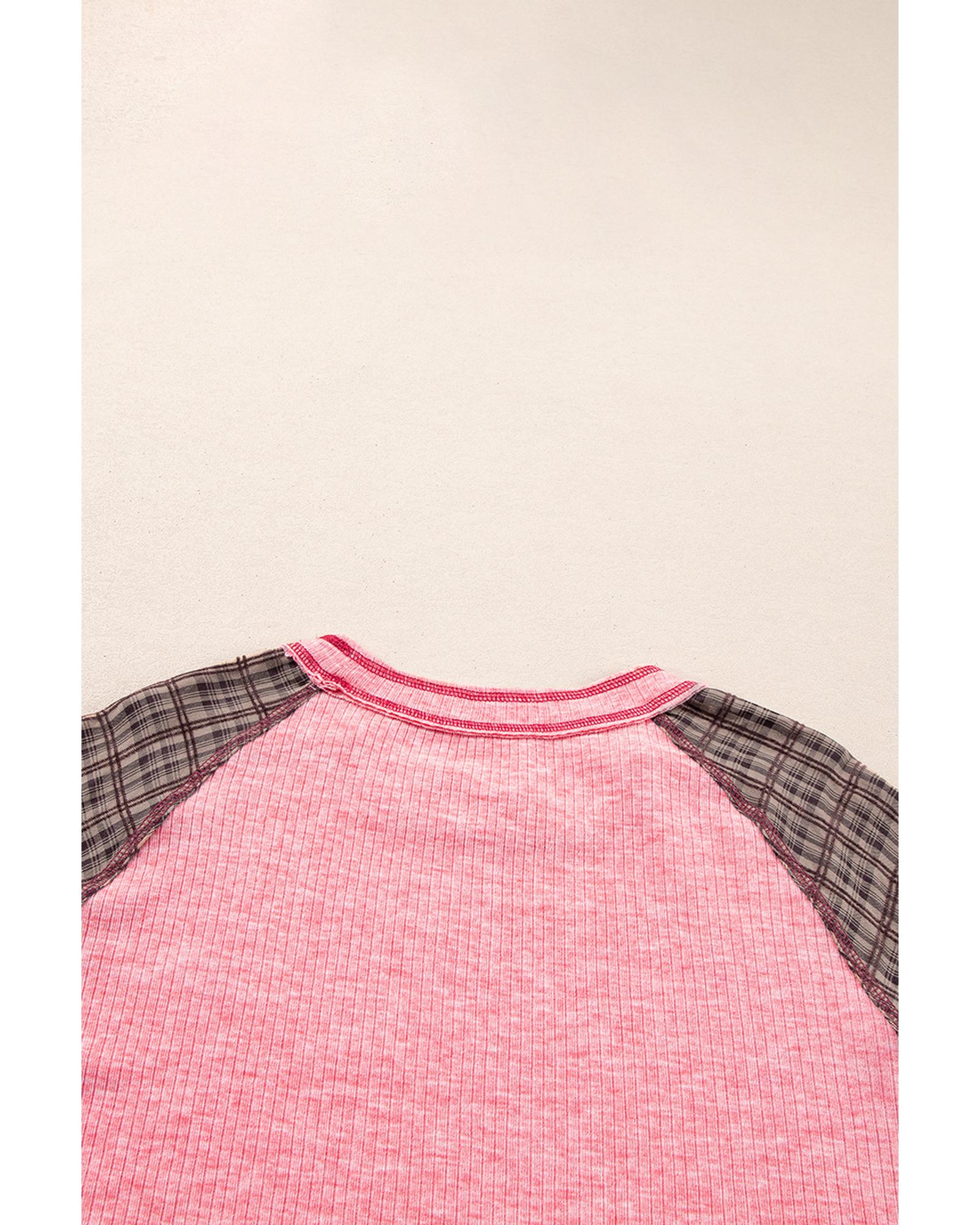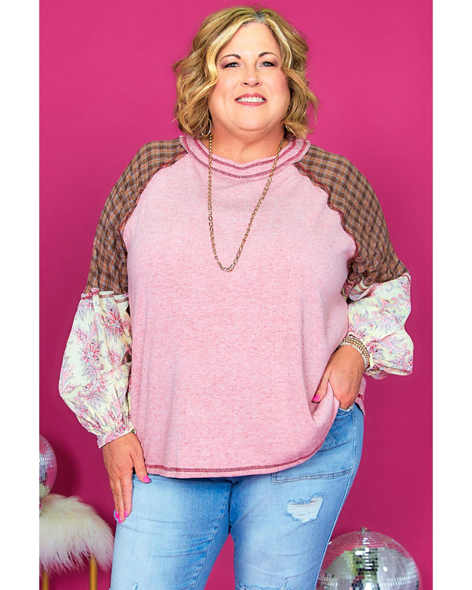 Pink Checkered Paisley Patchwork Raglan Sleeve Seamed Plus Size Top – 4X