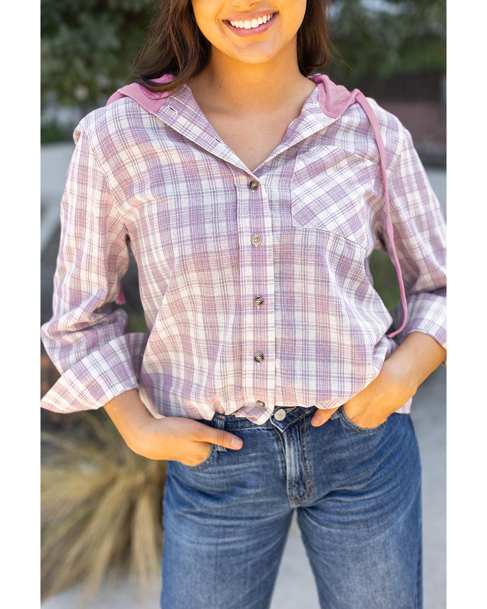 Pink Checkered Print Loose Fit Buttoned Hooded Shacket – S