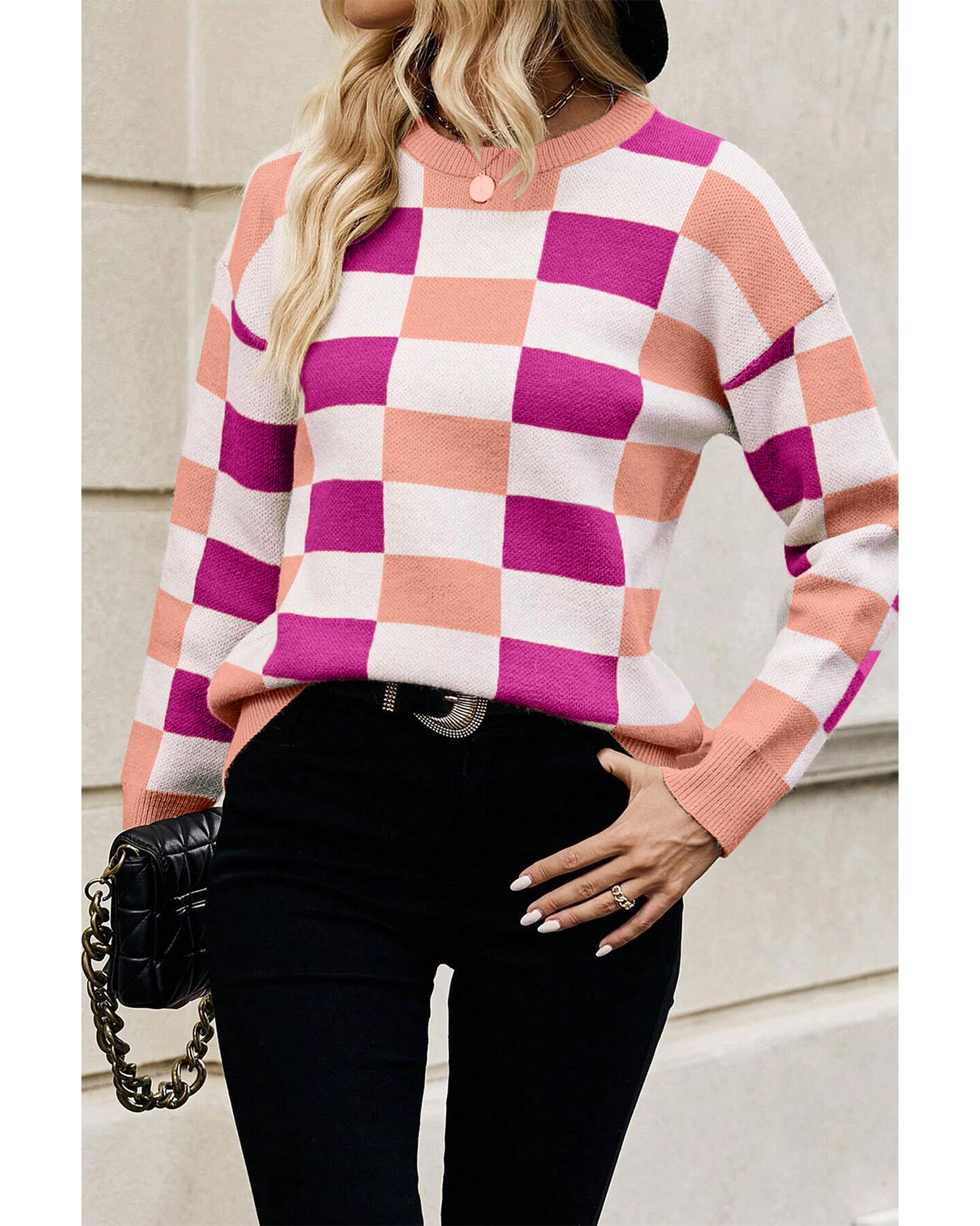 Pink Checkered Ribbed Edge O Neck Drop Shoulder Sweater – XL