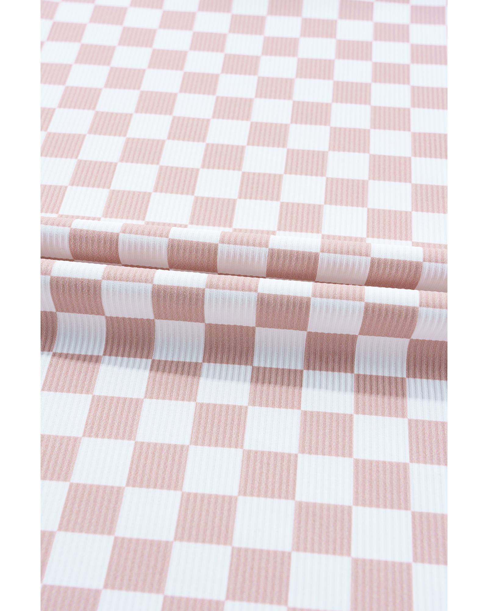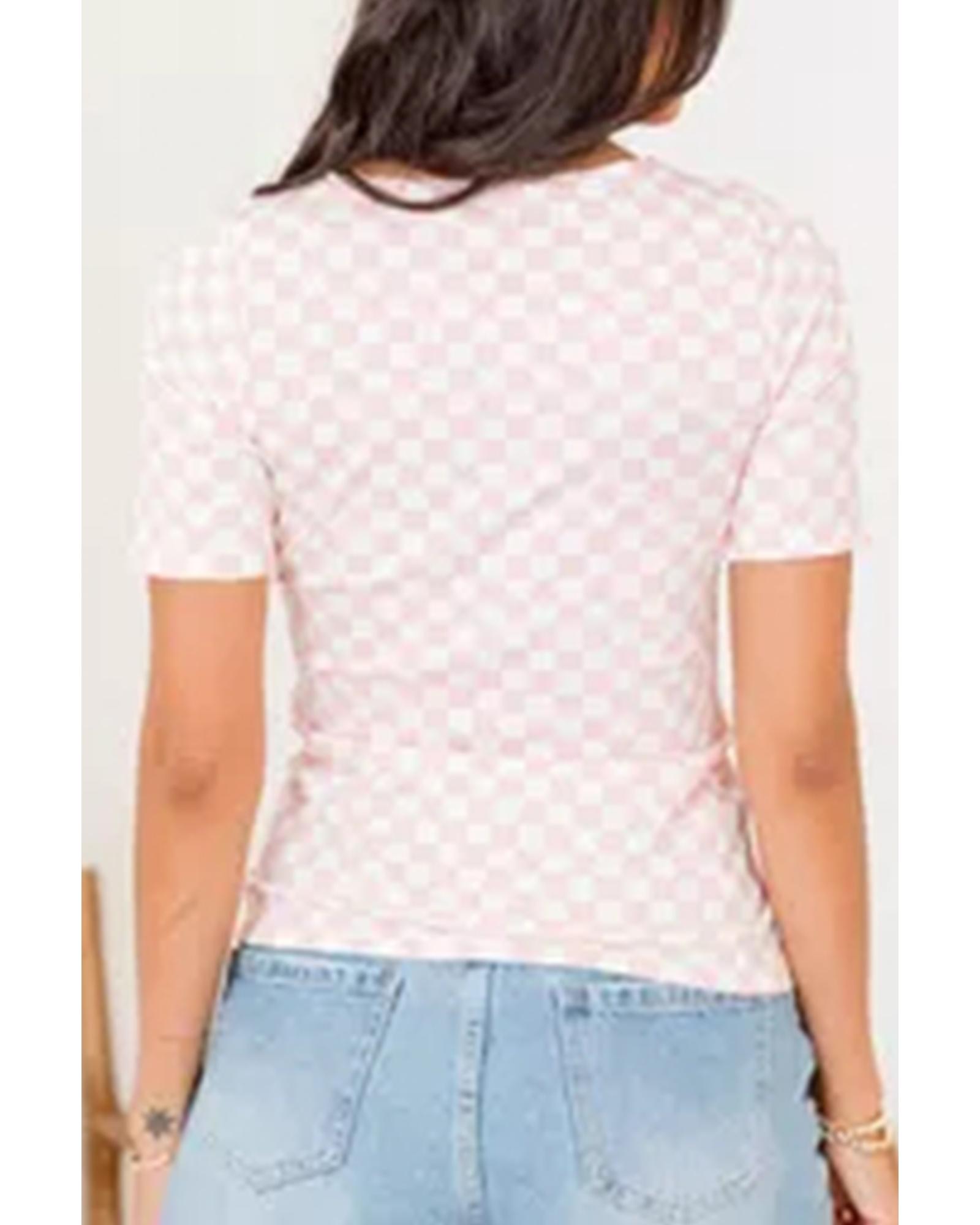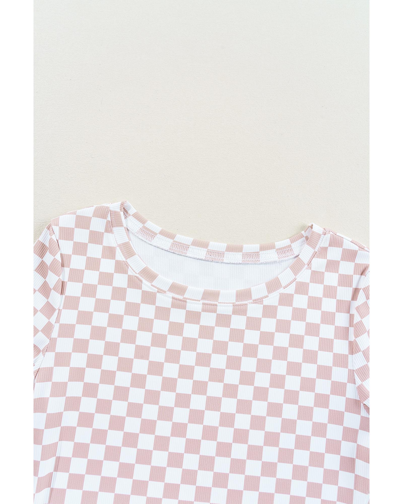 Pink Checkered Ribbed Slim Fit Crew Neck T Shirt – S