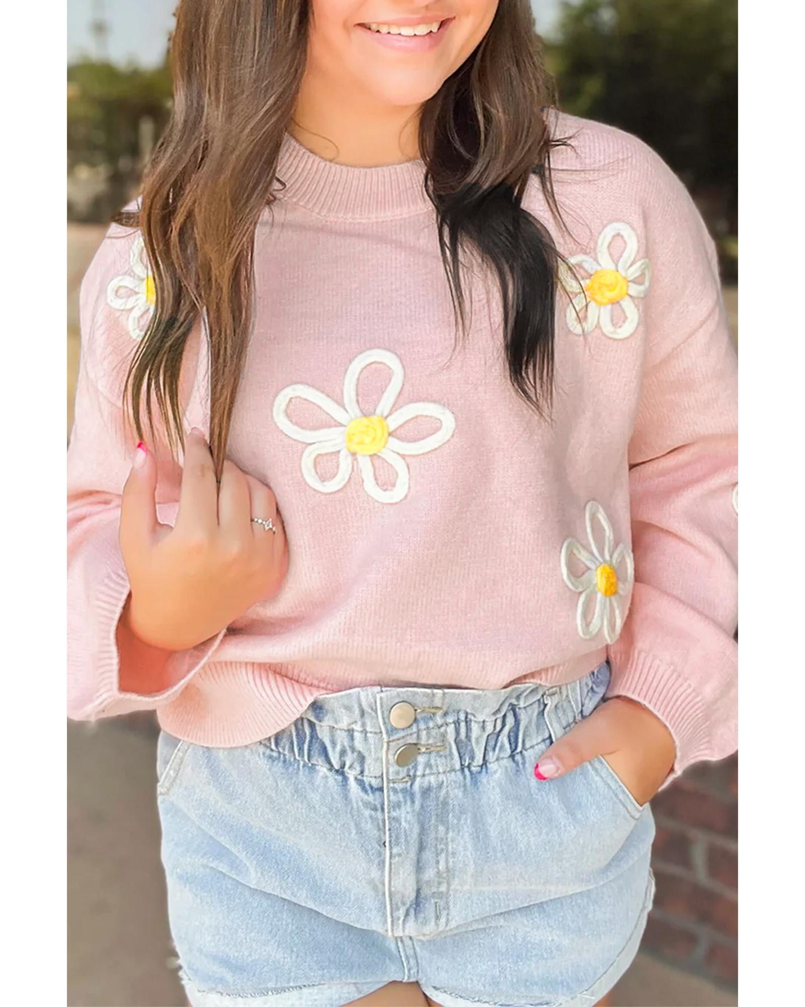 - Pink Chenille Daisy Stitching Crew Neck Sweater