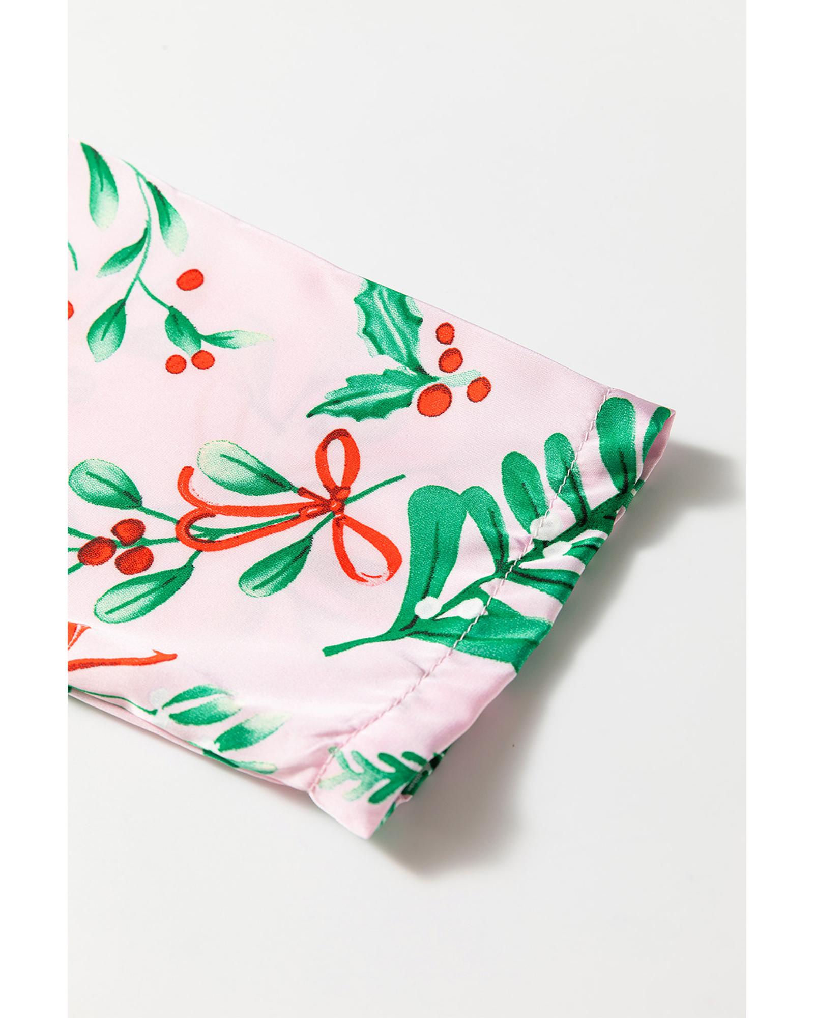 Pink Christmas Berries Plant Print Satin Long Sleeve Pajama Set – S