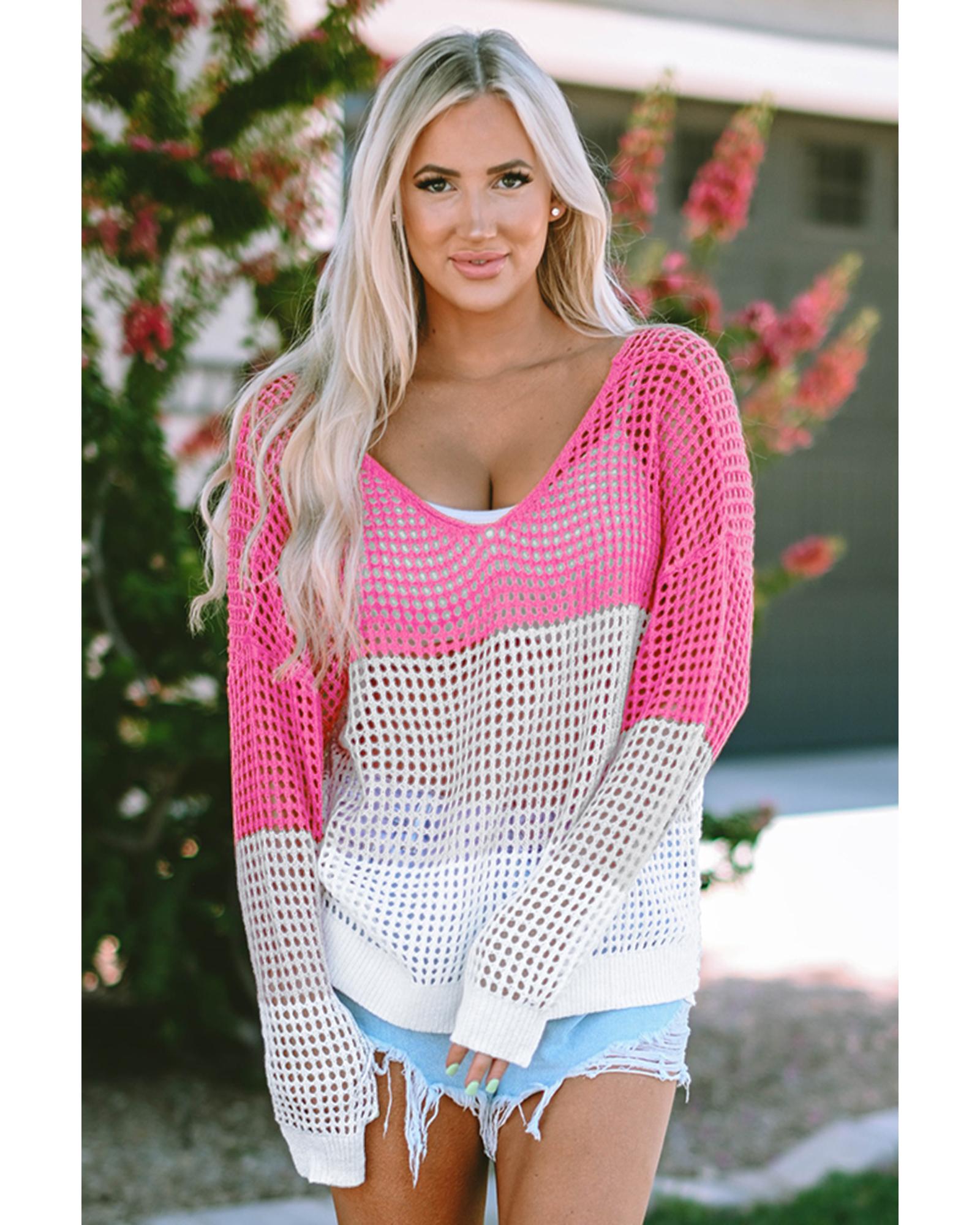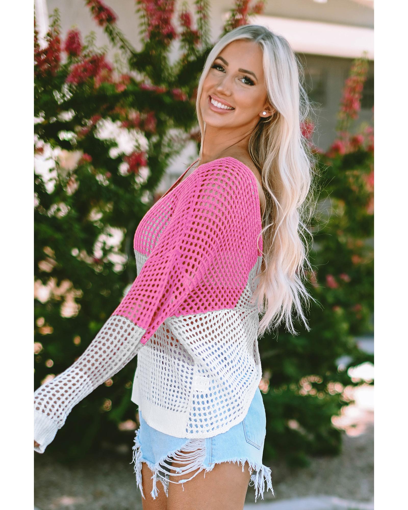 Pink Color Block Eyelet Long Sleeve Twisted Back Knit Top – XL