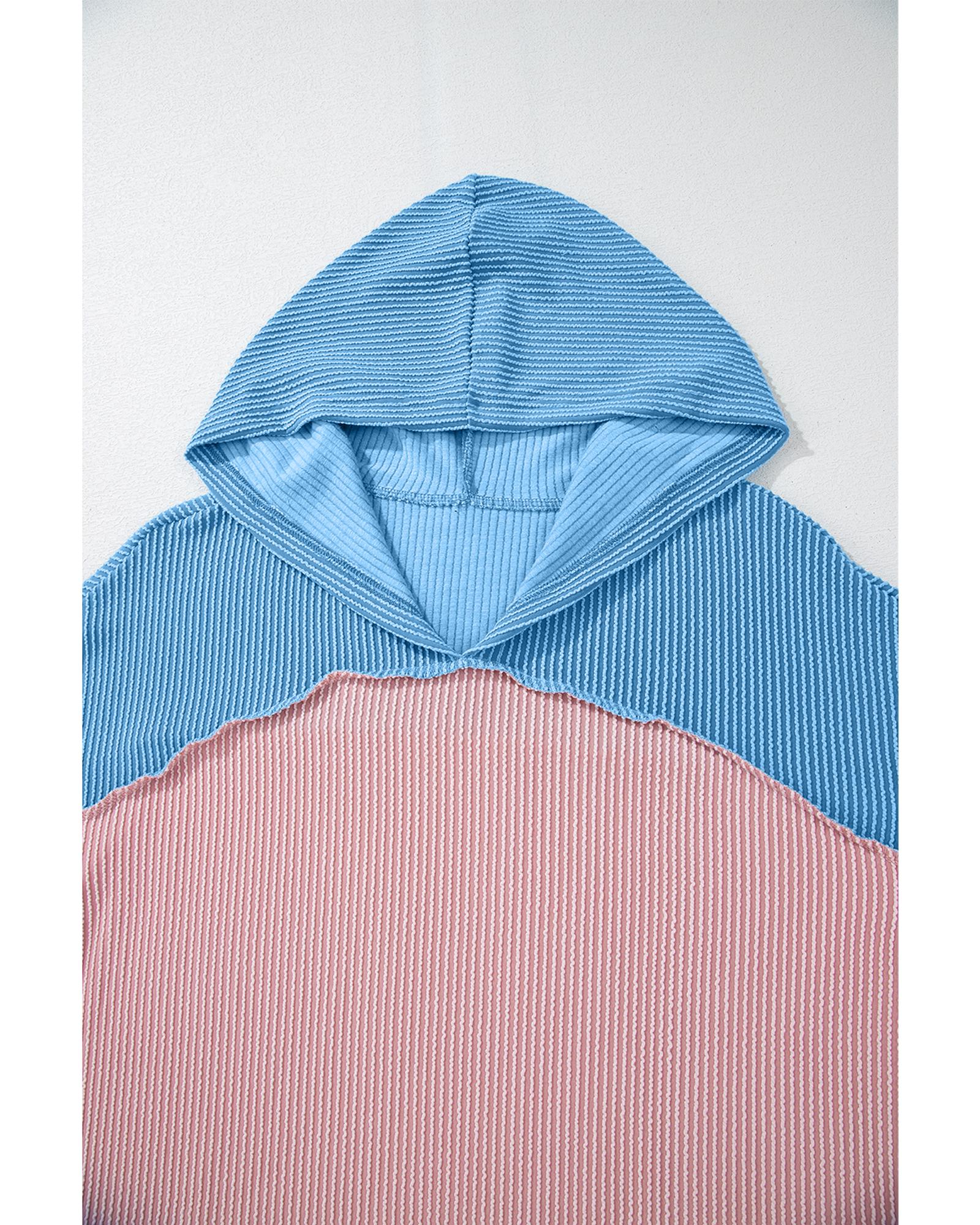 - Pink Color Block Patchwork Corded Knit Loose Fit Hooded Blouse