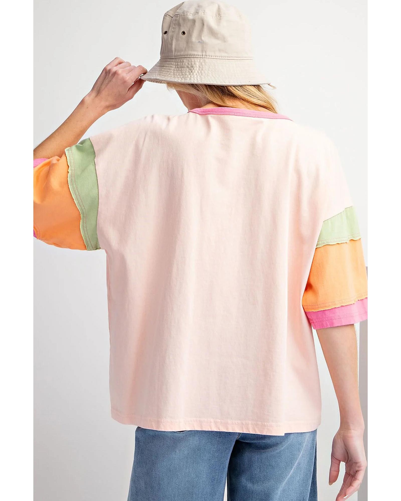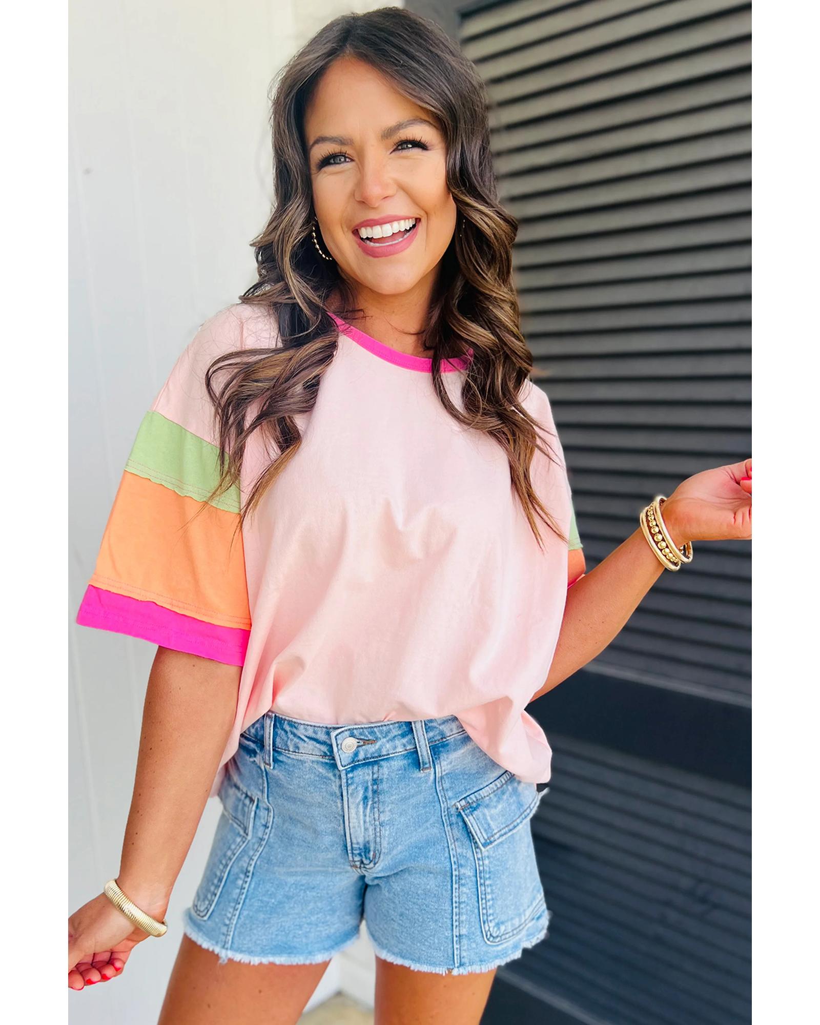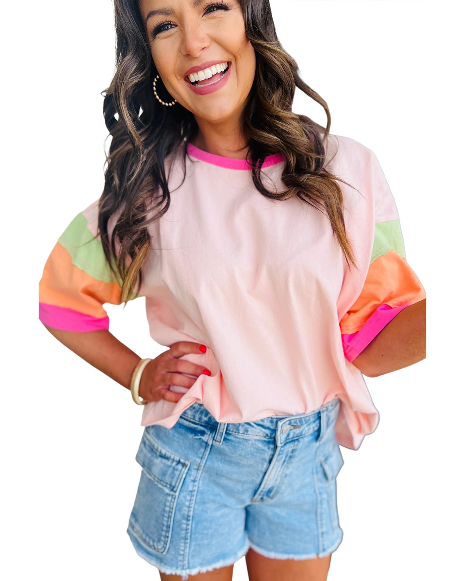Pink Color Block Stitching Sleeve Round Neck Oversize Top – S