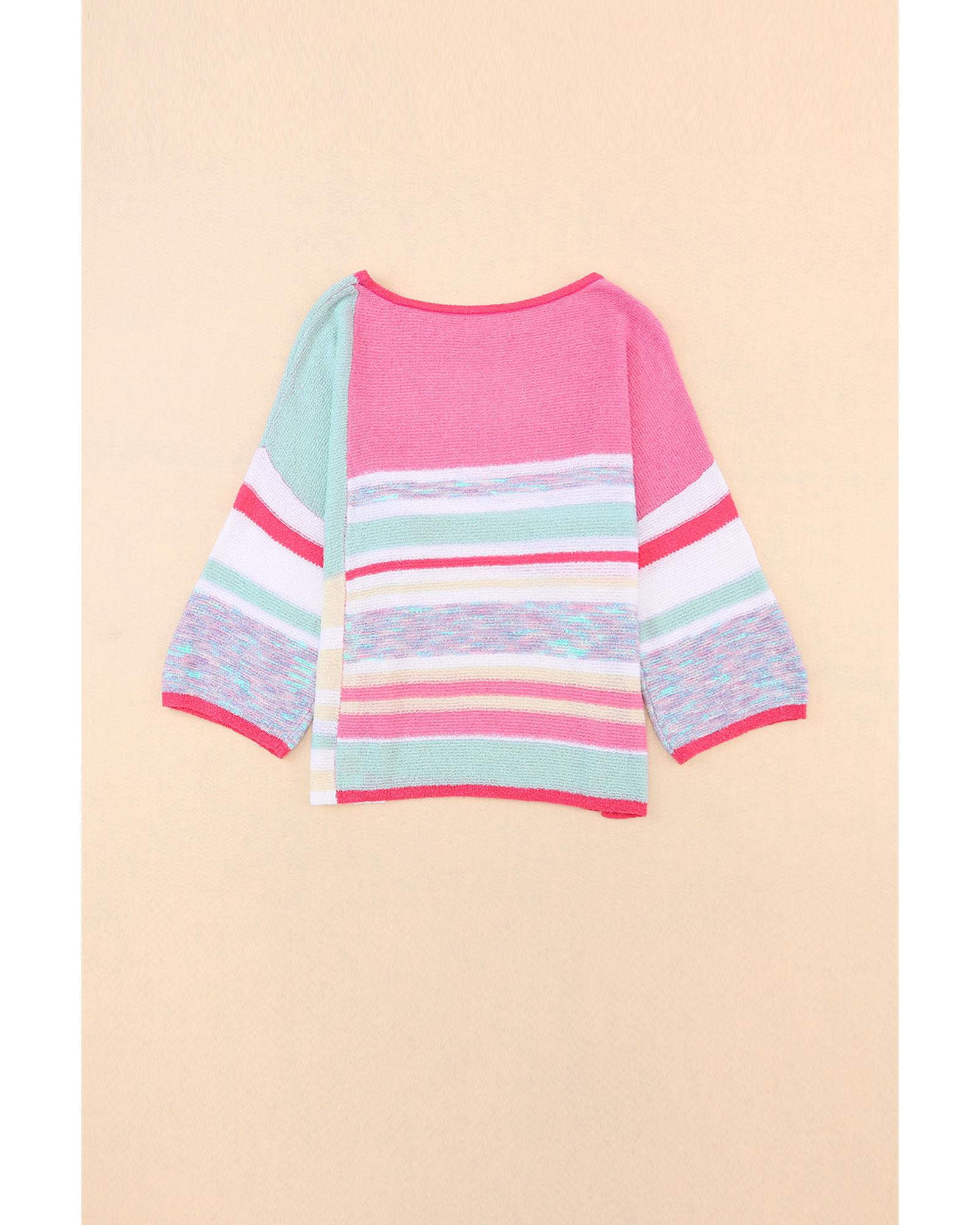 Pink Color Block Striped Three-Quarter Sleeve Knitted Top – XL