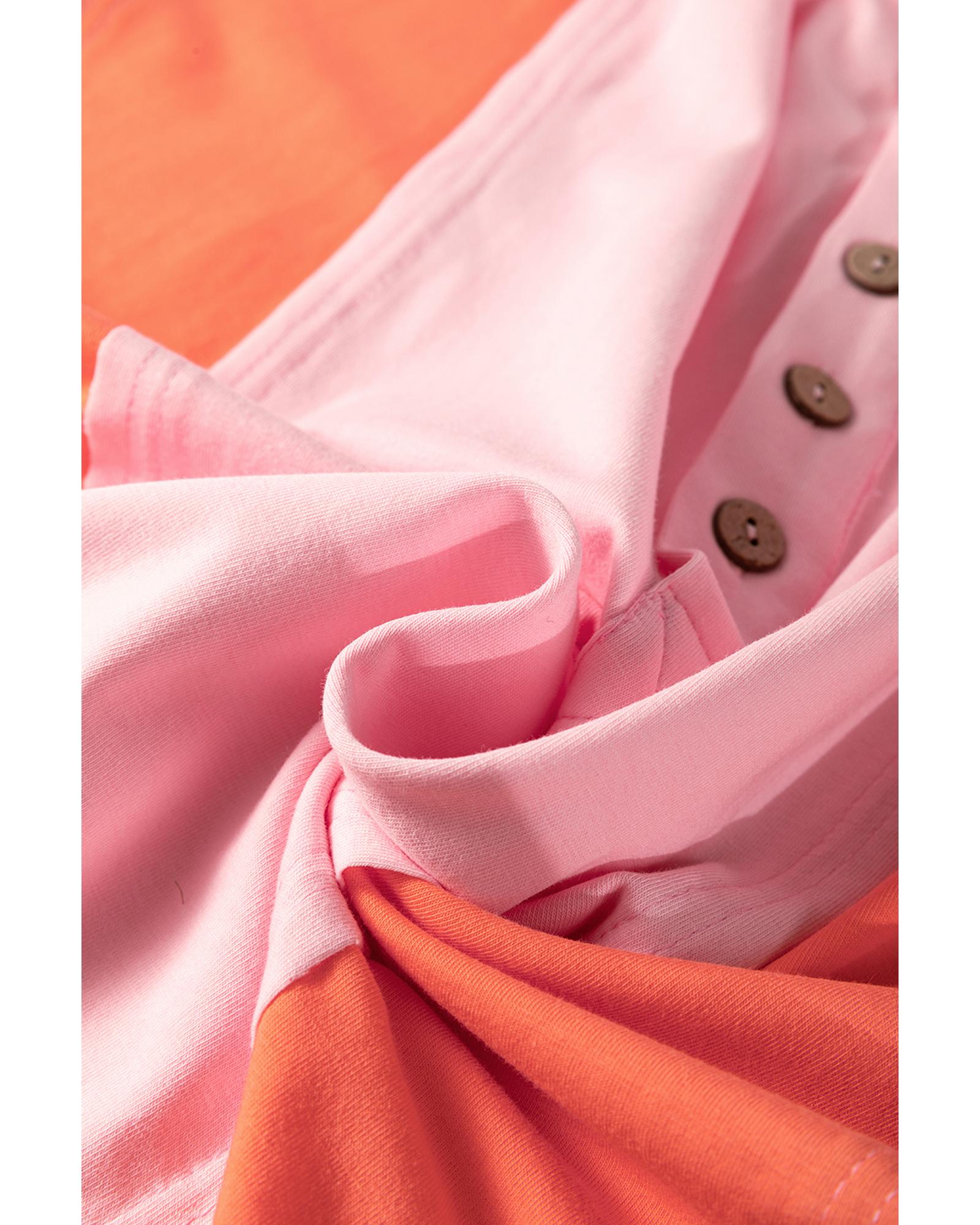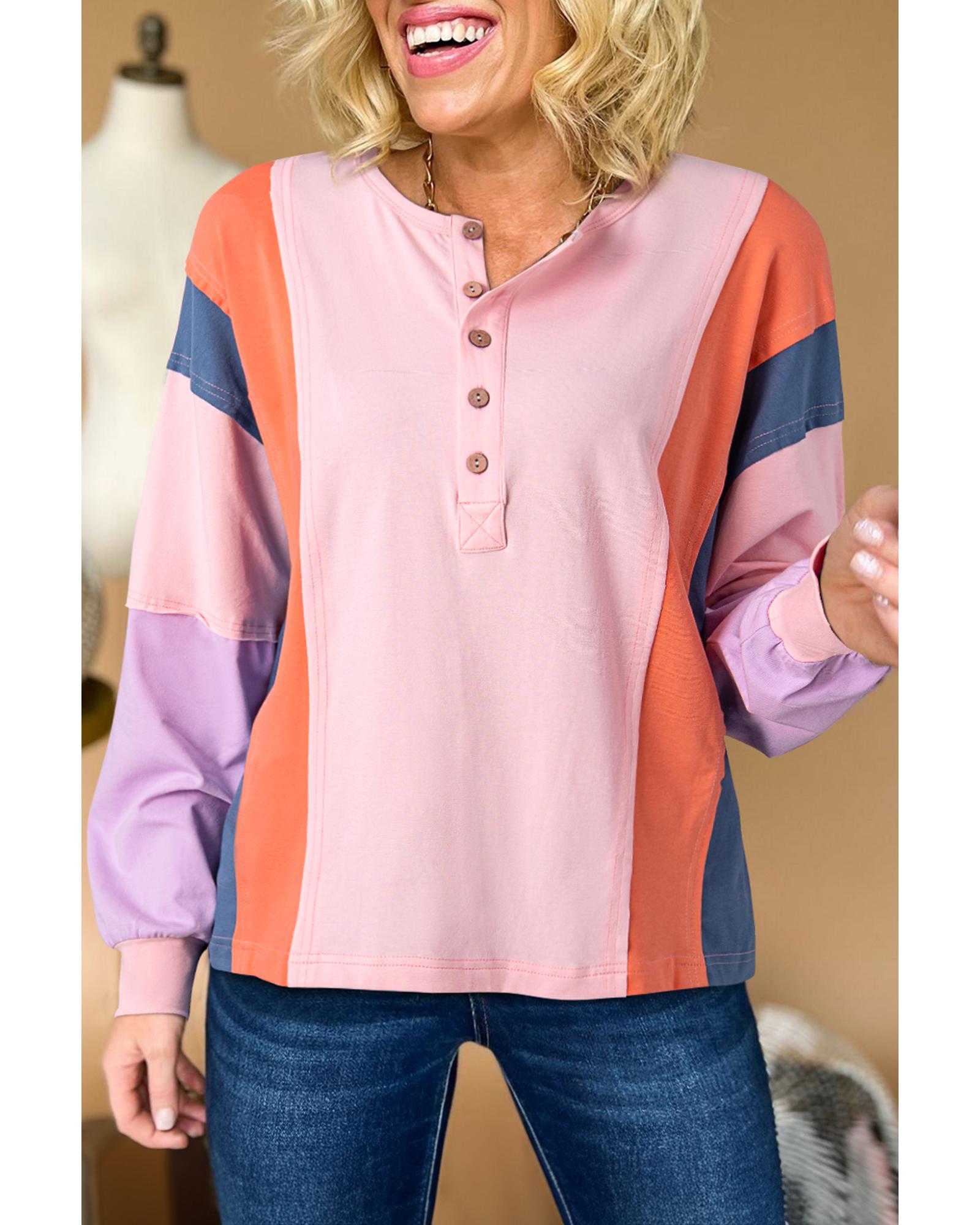 Pink Colorblock Long Sleeve Buttons Henley Top – S