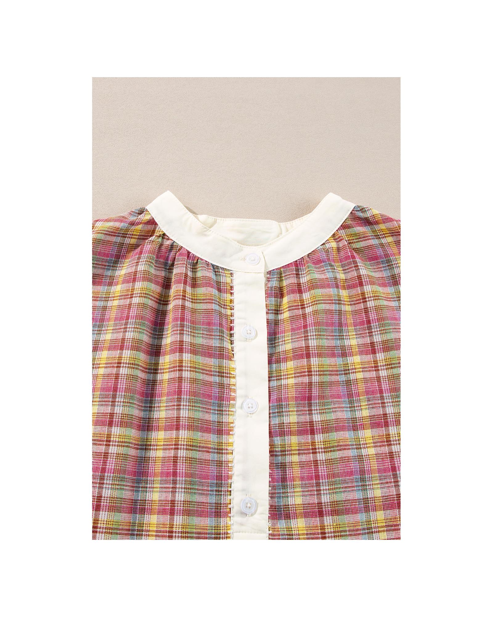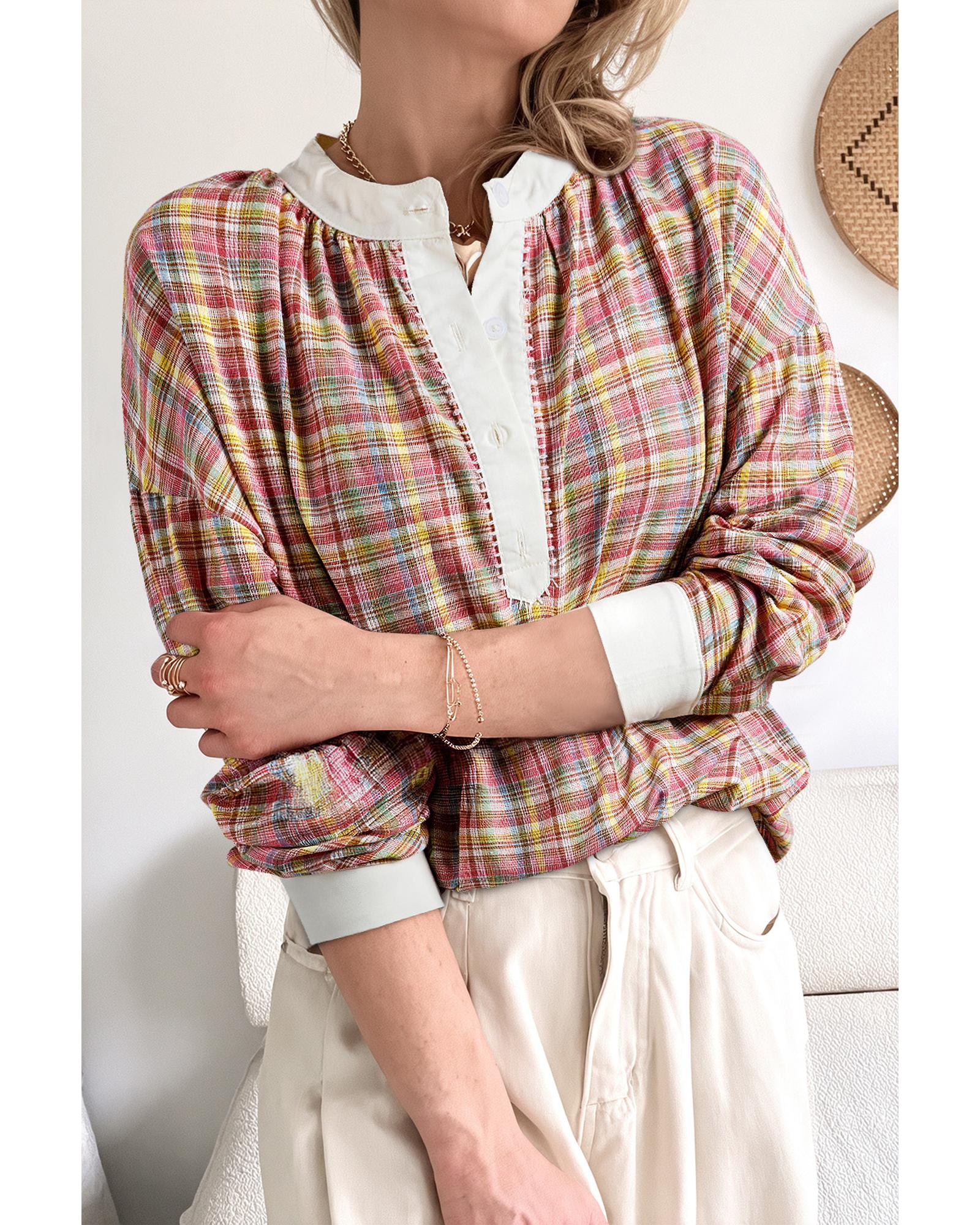 Pink Colorblock Plaid Patchwork Henley Blouse – L