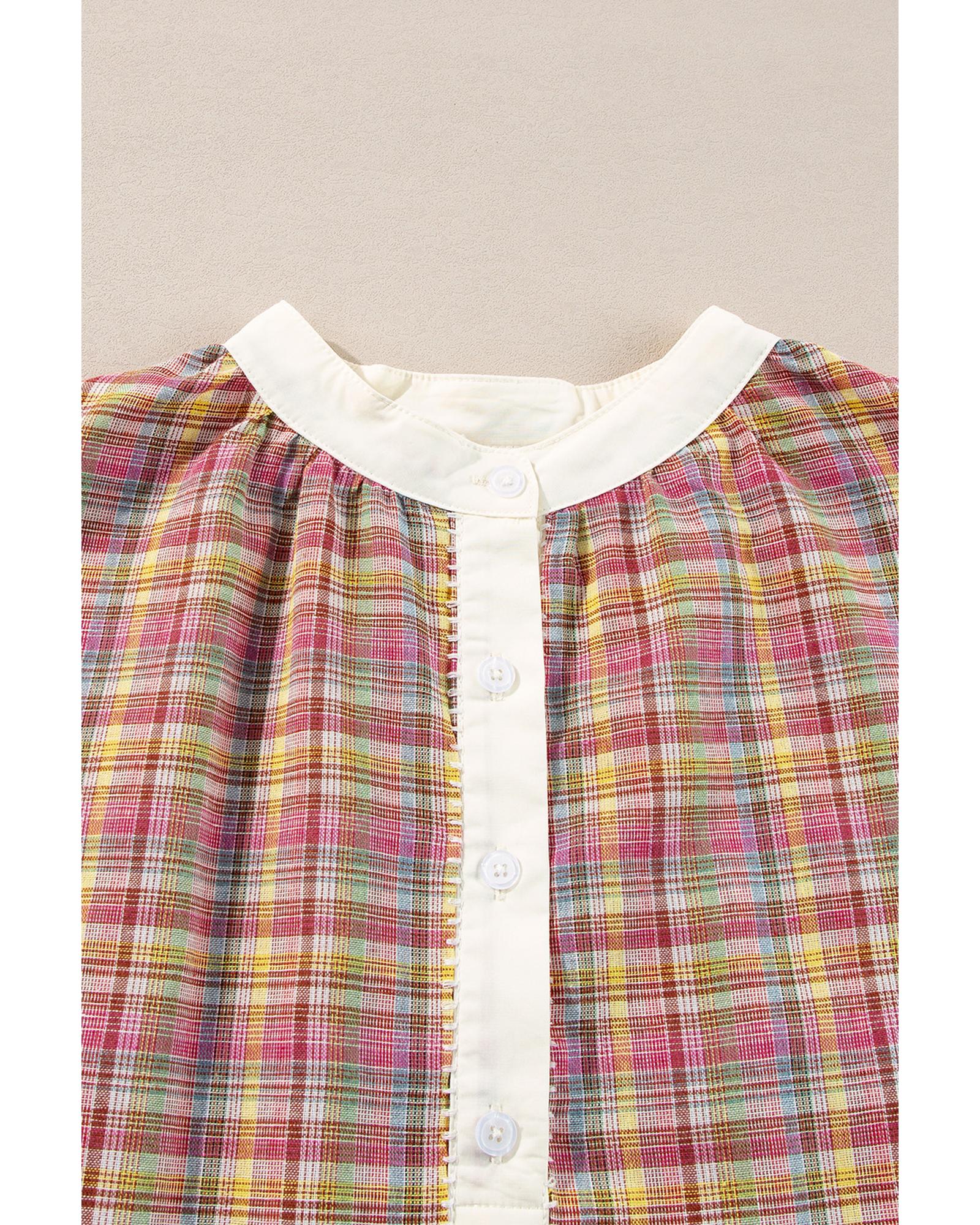 Pink Colorblock Plaid Patchwork Henley Blouse – M