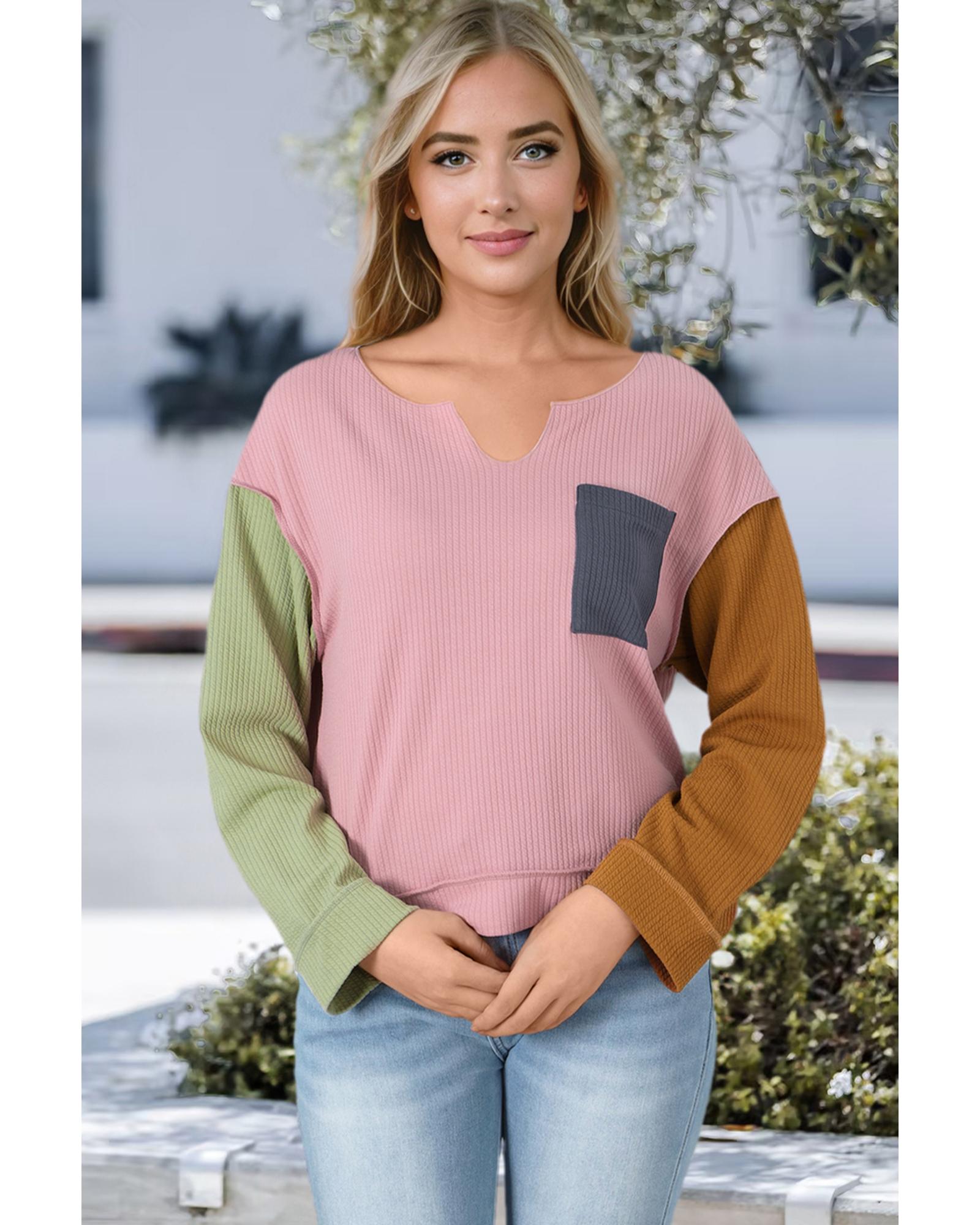 Pink Colorblock Rib Textured Loose Long Sleeve Top – M