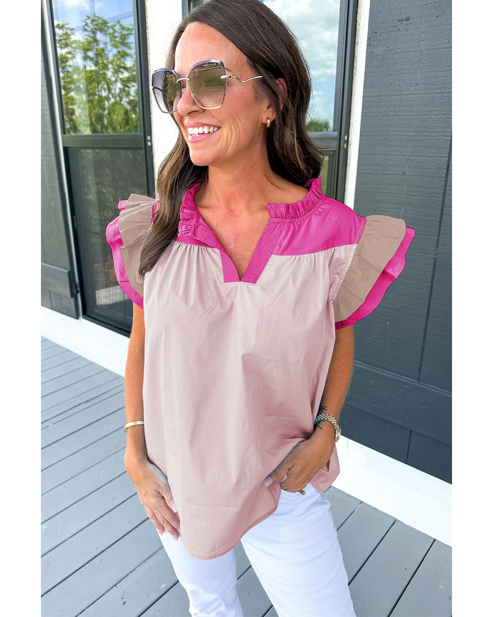 • Pink Colorblock Ruffled Sleeve Frill V Neck Blouse