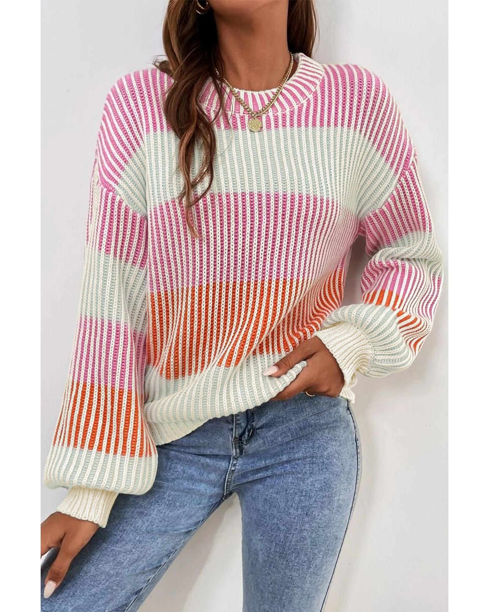 - Pink Colorblock Textured Knit Bubble Sleeve Sweater