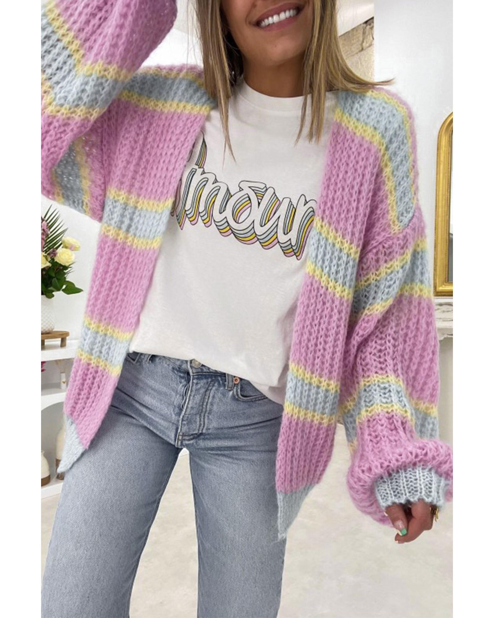 Pink Contrast Striped Open Front Cable Cardigan – L