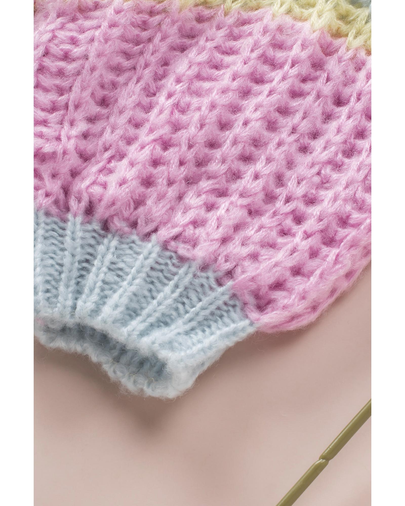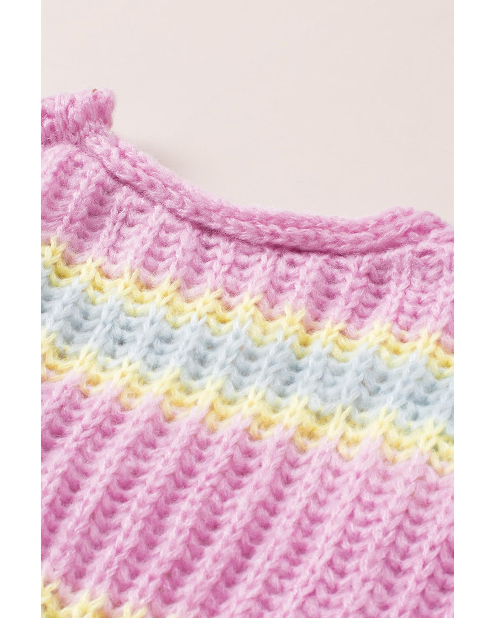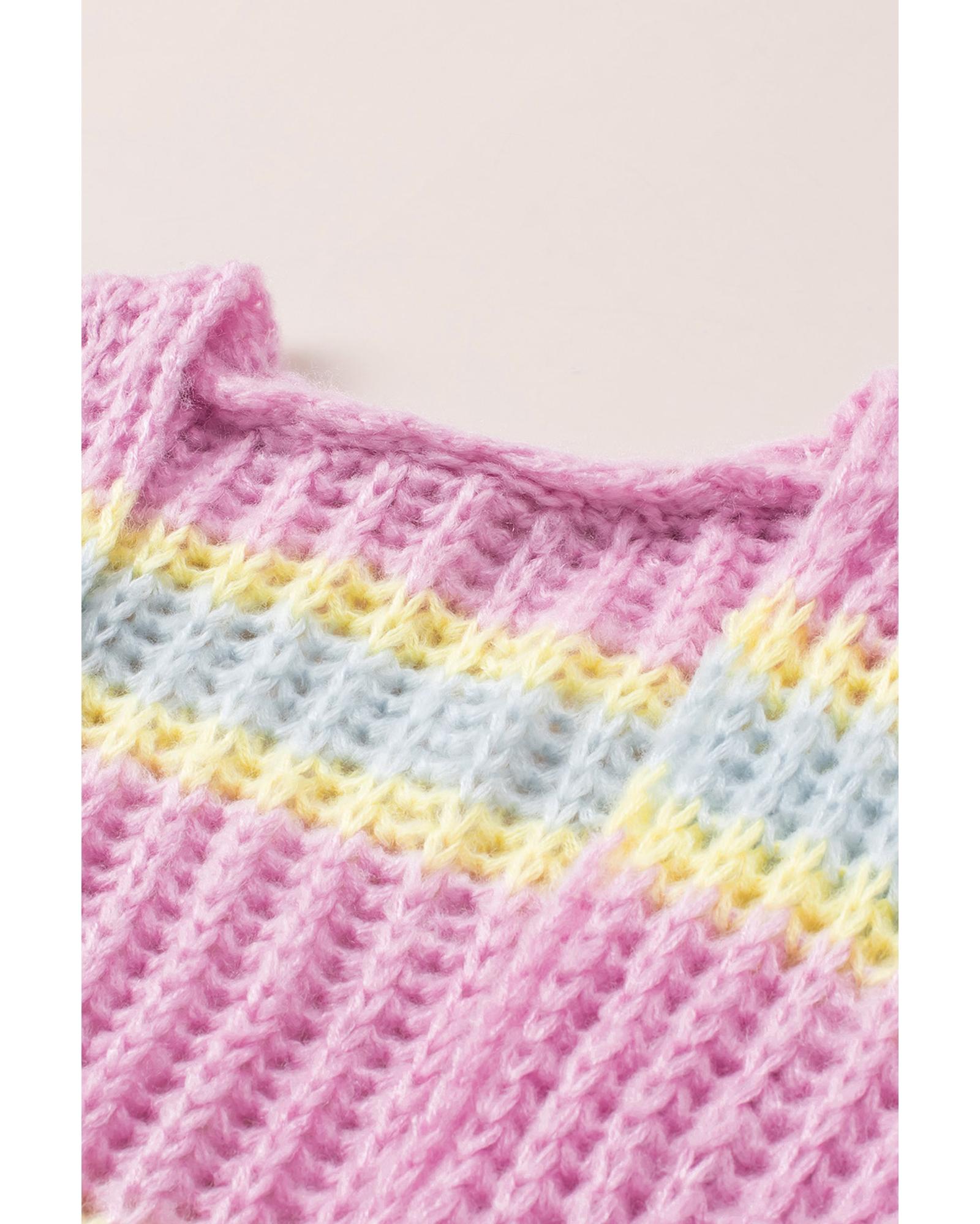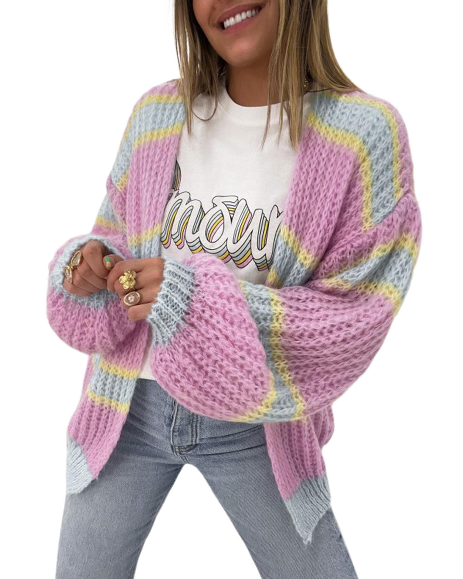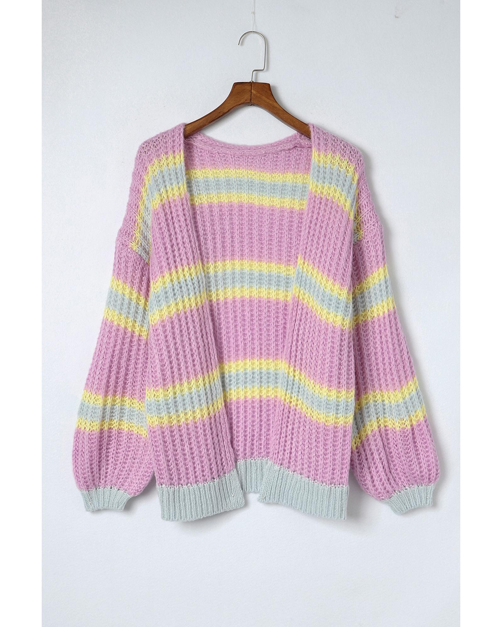 Pink Contrast Striped Open Front Cable Cardigan – M