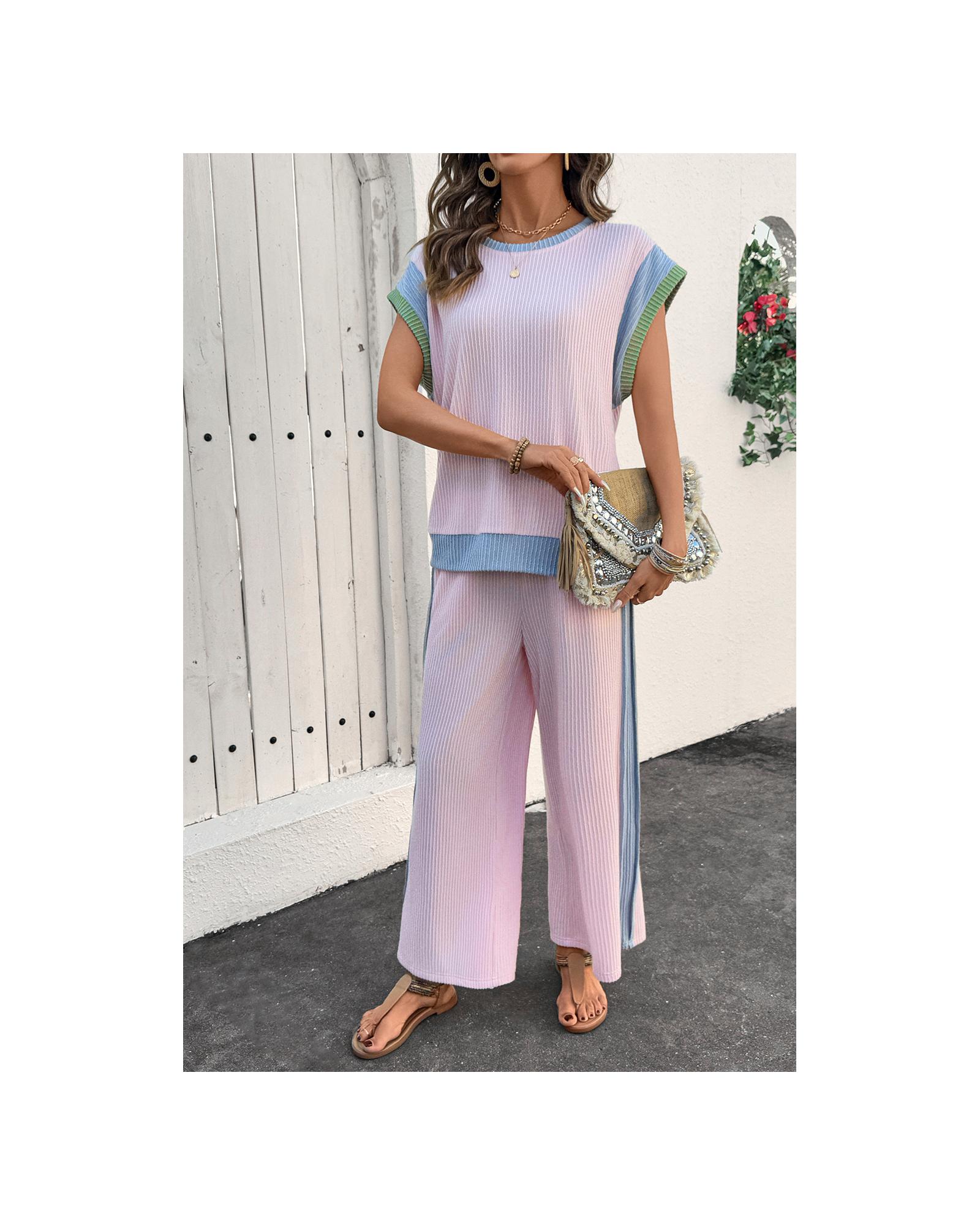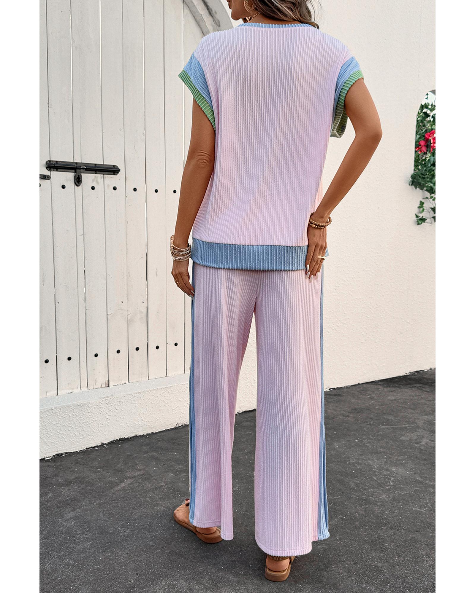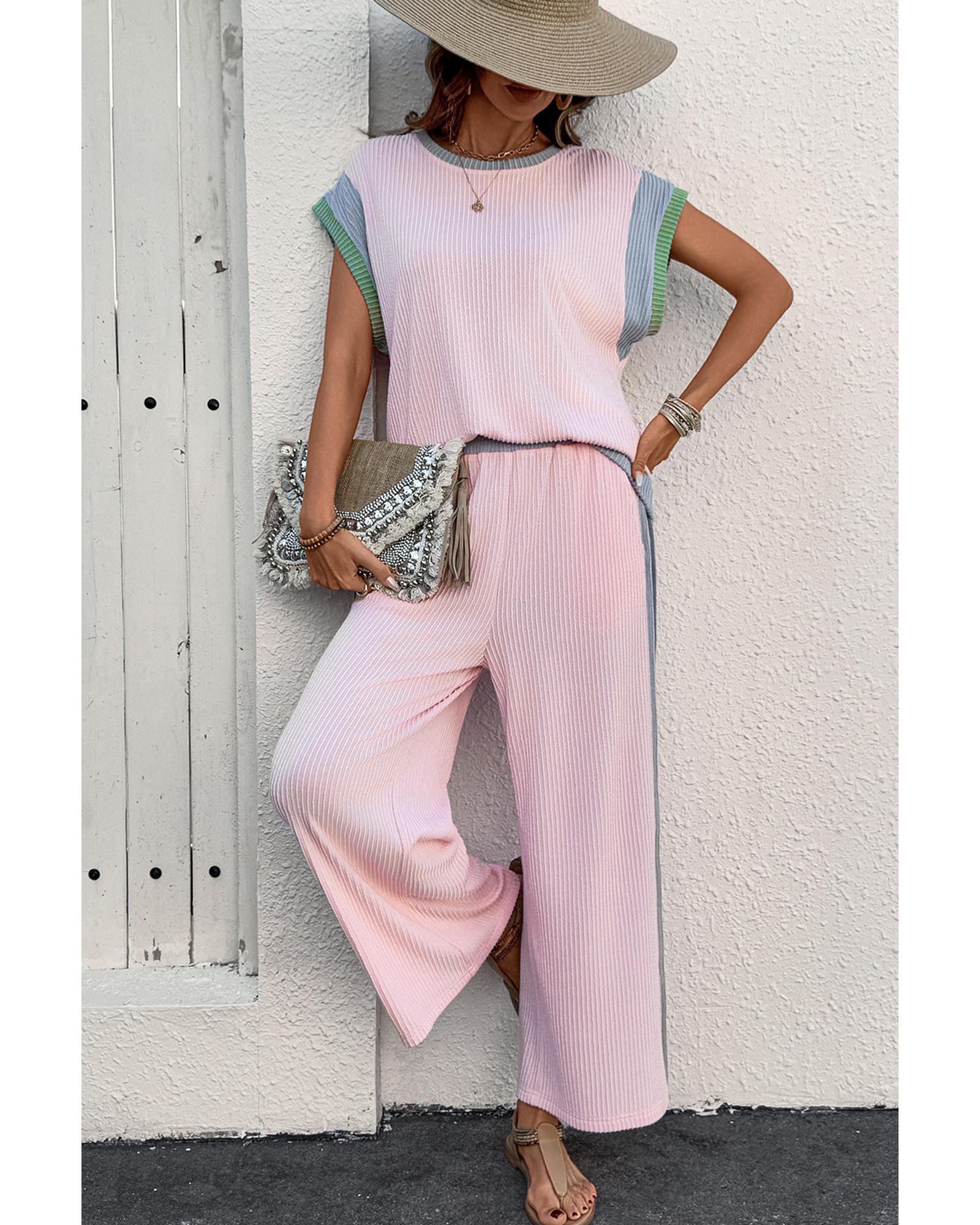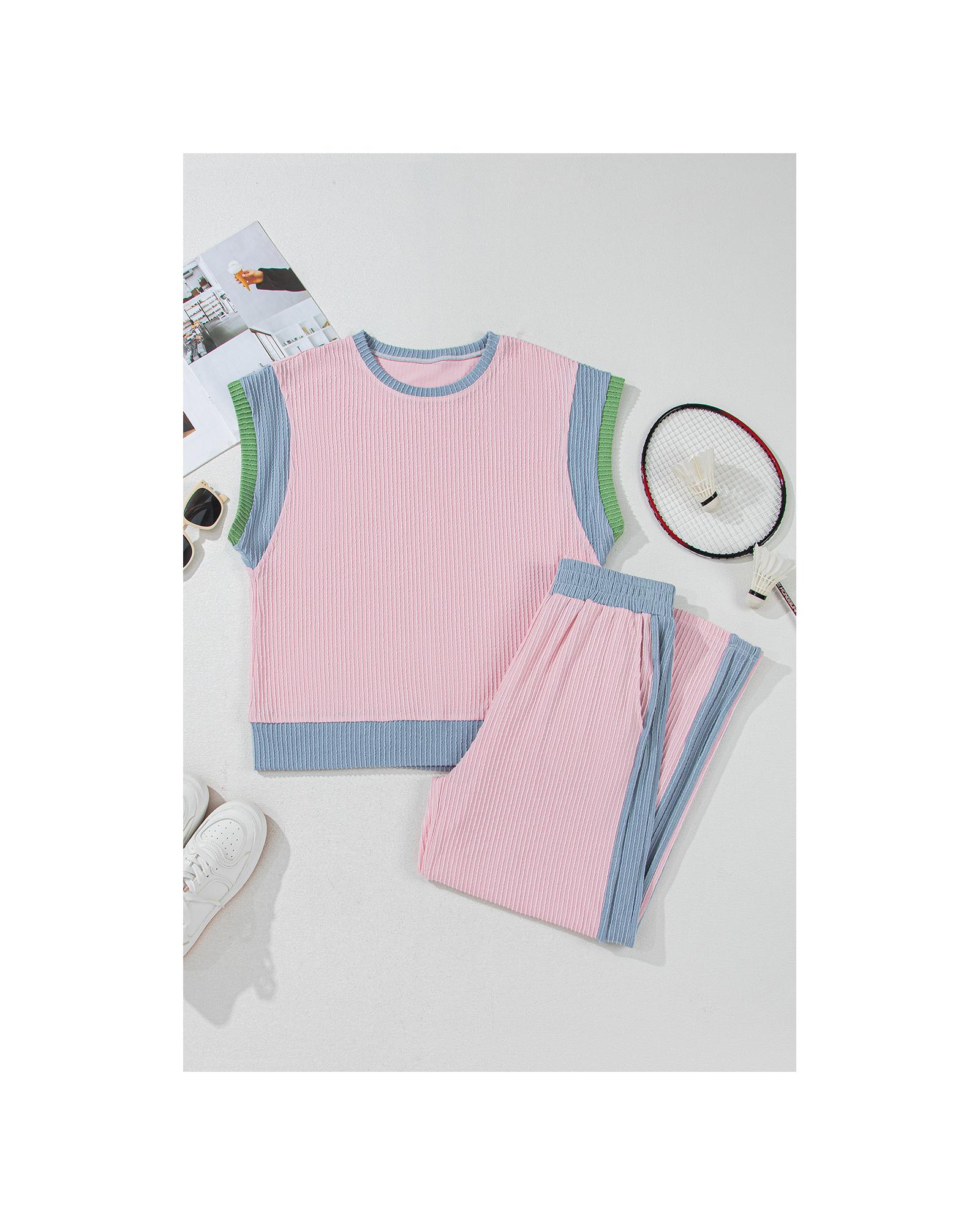 Pink Corded Colorblock Patchwork Short Sleeve Top and Loose Pants Set – M